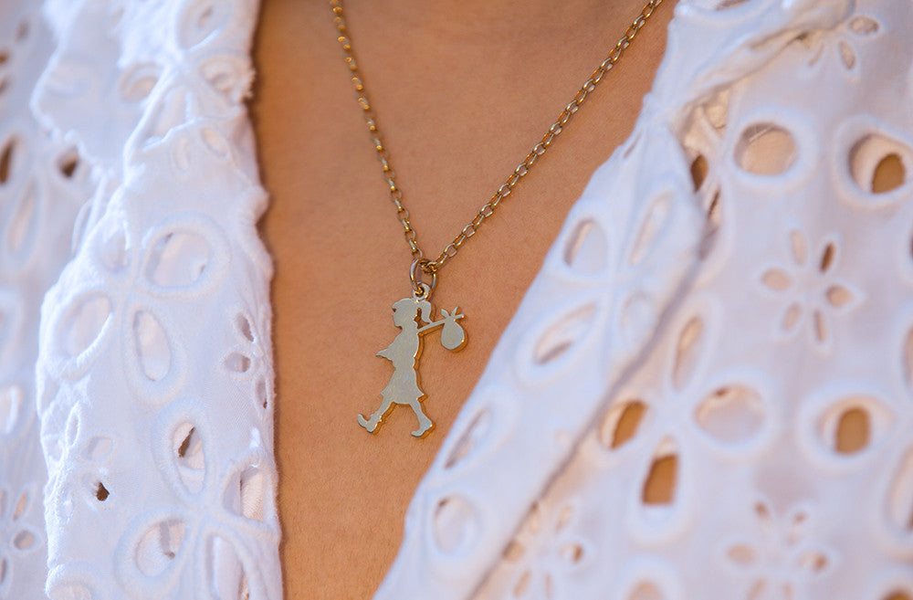 Instantly distinguishable with international appeal, the adorable Runaway girl is available as a necklace, earrings, pin or ring. Choose from sterling silver or 9ct yellow gold.
