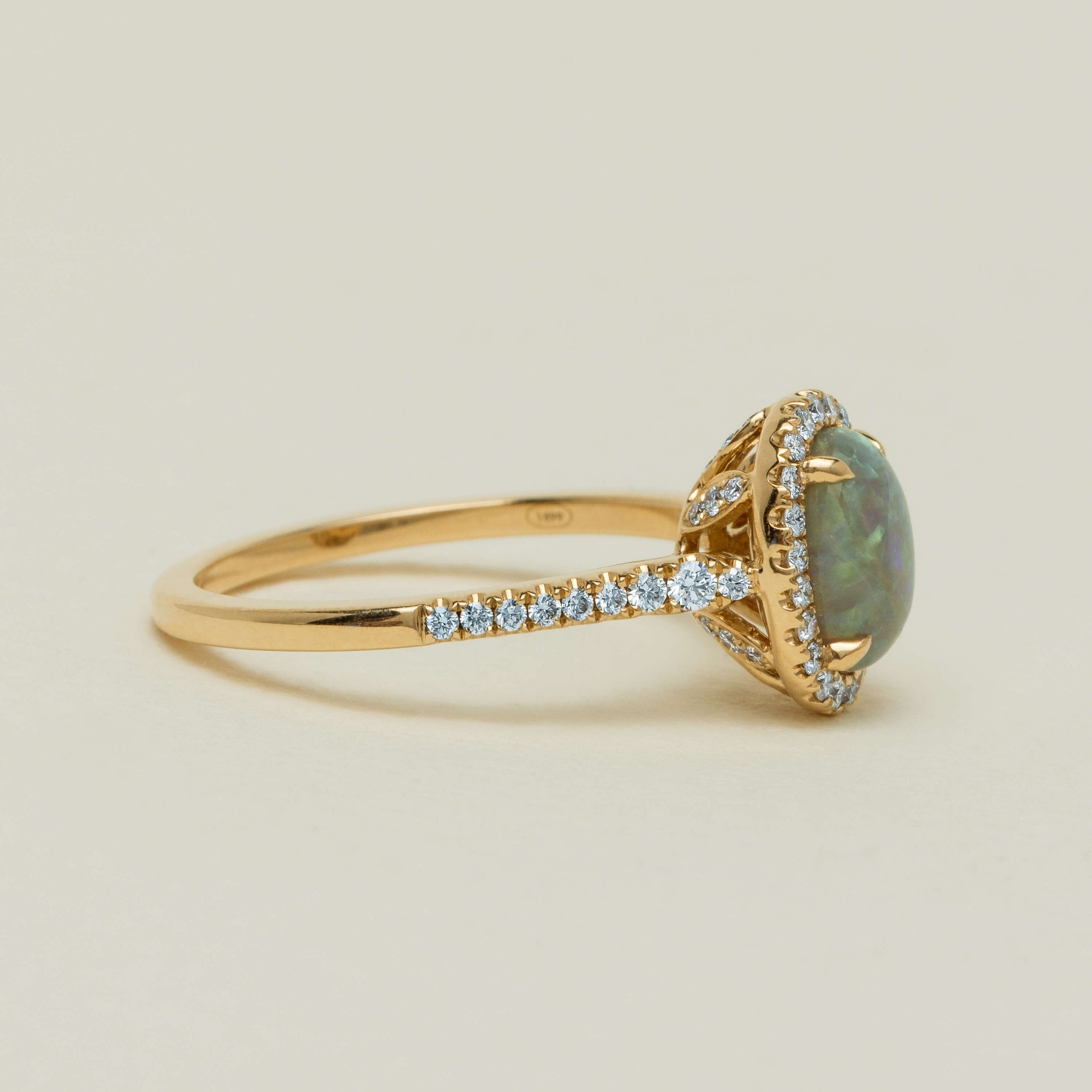 Encircling the opal, a radiant halo of round brilliant cut diamonds enhances the gemstone’s natural mystique, amplifying the ring’s luminous presence. Set in gleaming 18ct yellow gold, the band is meticulously finished to provide a refined backdrop for the center stone’s bold spectrum.