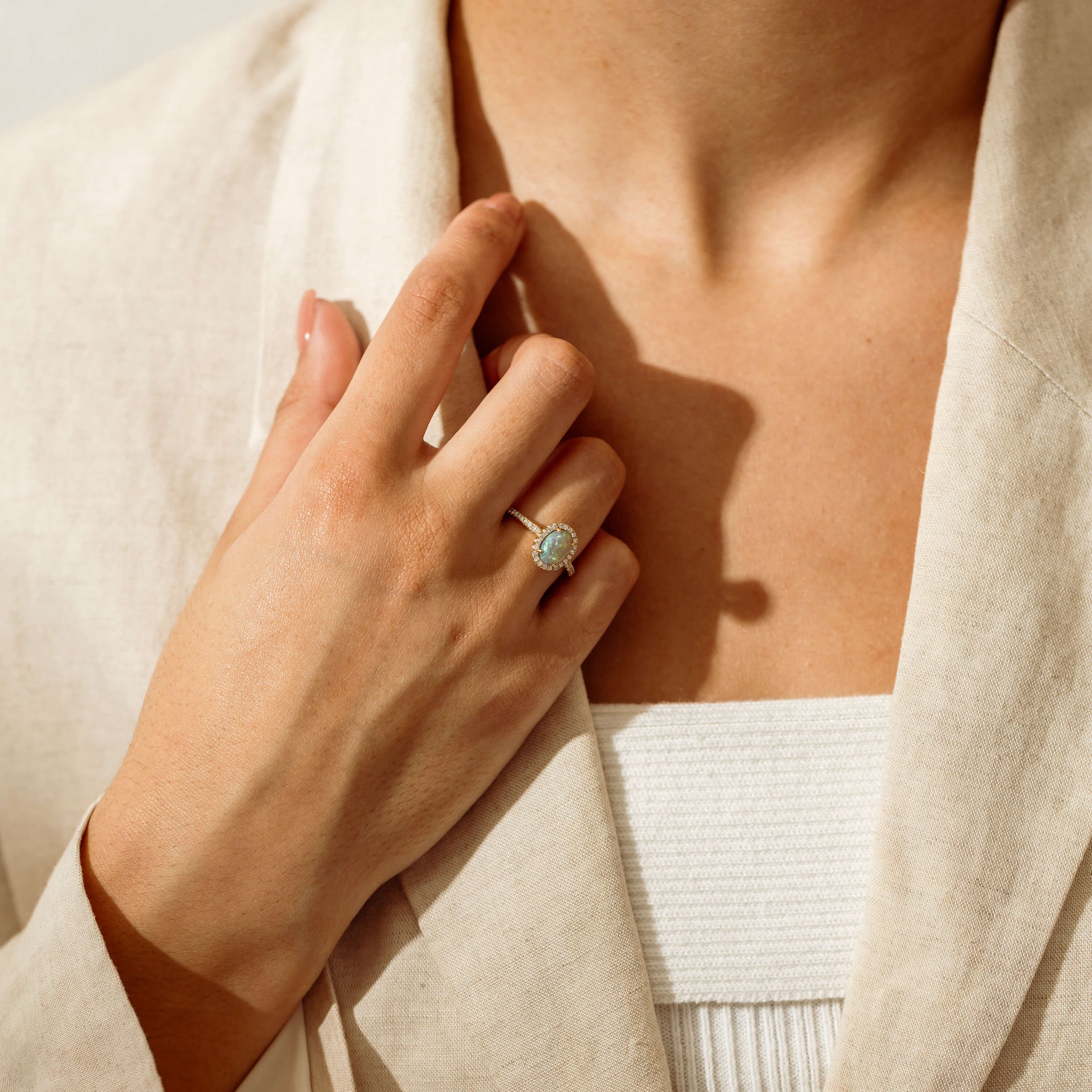 At its heart sits a mesmerizing 1.25ct oval cabochon opal, famed for its extraordinary play of colour. Flashes of greens and blues ignite across the opal’s surface, creating a dynamic and vibrant visual effect with every movement.