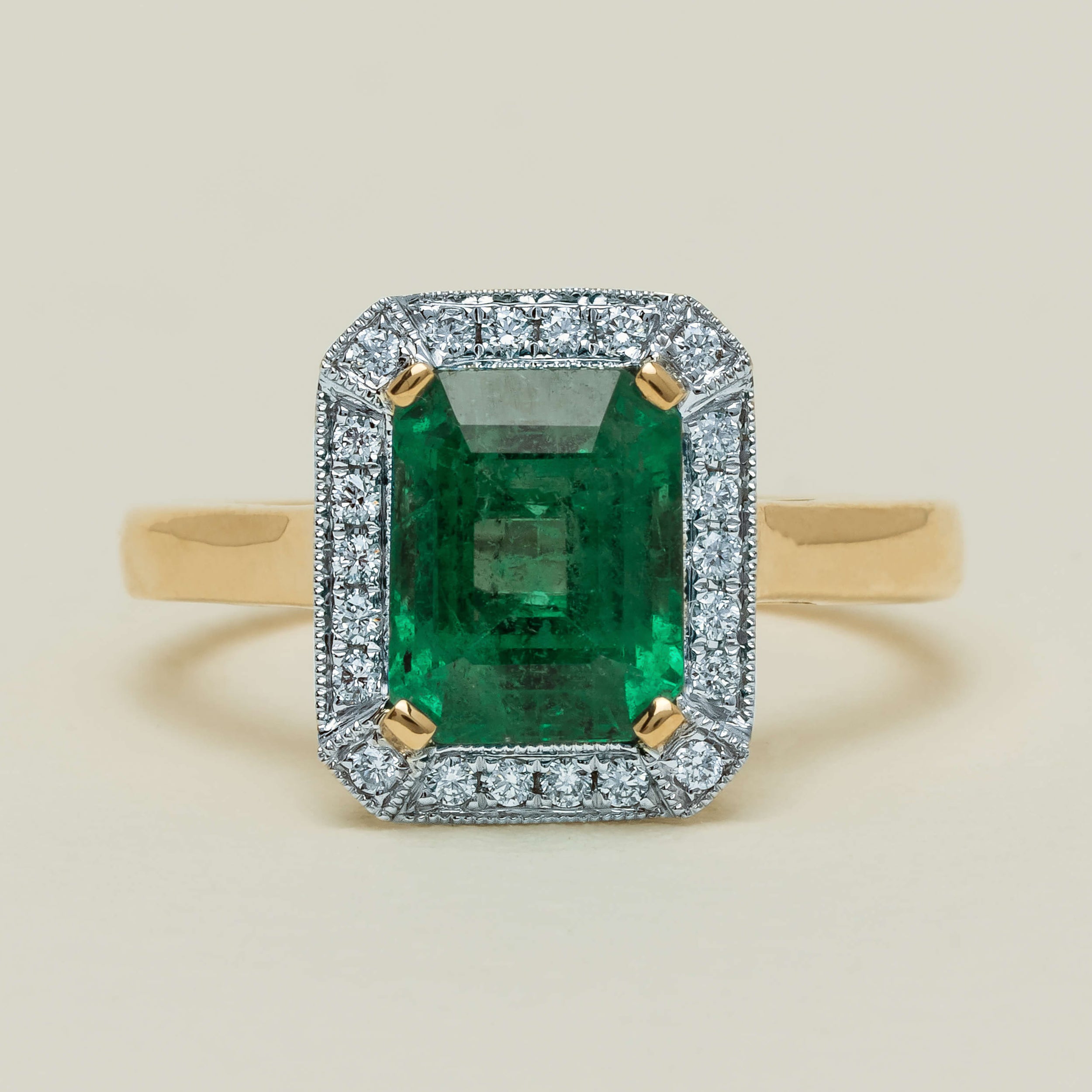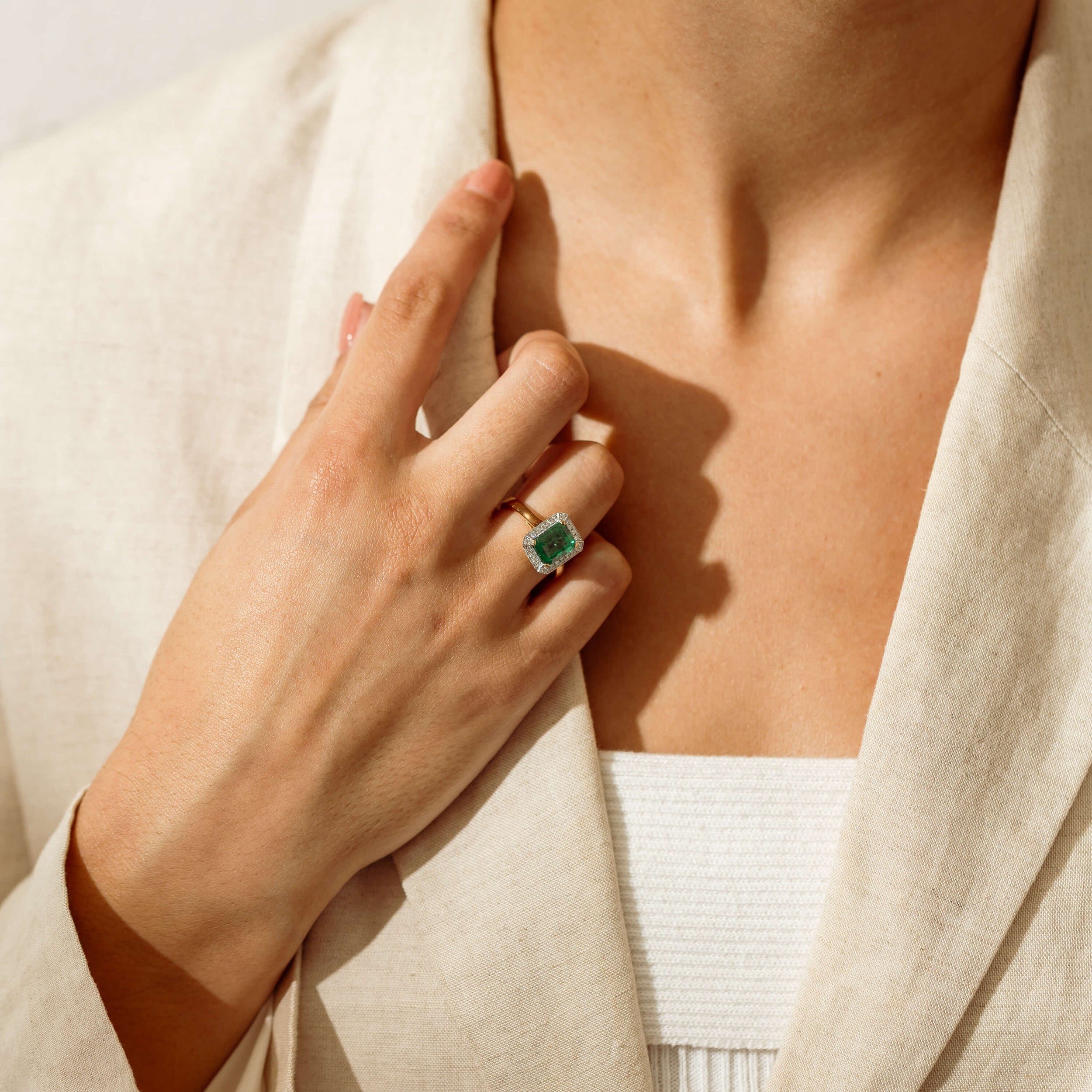 A shimmering halo of twenty-two round brilliant cut diamonds gracefully surrounds the centre stone, adding a luminous frame of sparkle and sophistication. Elegant, timeless, and unforgettable, this emerald and diamond Empire ring is a true statement of enduring beauty and grandeur.