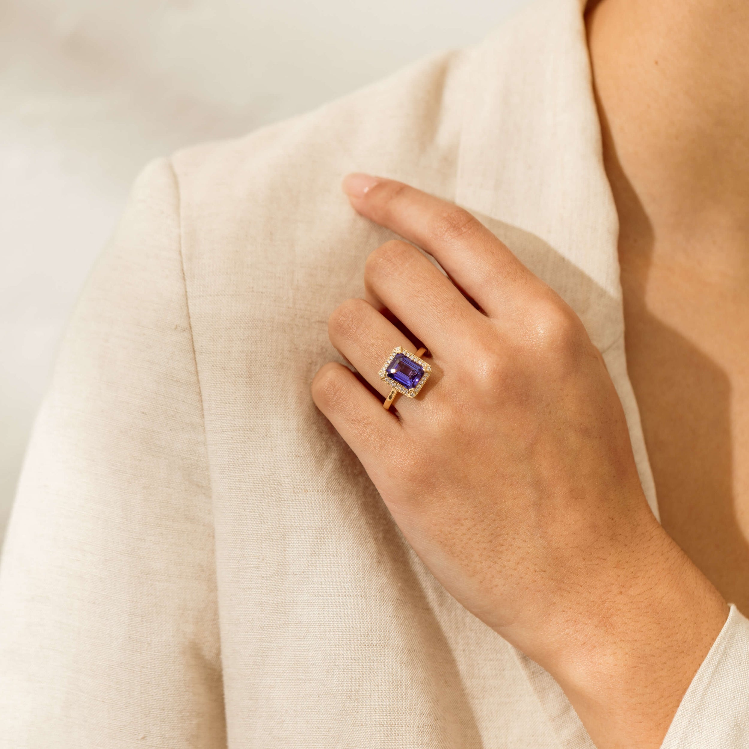 Regal and captivating, this Empire ring is a magnificent celebration of colour and craftsmanship. Expertly crafted in luxurious 18ct yellow gold, the design features an impressive 3.75ct rectangular step cut tanzanite at its centre—radiating a mesmerising deep violet-blue glow.