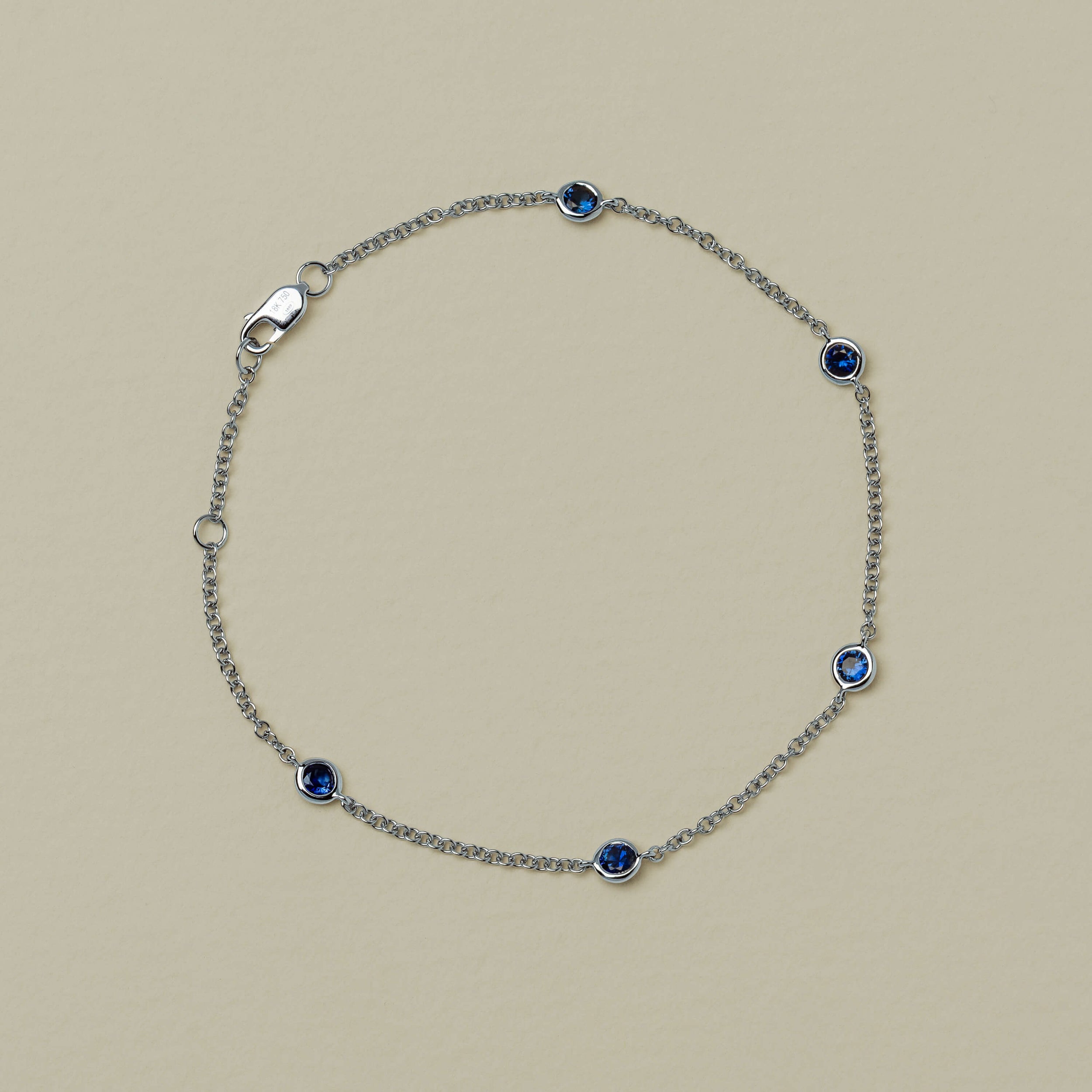 Experience the elegance of our 18ct White Gold Sapphire Natalia Bracelet, from our signature 1899 collection, where delicate craftsmanship meets effortless beauty. Five bezel-set sapphires are thoughtfully set along a fine 18ct white gold chain, each catching the light with every movement to create a sense of playful grace and freedom.