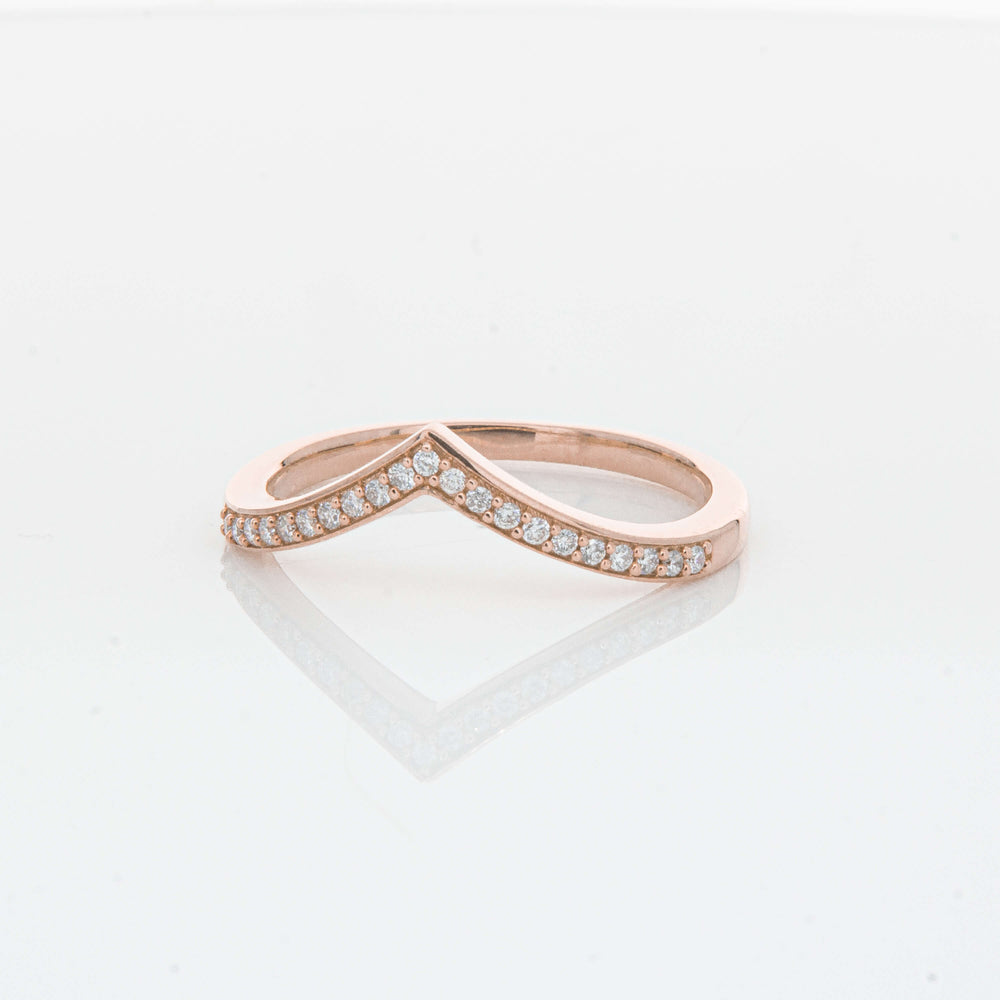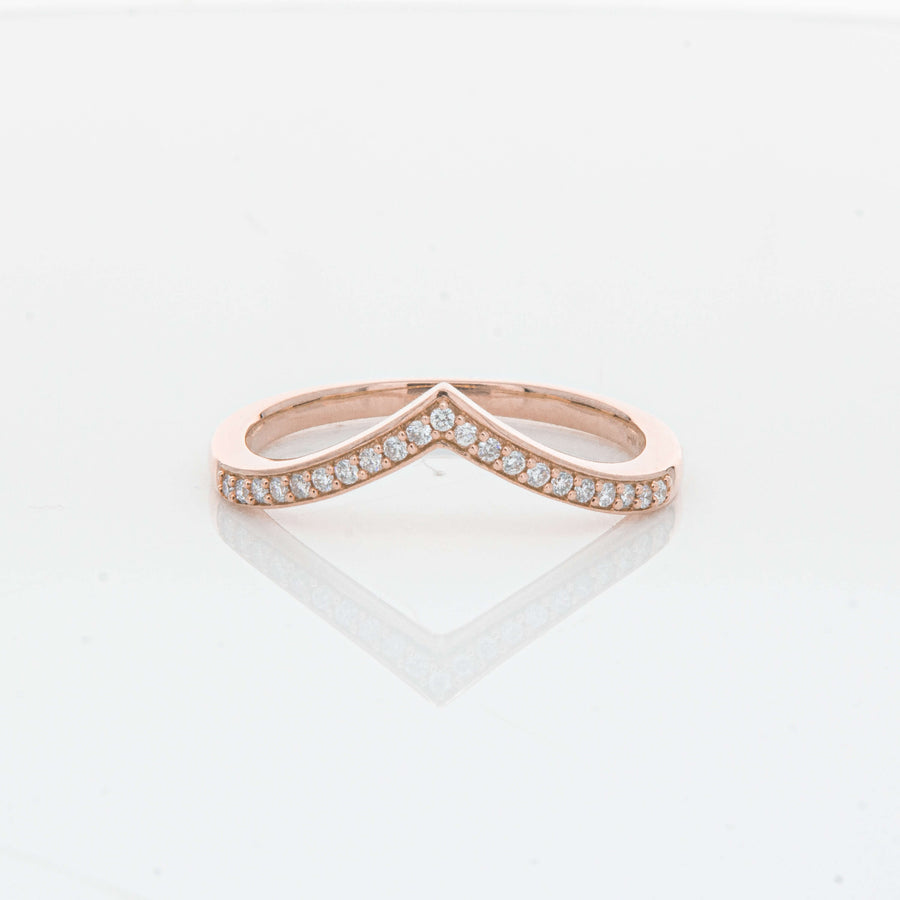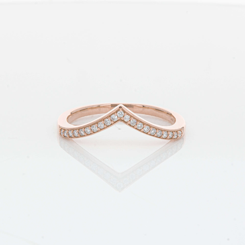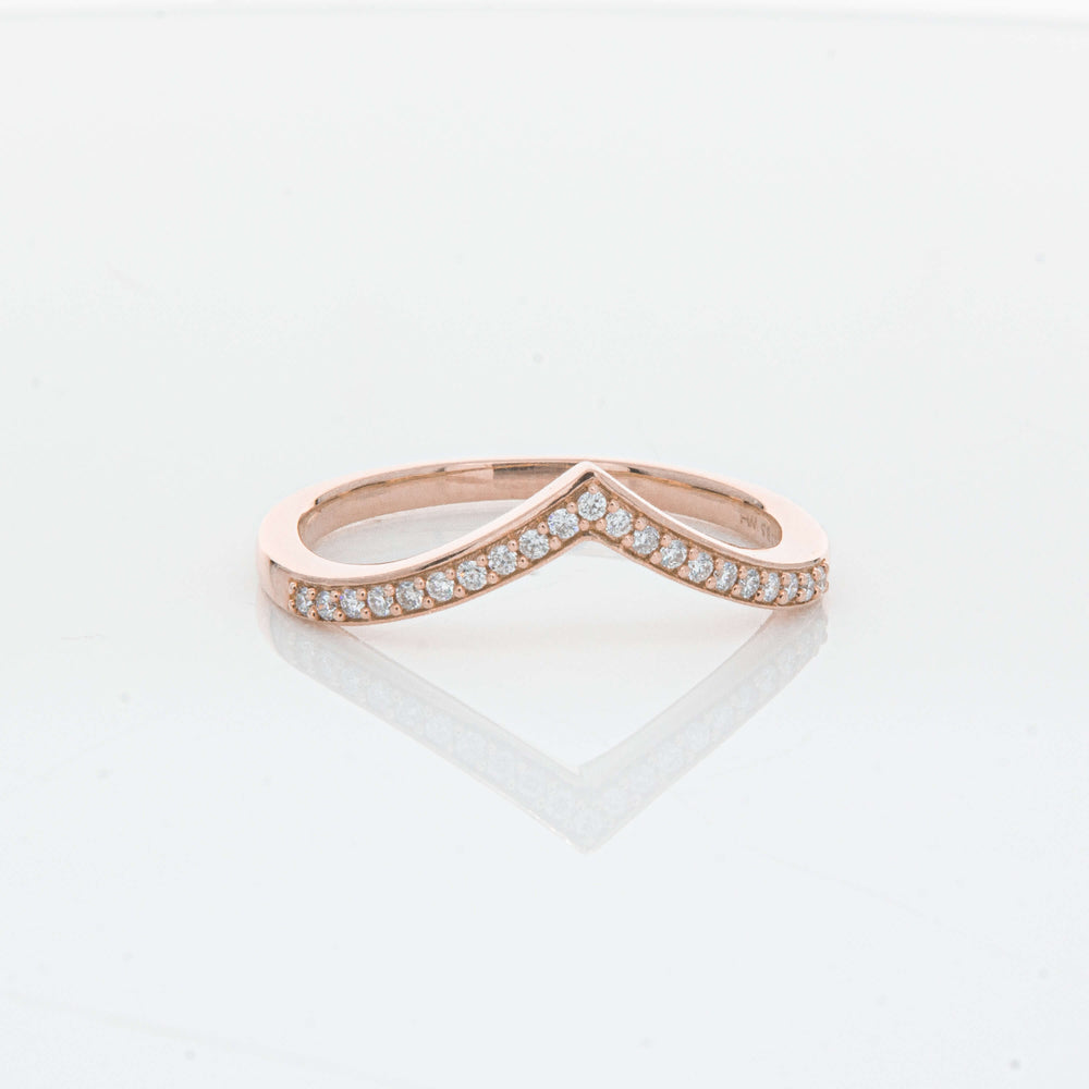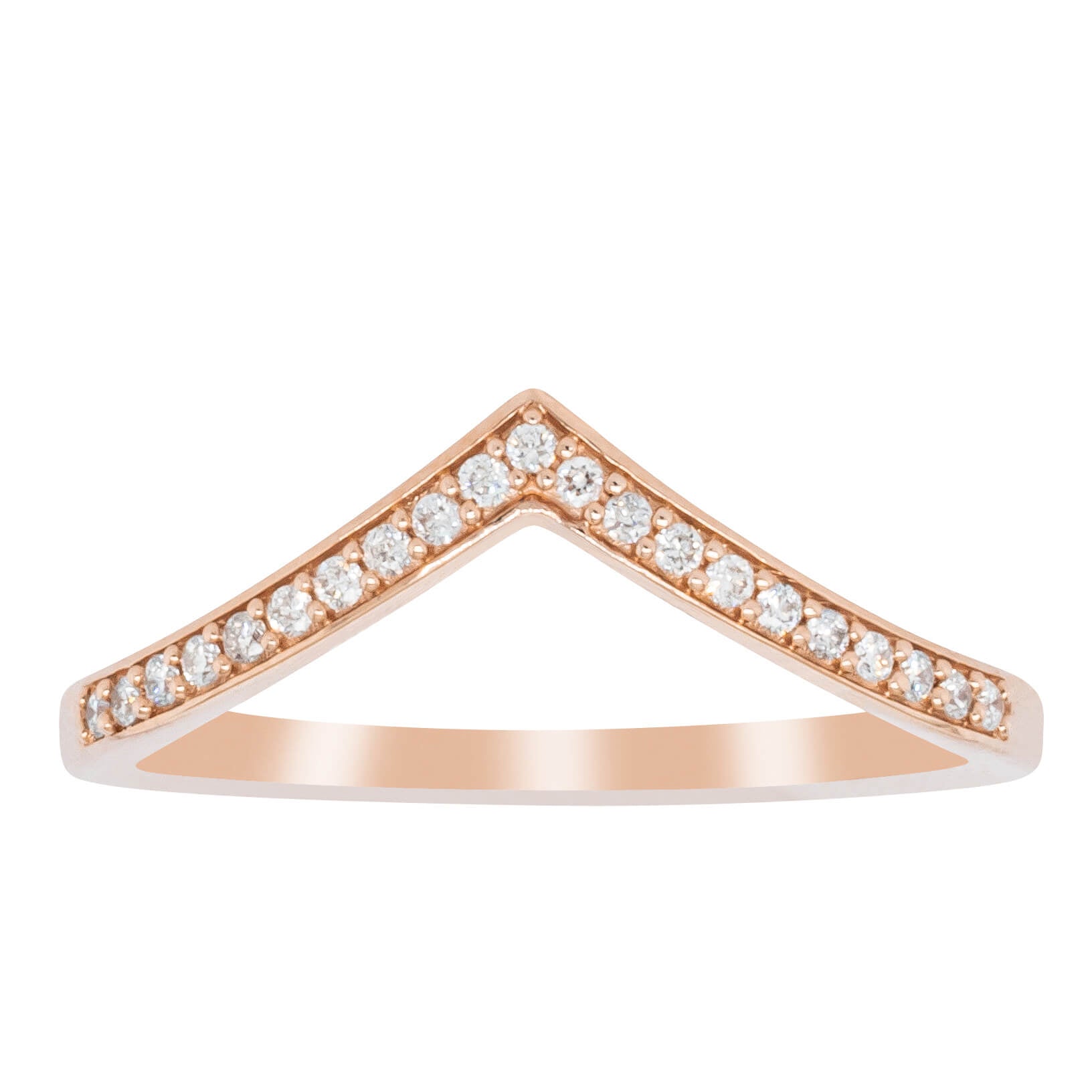 Whether on its own or as part of a ring stack, this stylish 14ct rose gold Chevron band sparkles with 21 round brilliant cut diamonds running along the gentle curve of its chevron shaped design.