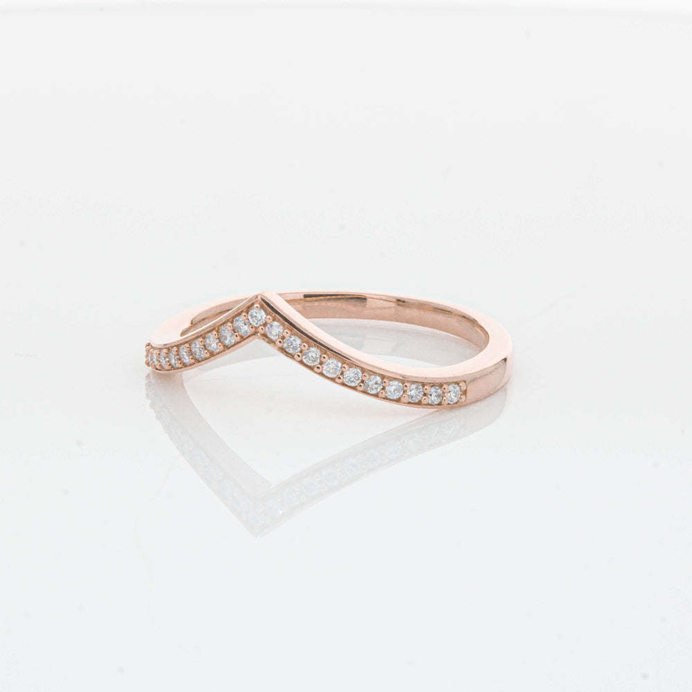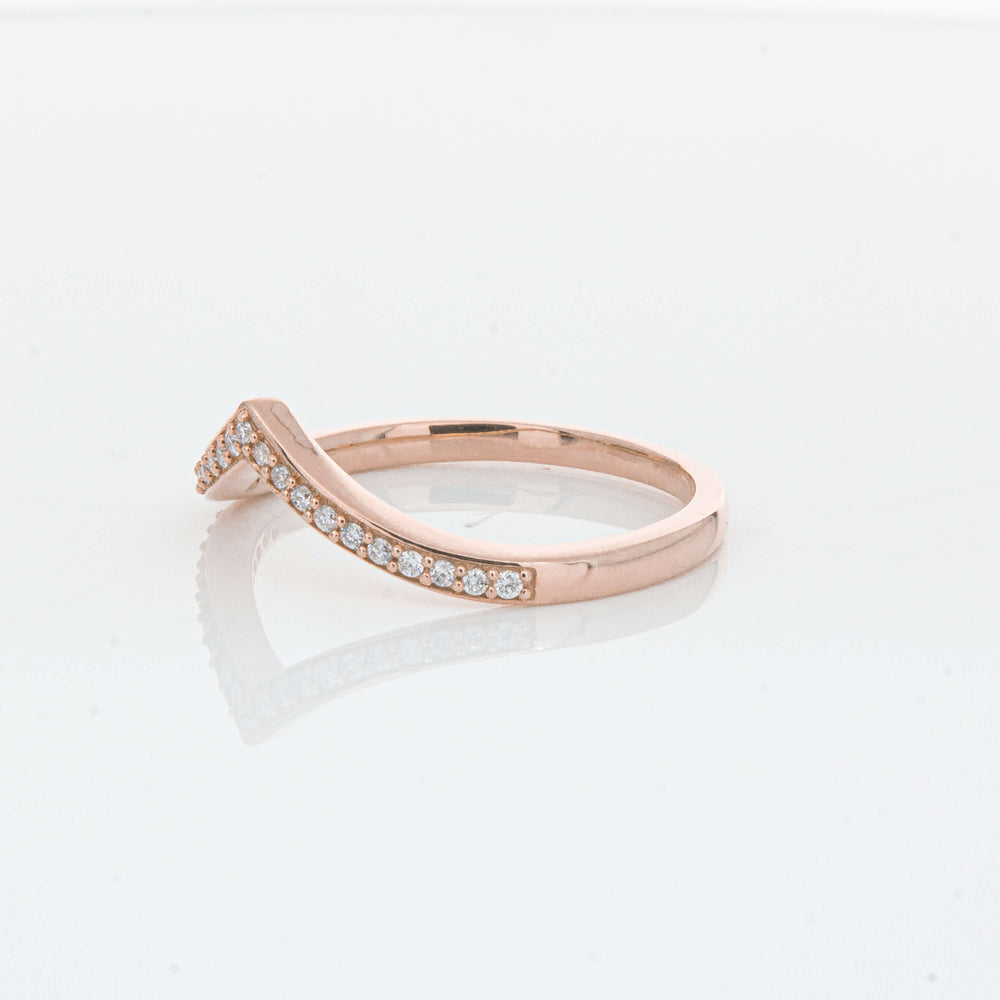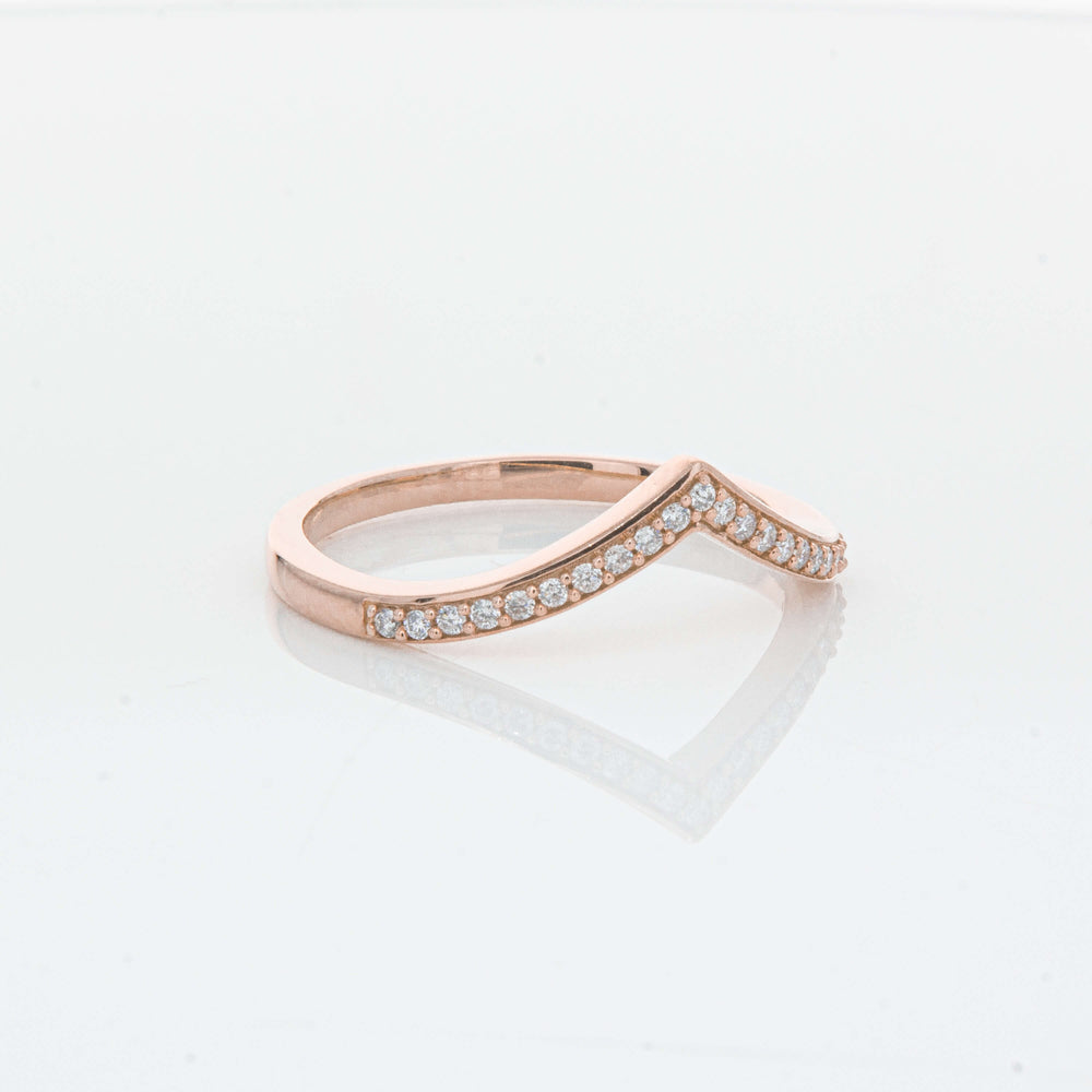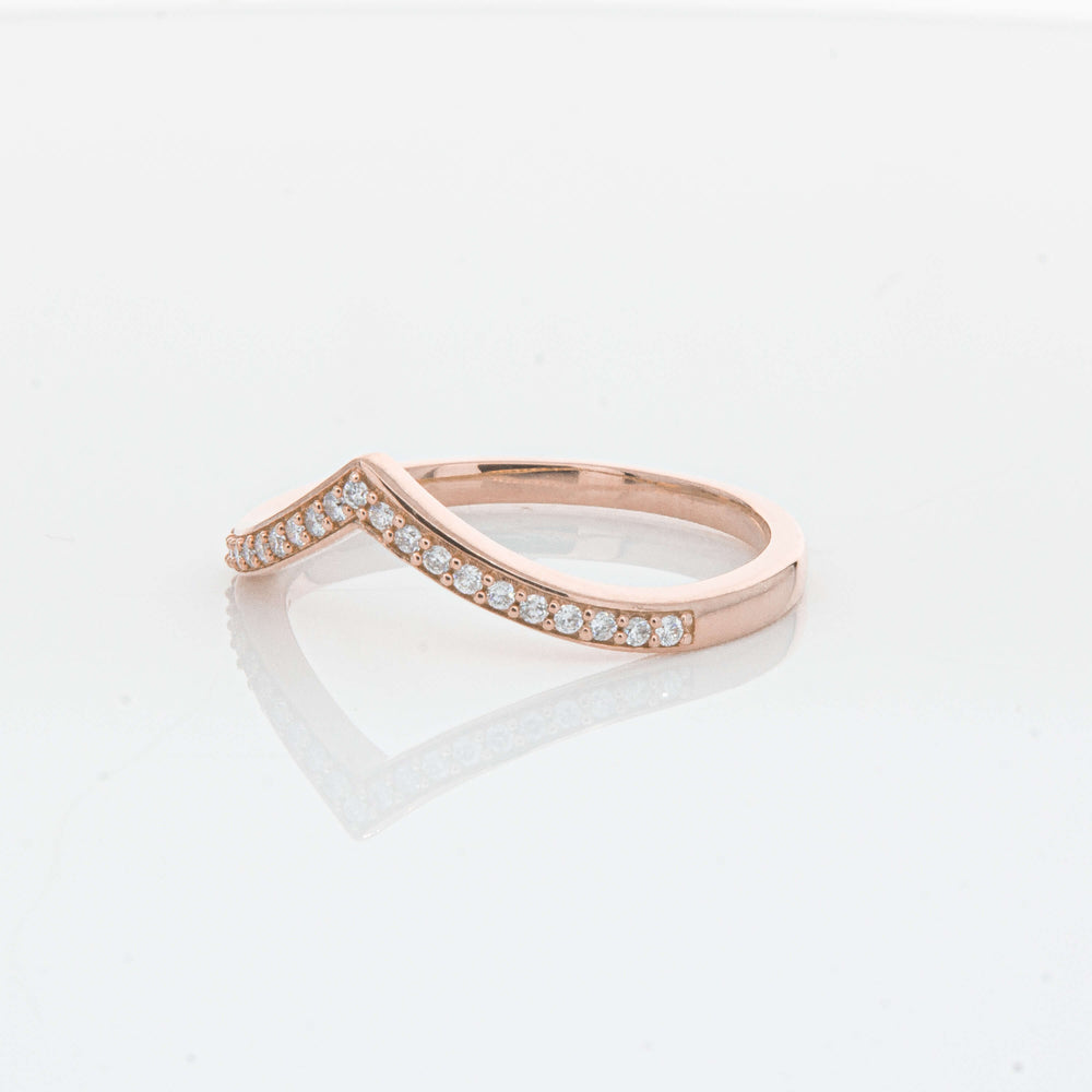 Whether on its own or as part of a ring stack, this stylish 14ct rose gold Chevron band sparkles with 21 round brilliant cut diamonds running along the gentle curve of its chevron shaped design.