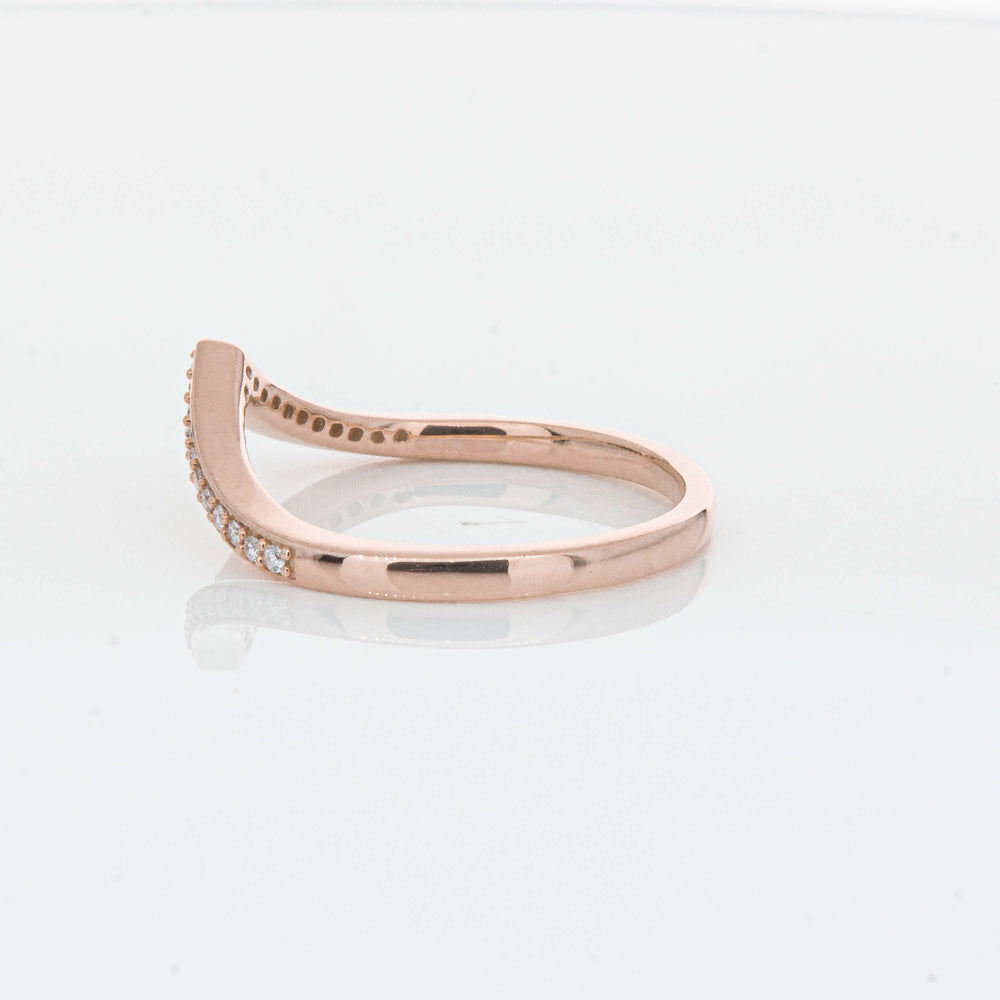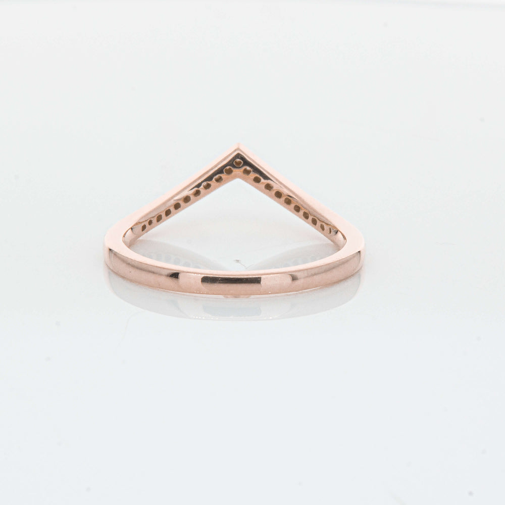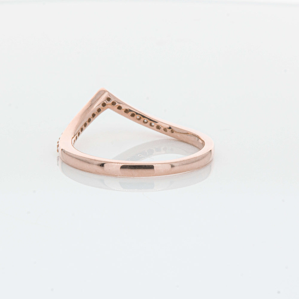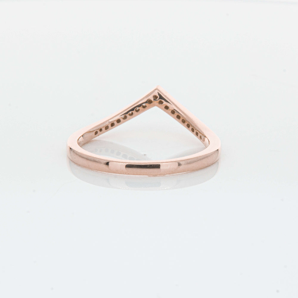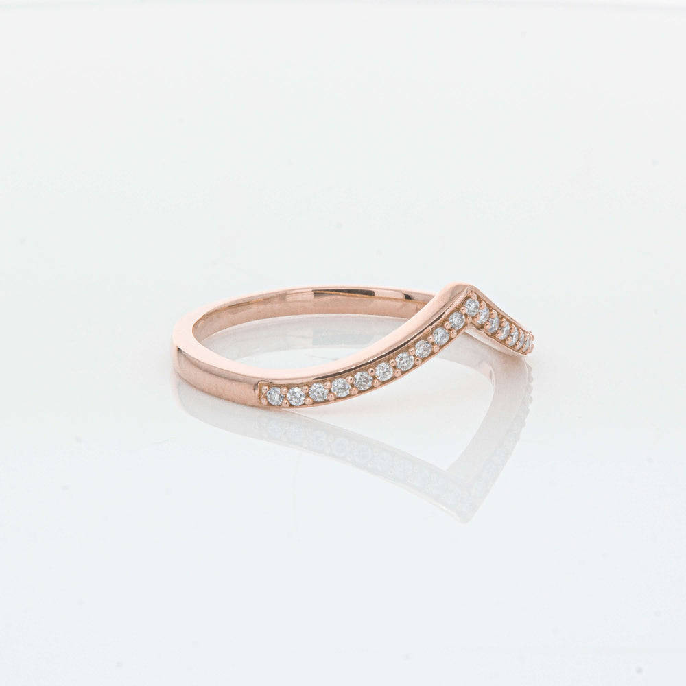 Whether on its own or as part of a ring stack, this stylish 14ct rose gold Chevron band sparkles with 21 round brilliant cut diamonds running along the gentle curve of its chevron shaped design.