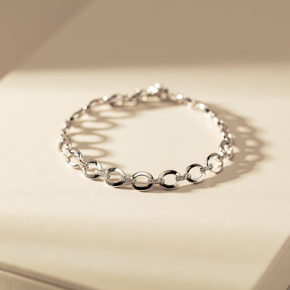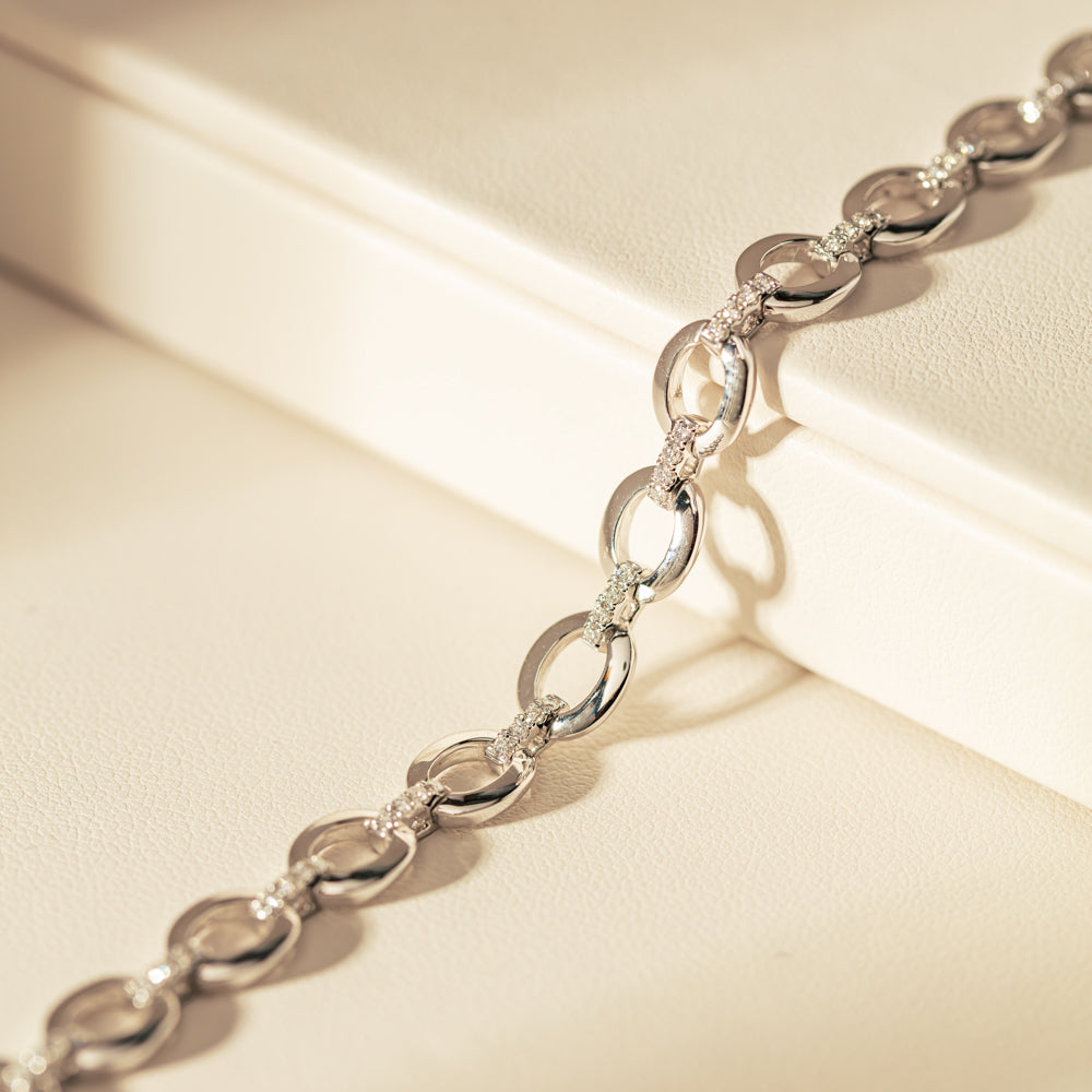Each oval link is meticulously designed and adorned with brilliant diamonds. The diamonds are expertly set to enhance their natural beauty, creating a seamless flow of light with every movement of your wrist. Whether worn alone or paired with other accessories, it adds a touch of sophistication to any ensemble.