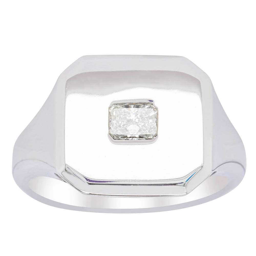 A luxurious signet ring crafted in 14ct white gold set with a radiant cut diamond.