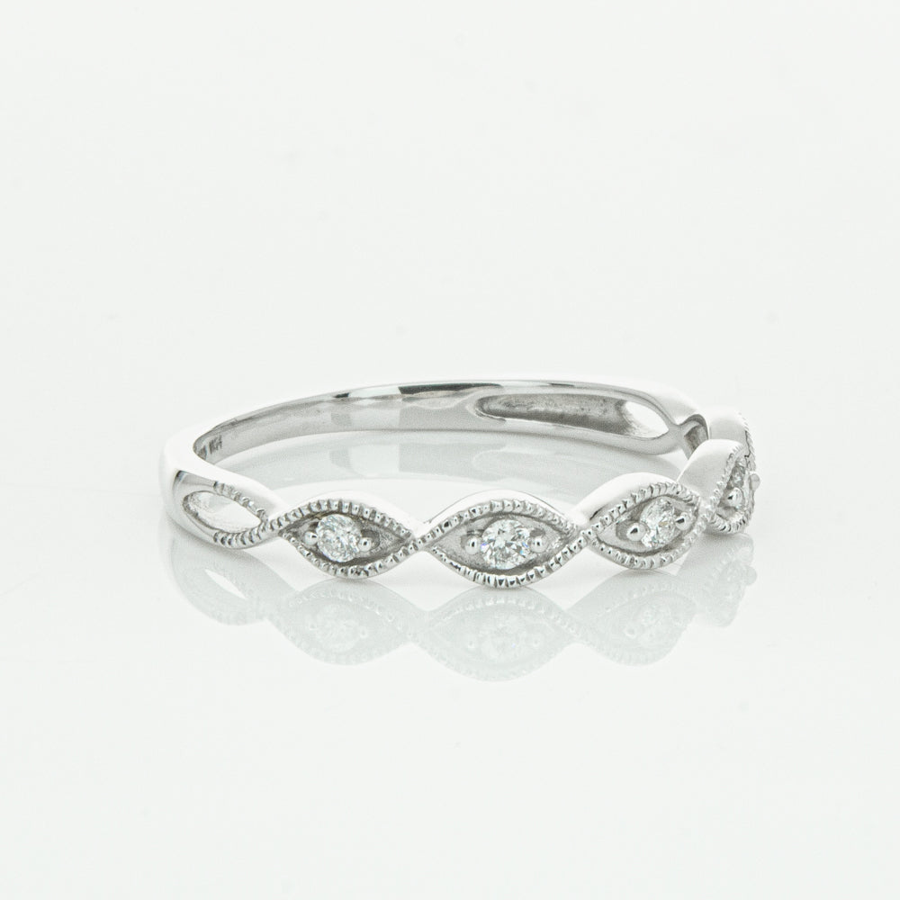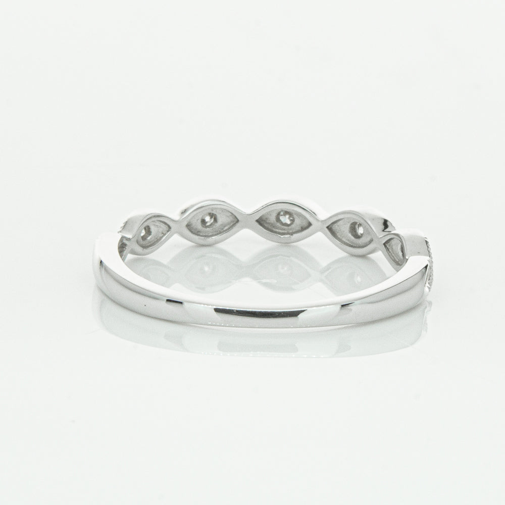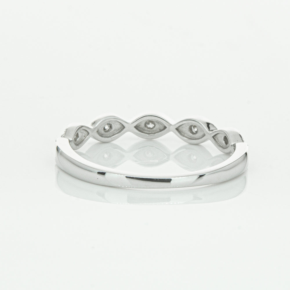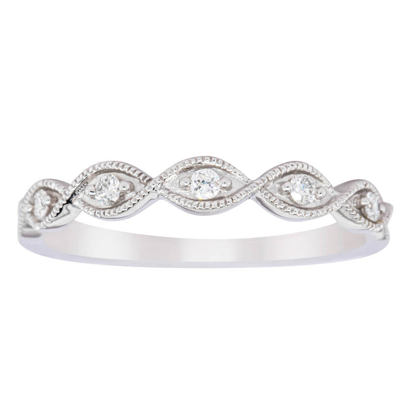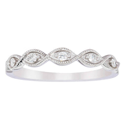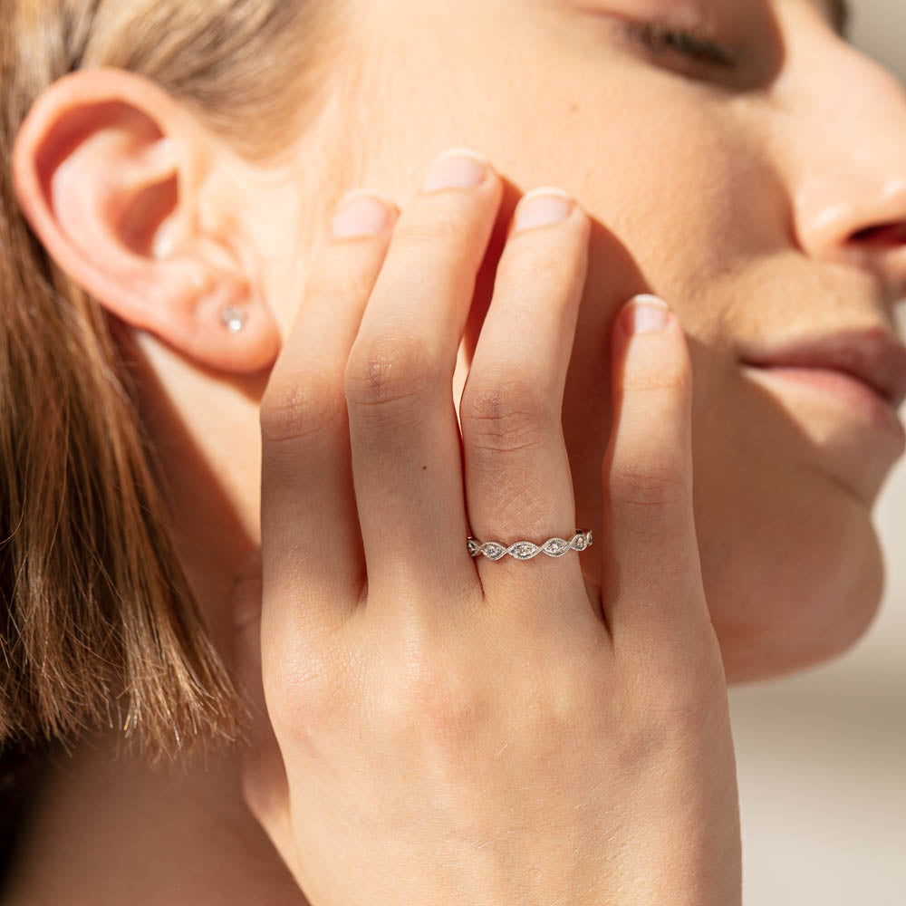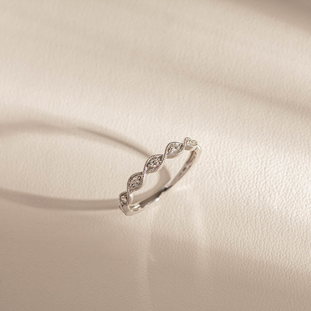 14ct white gold Rapunzel eternity band from our Stellar collection featuring marquise shaped motifs with five round brilliant cut diamonds delicately set in a millgrain setting.