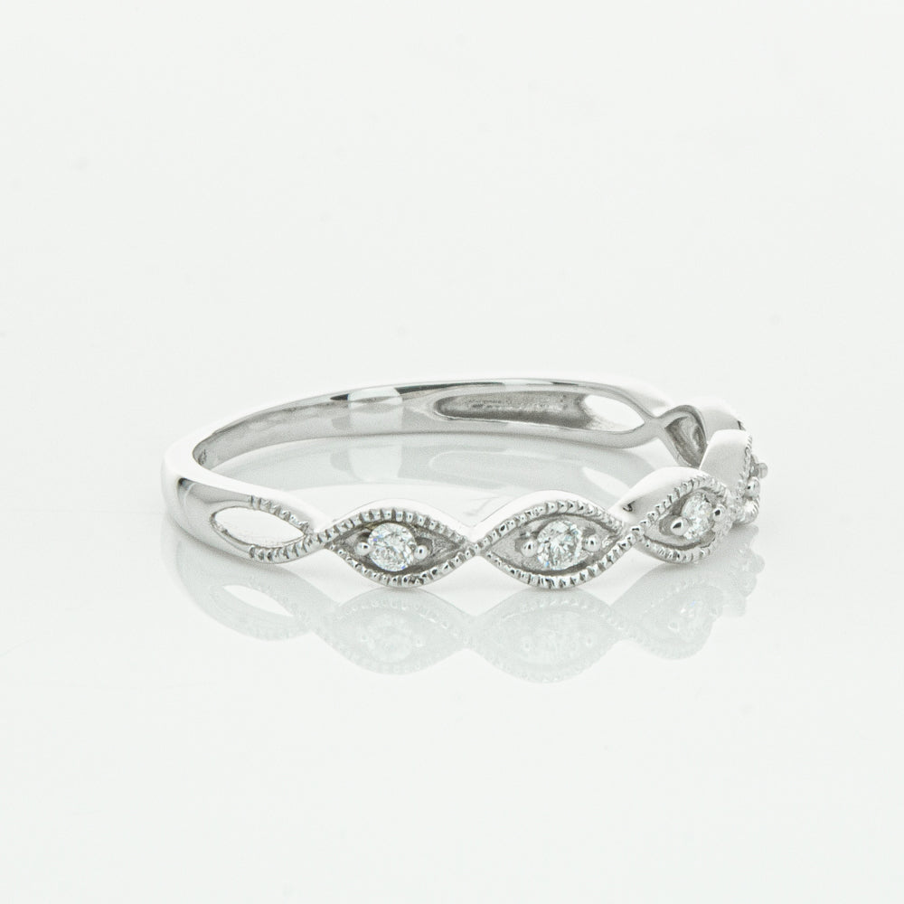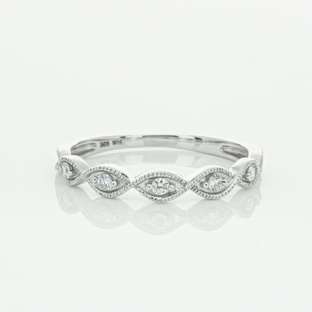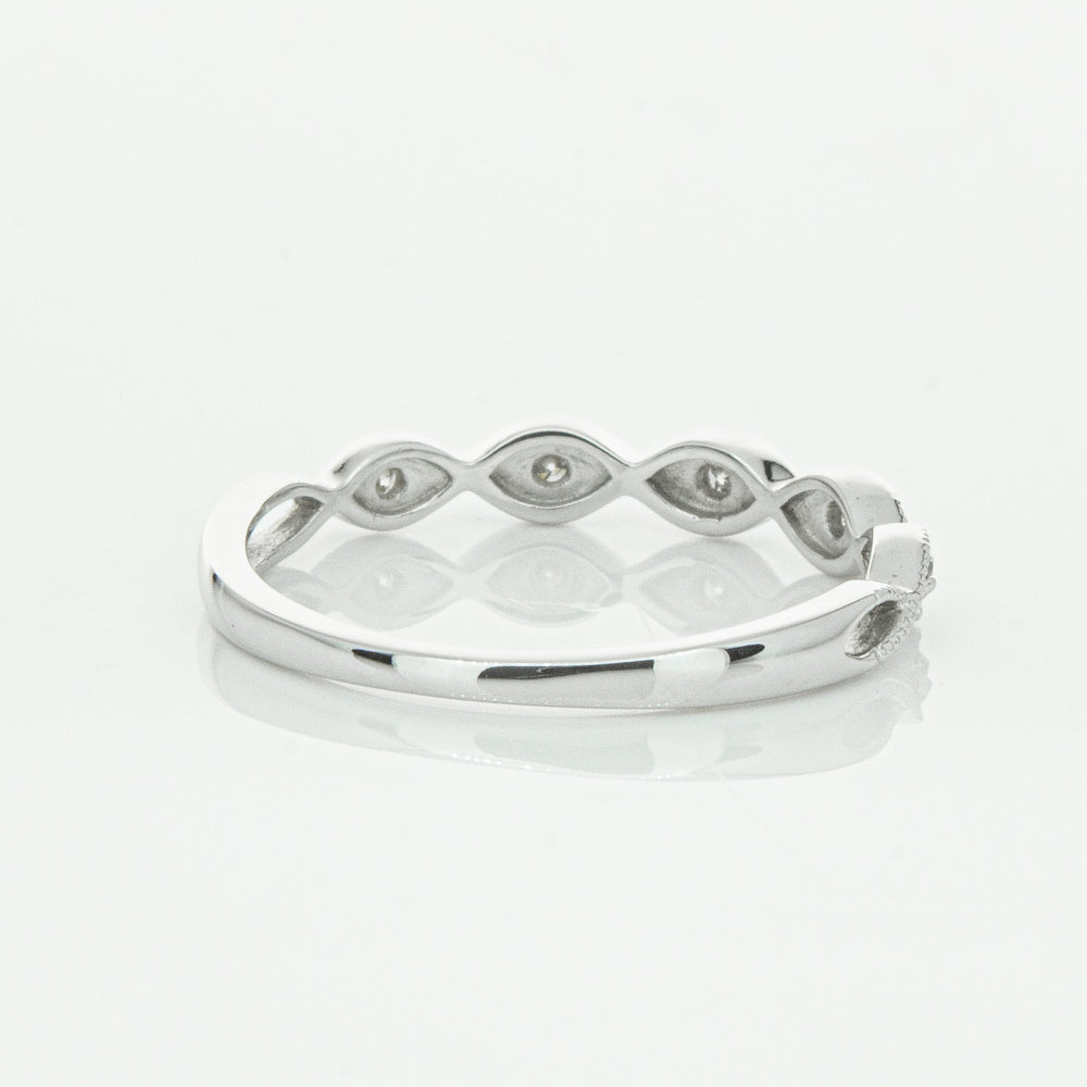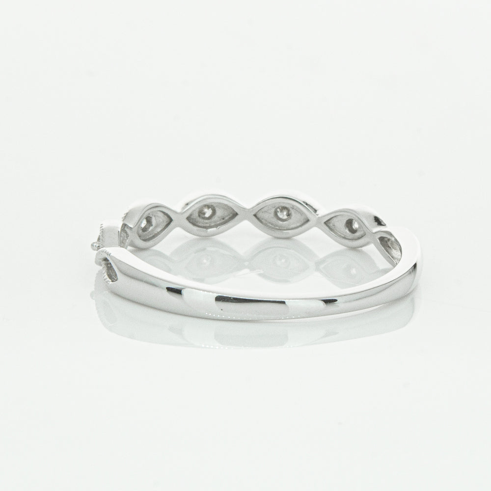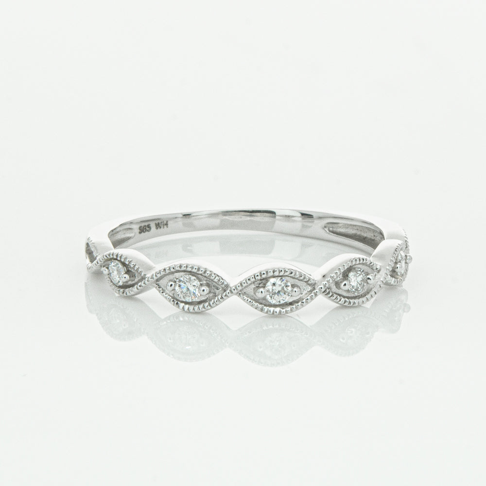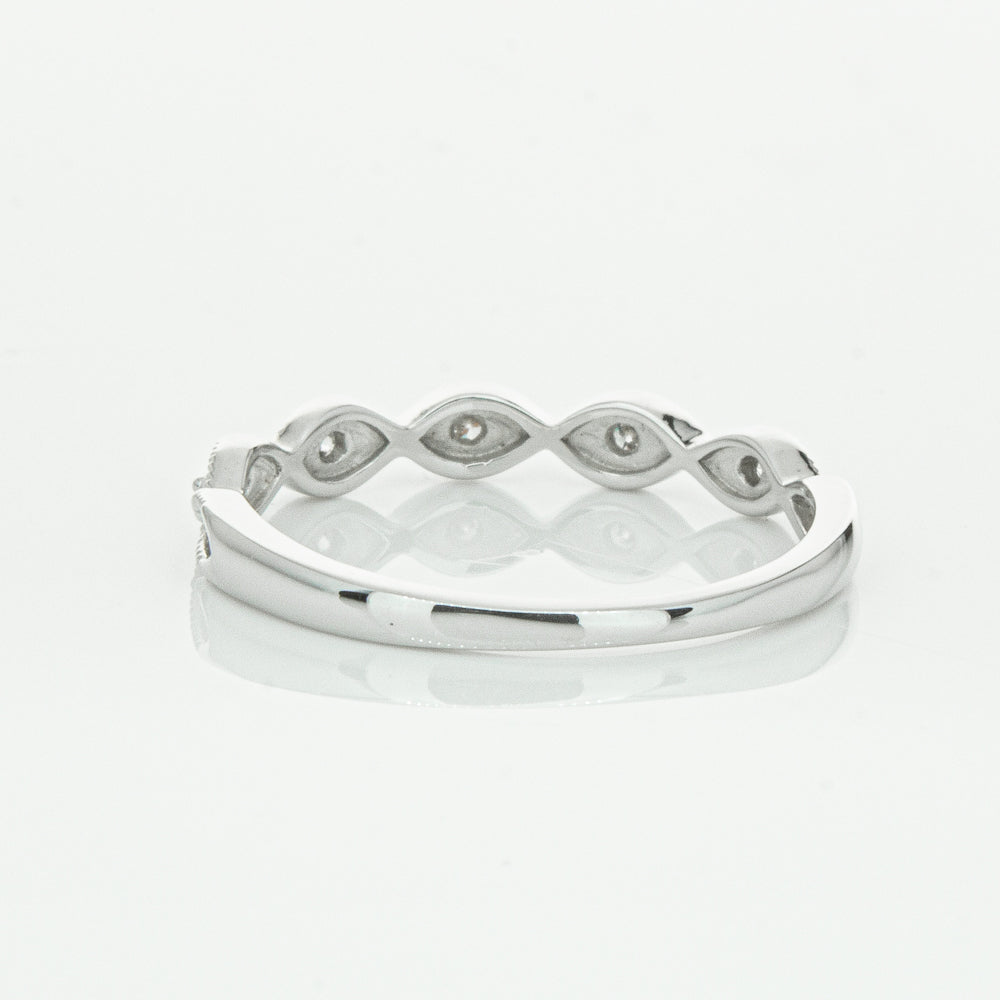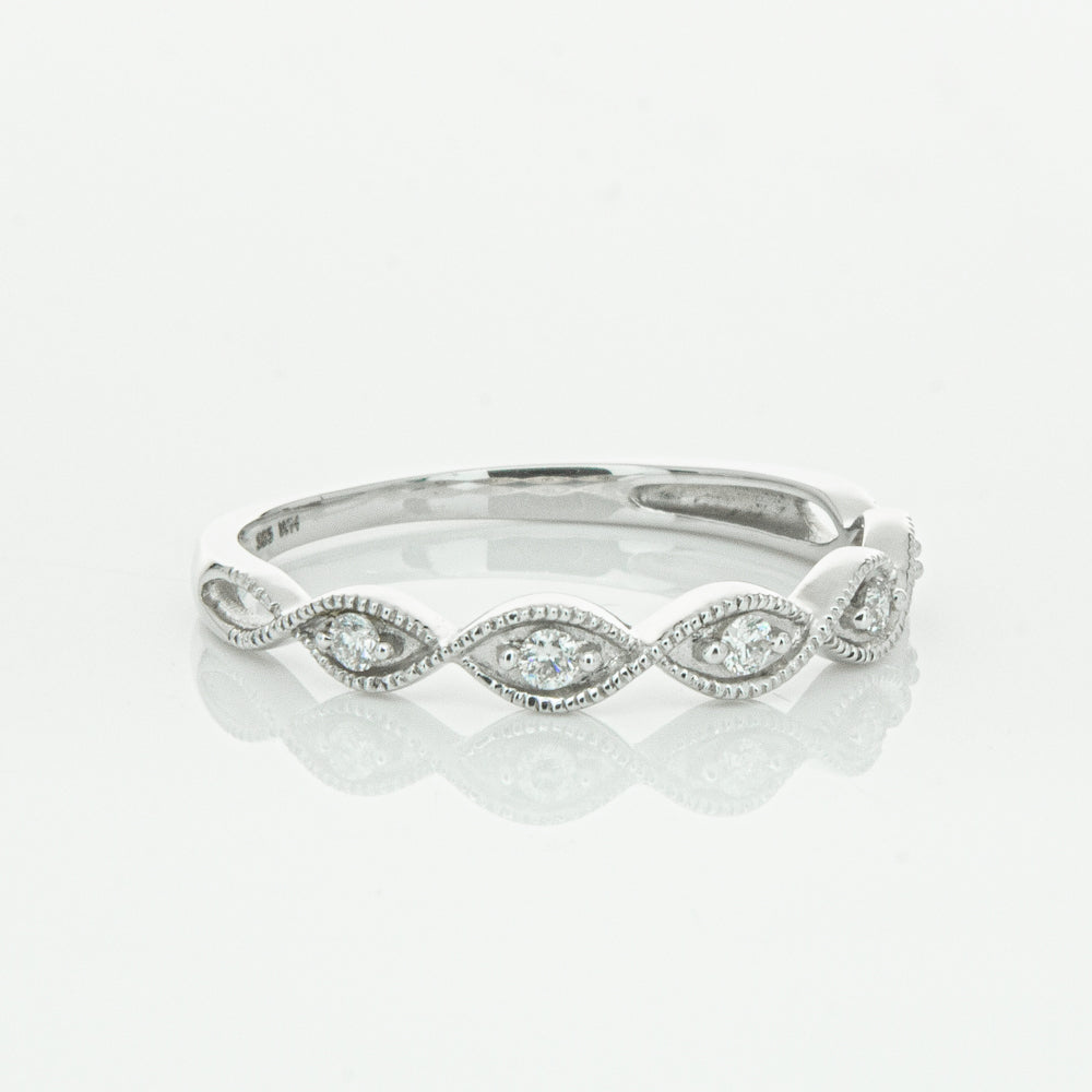 14ct white gold Rapunzel eternity band from our Stellar collection featuring marquise shaped motifs with five round brilliant cut diamonds delicately set in a millgrain setting.