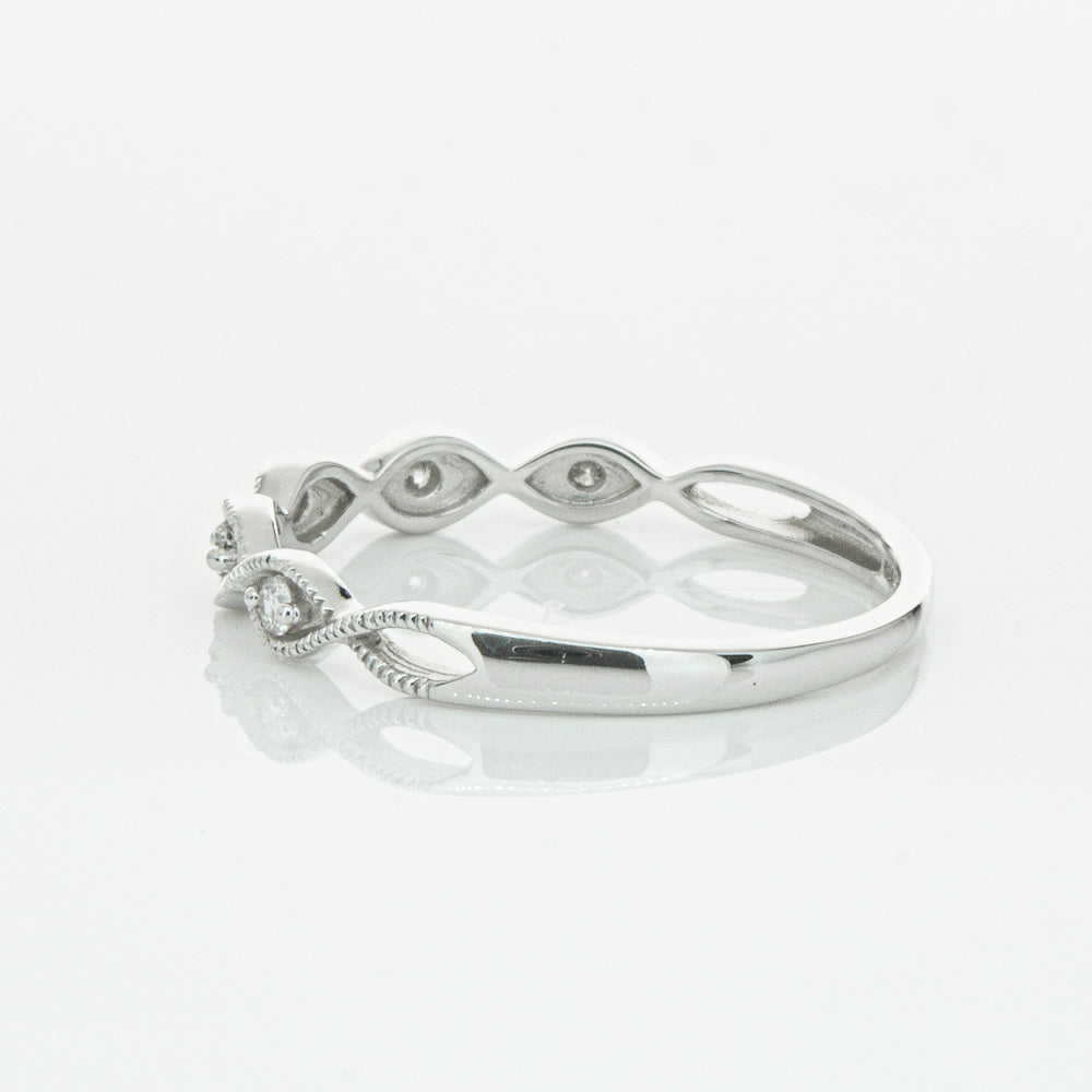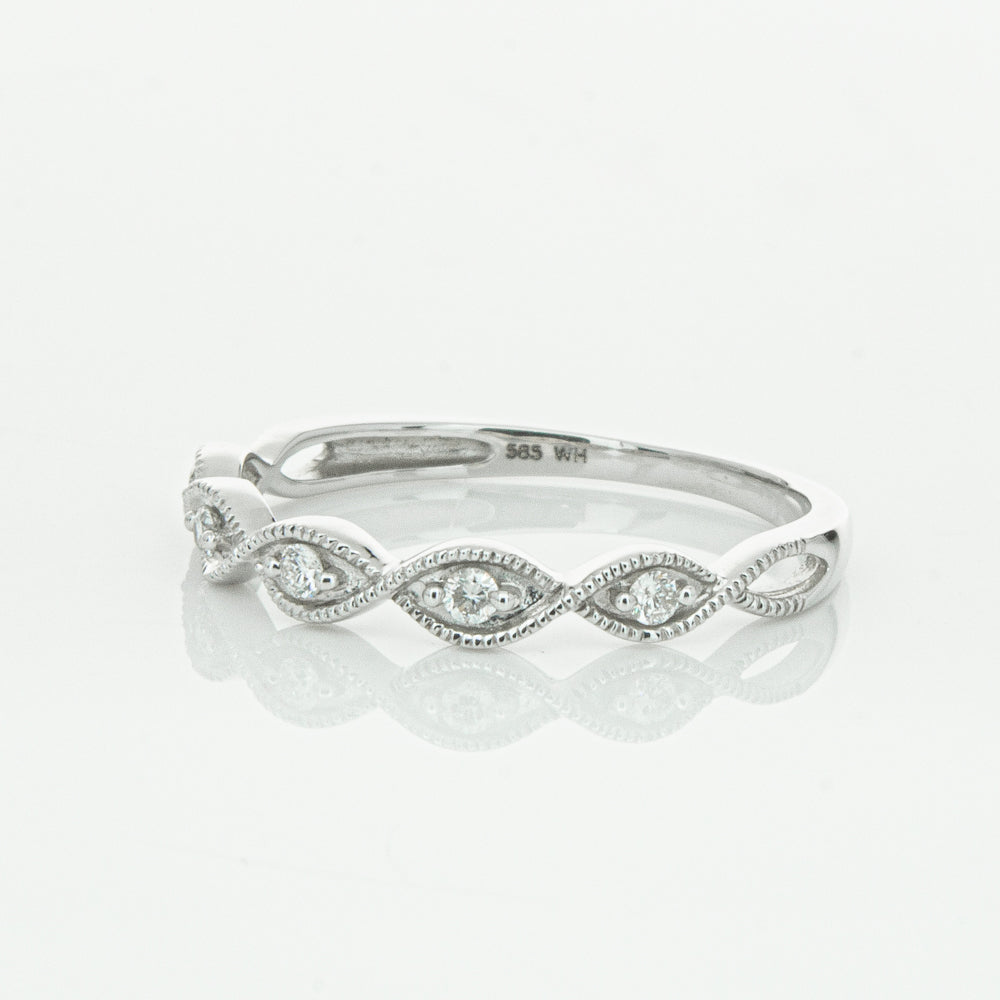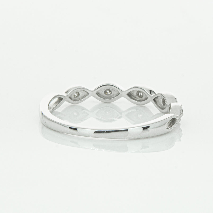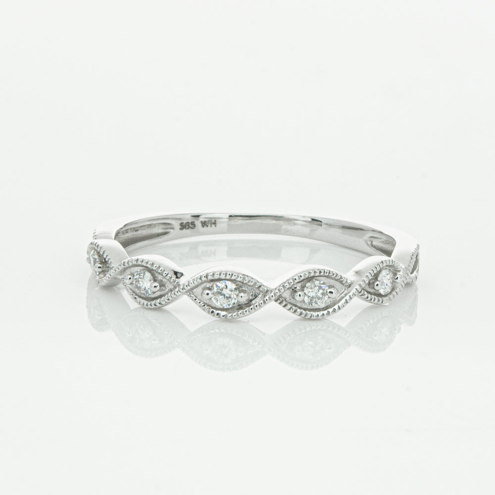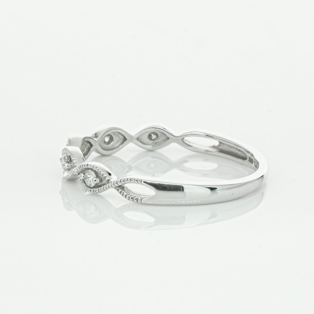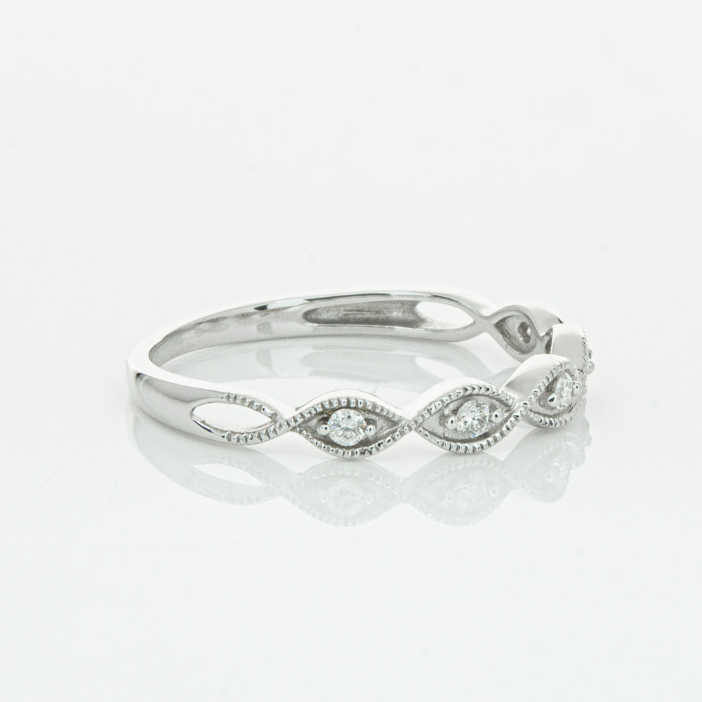 14ct white gold Rapunzel eternity band from our Stellar collection featuring marquise shaped motifs with five round brilliant cut diamonds delicately set in a millgrain setting.