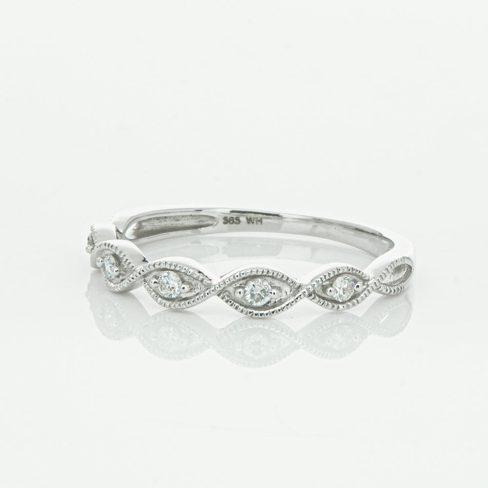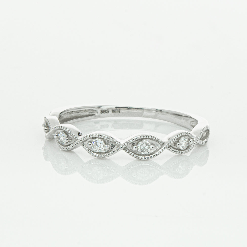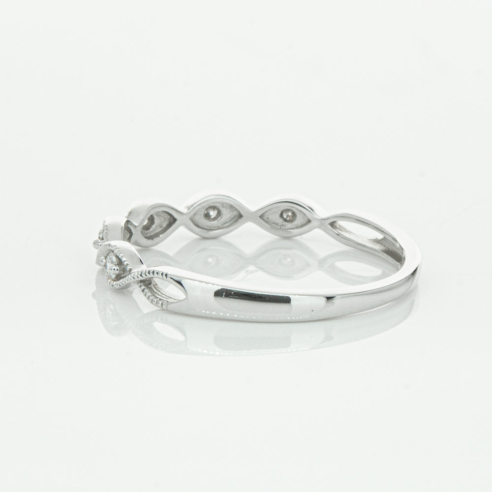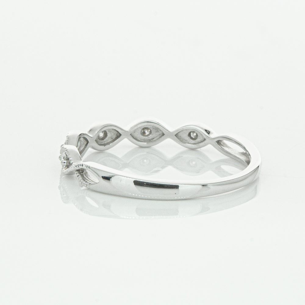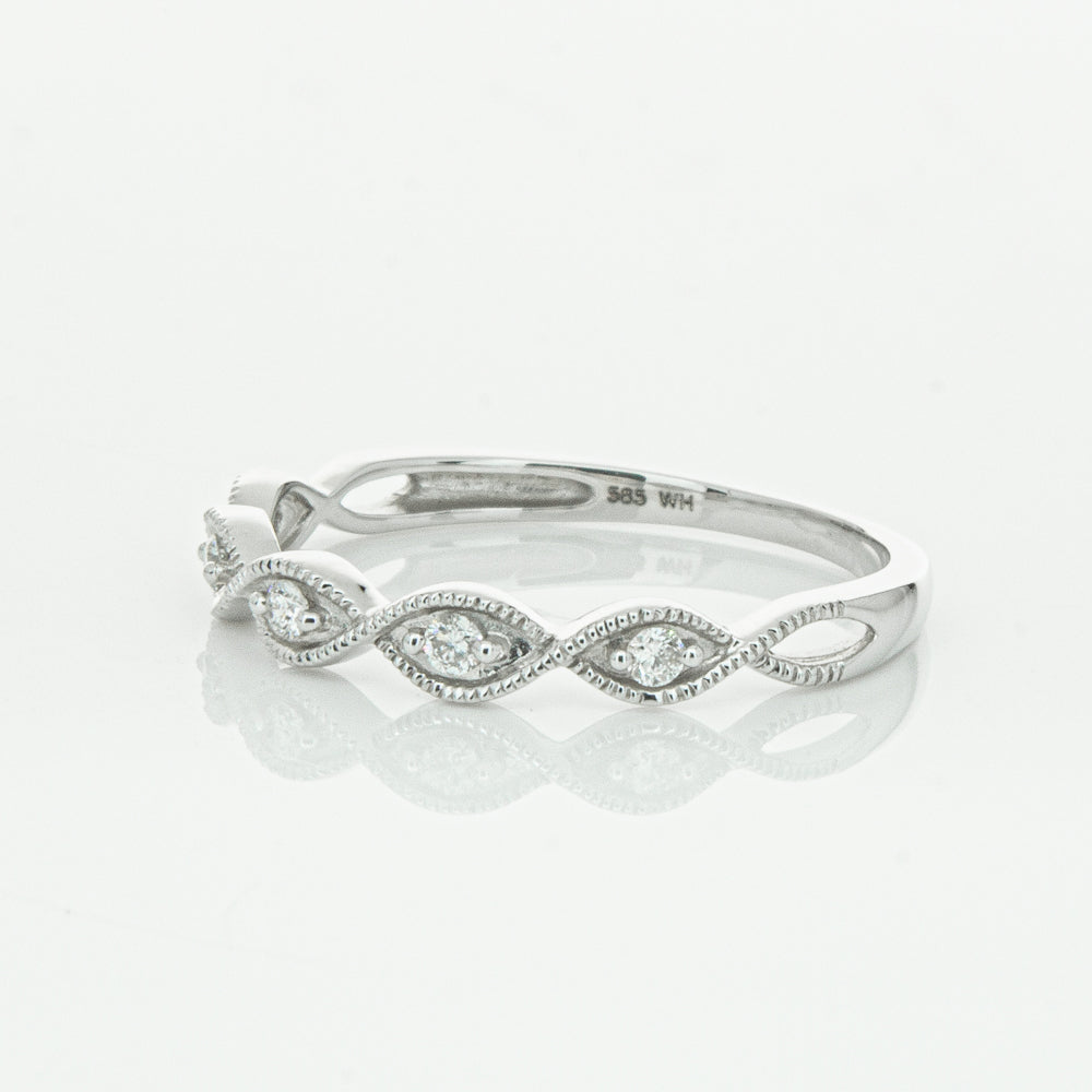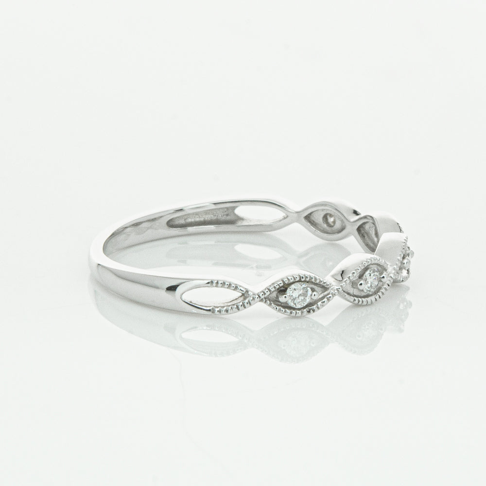 14ct white gold Rapunzel eternity band from our Stellar collection featuring marquise shaped motifs with five round brilliant cut diamonds delicately set in a millgrain setting.