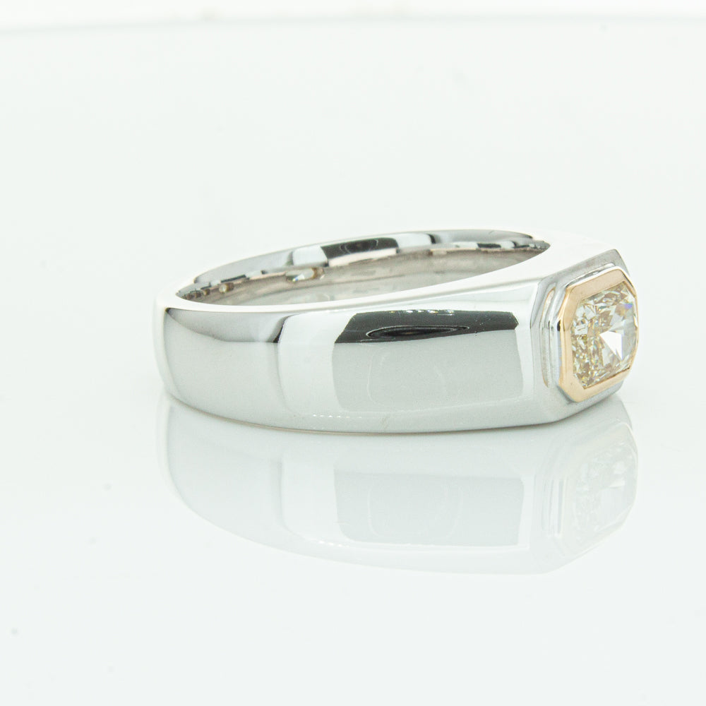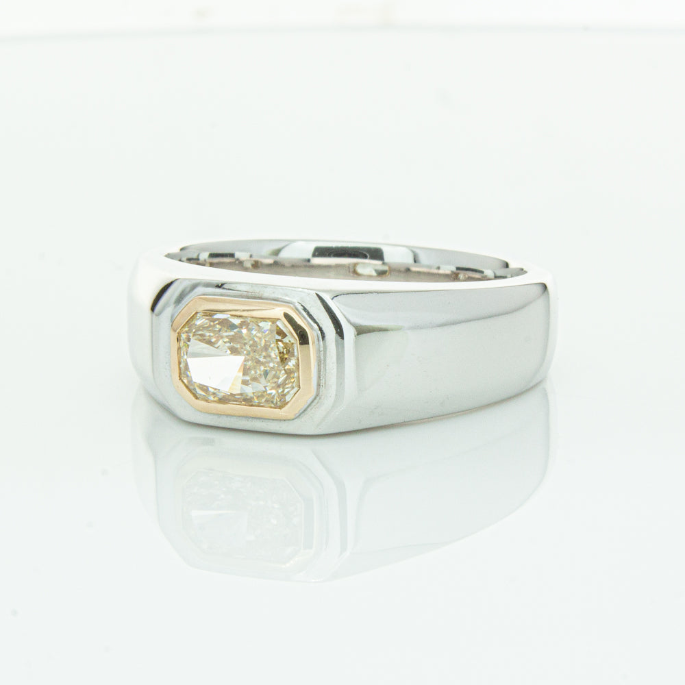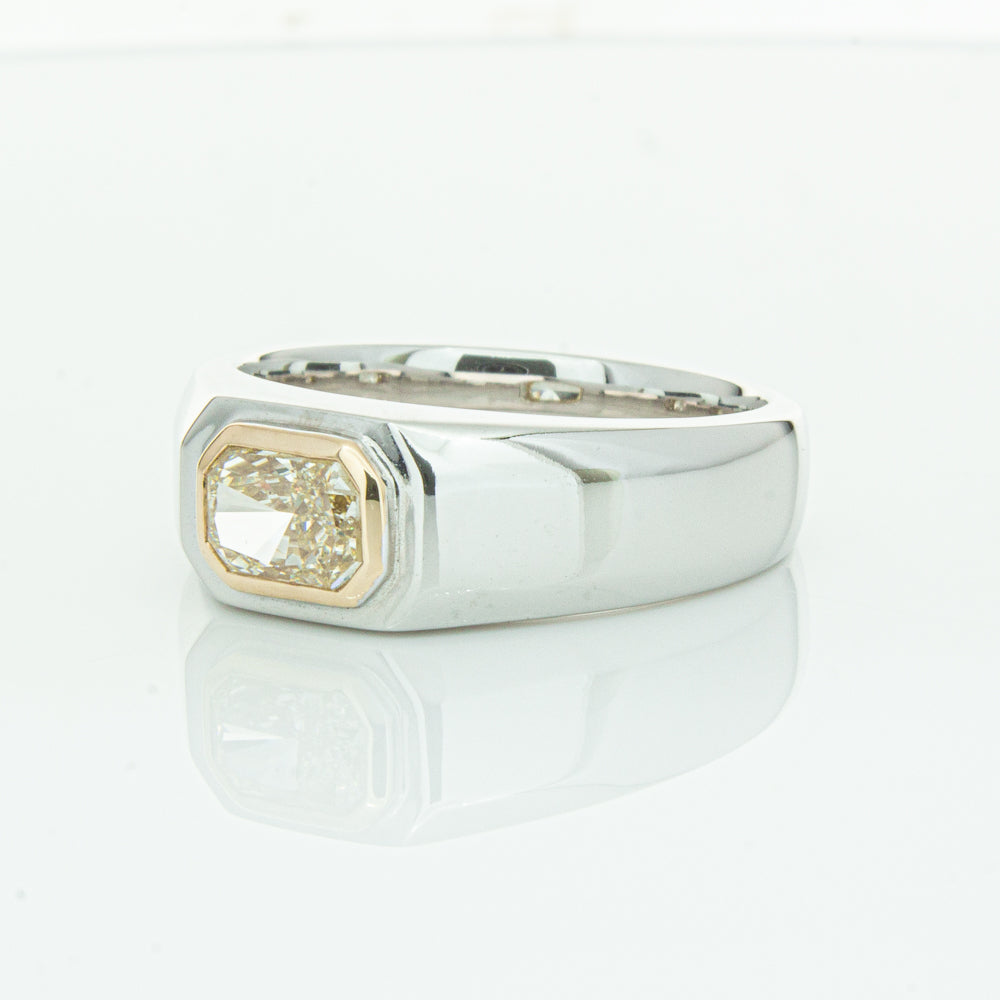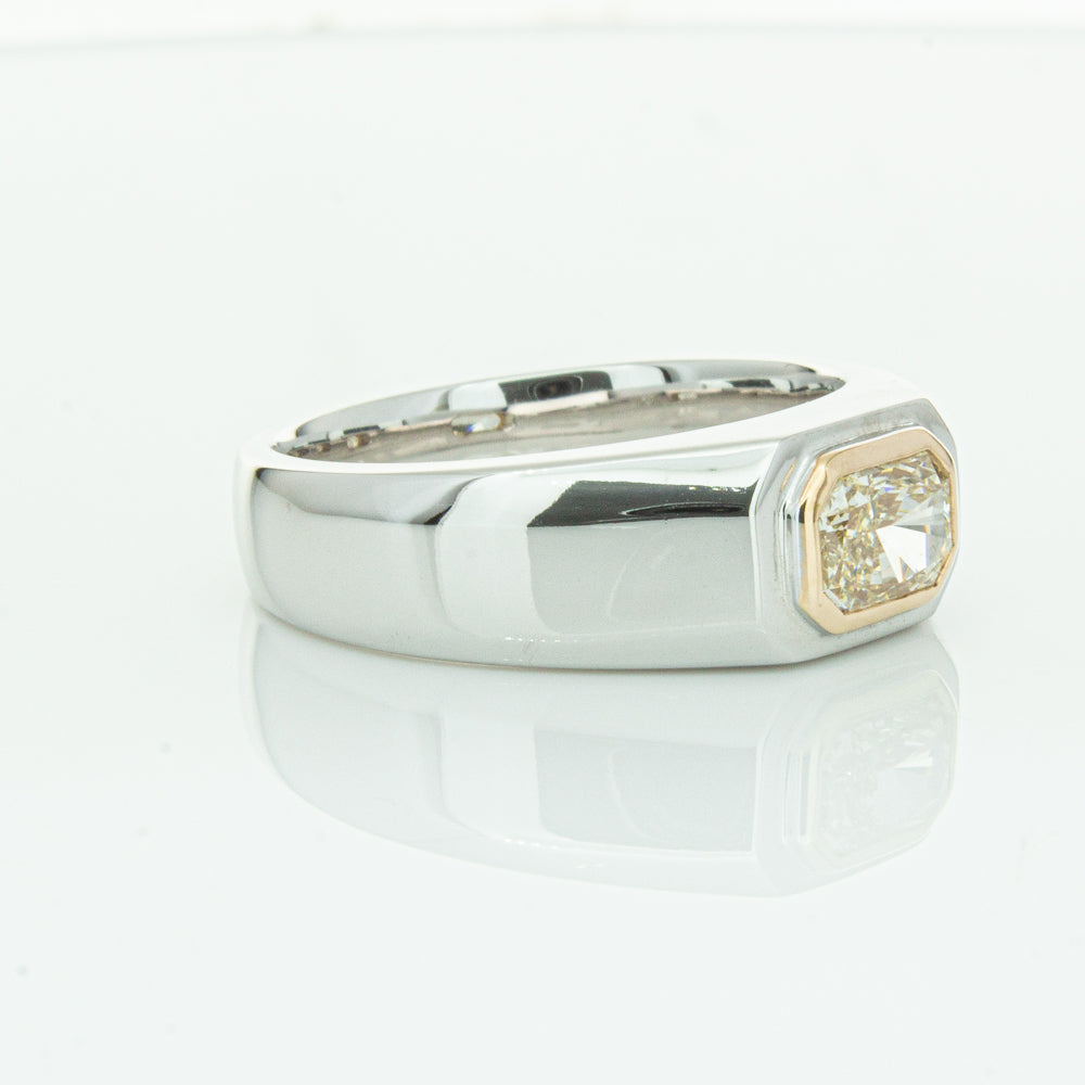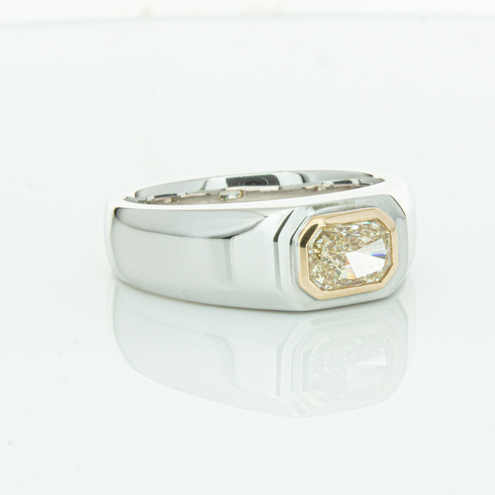 Carefully crafted in 14ct white gold this timeless ring features one radiant cut diamond. with a yellow gold rubover setting