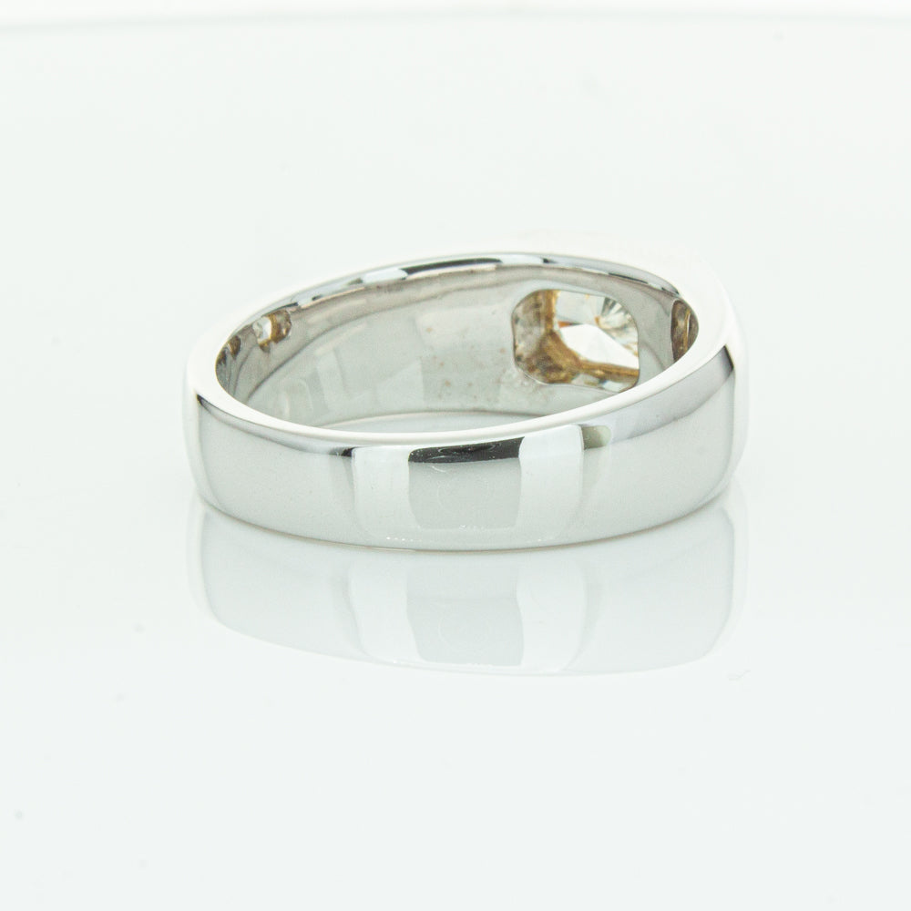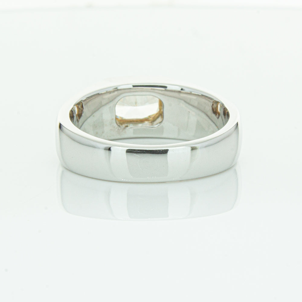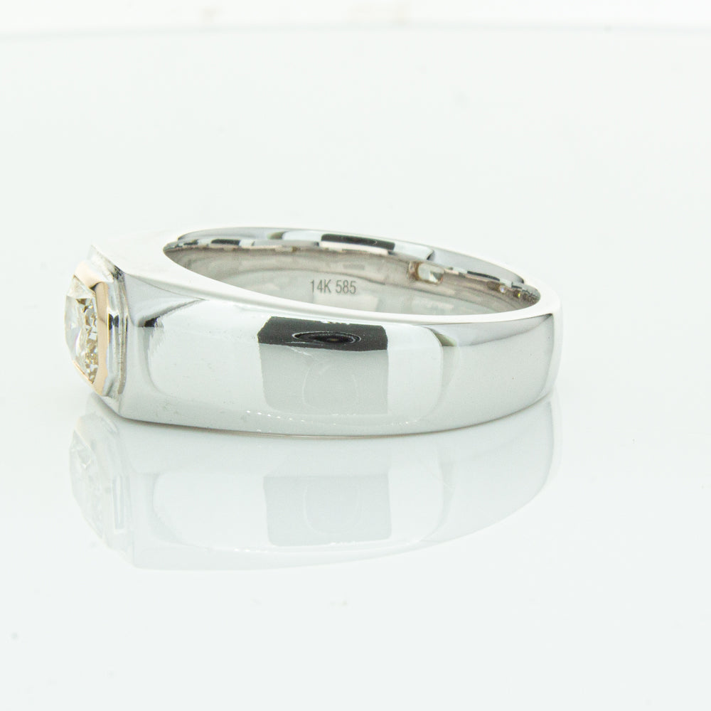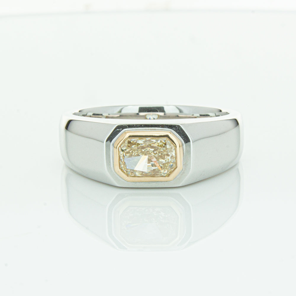 Carefully crafted in 14ct white gold this timeless ring features one radiant cut diamond. with a yellow gold rubover setting