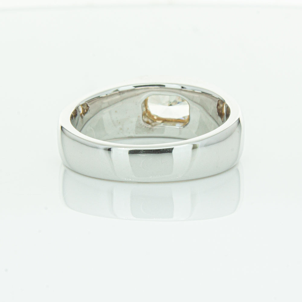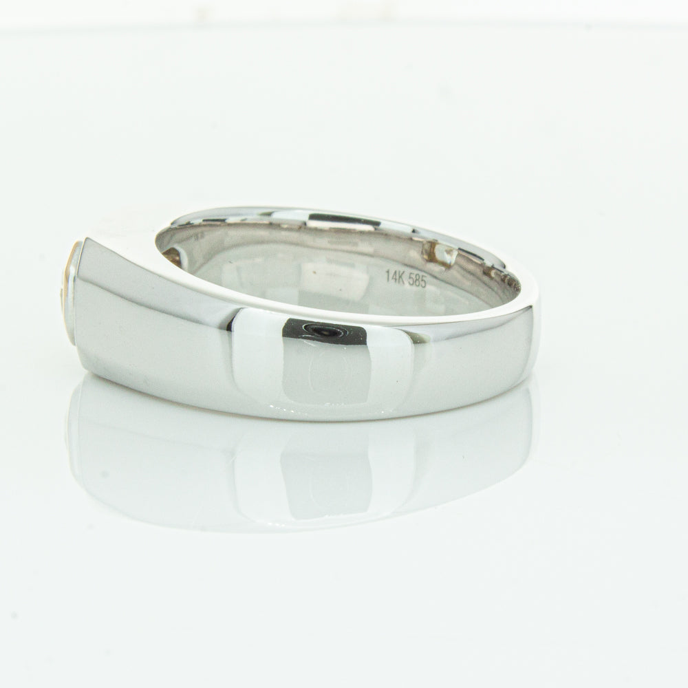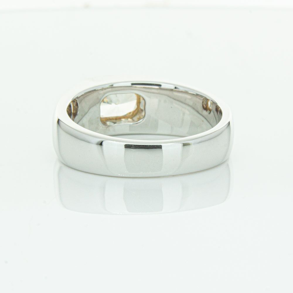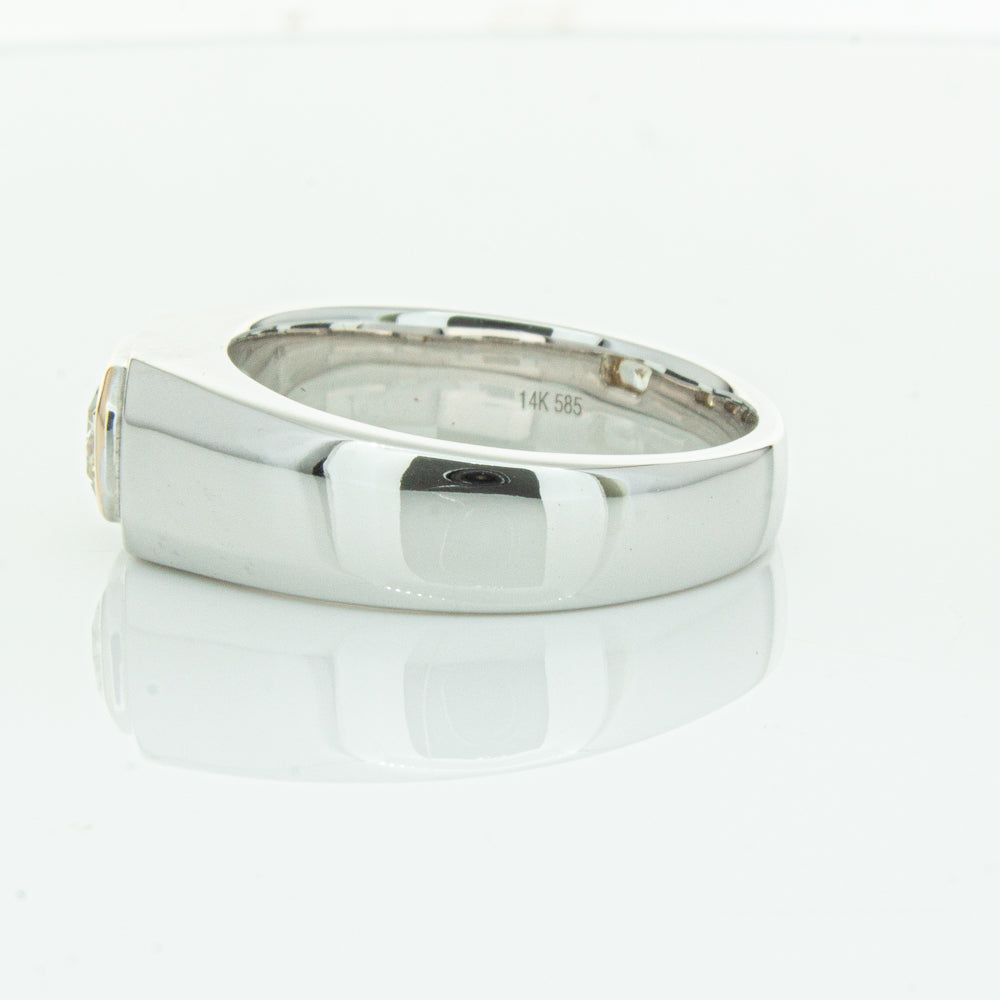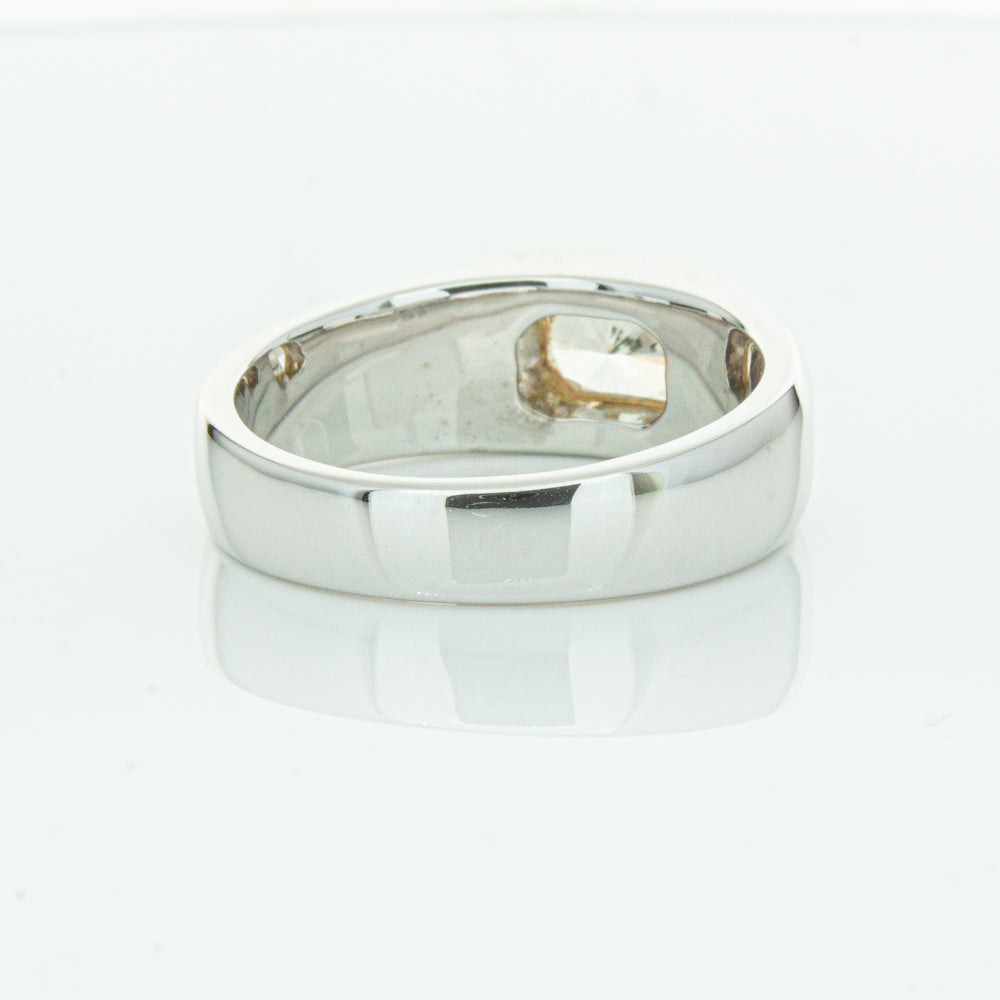 Carefully crafted in 14ct white gold this timeless ring features one radiant cut diamond. with a yellow gold rubover setting