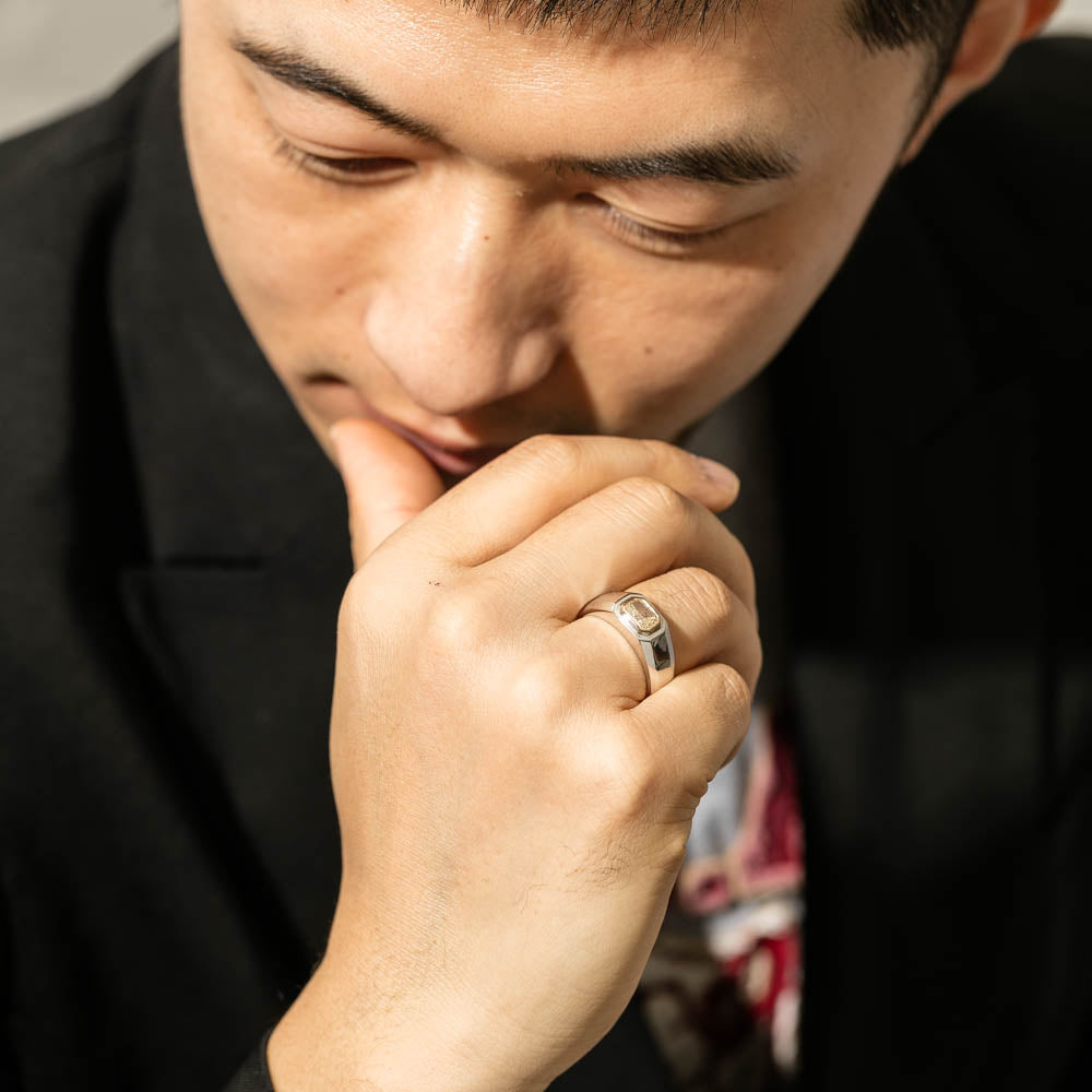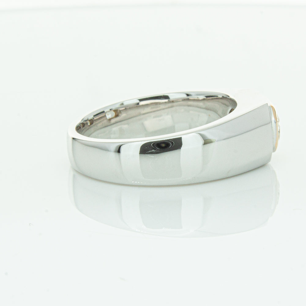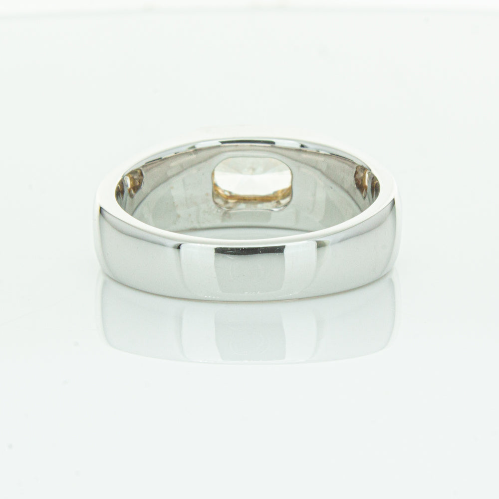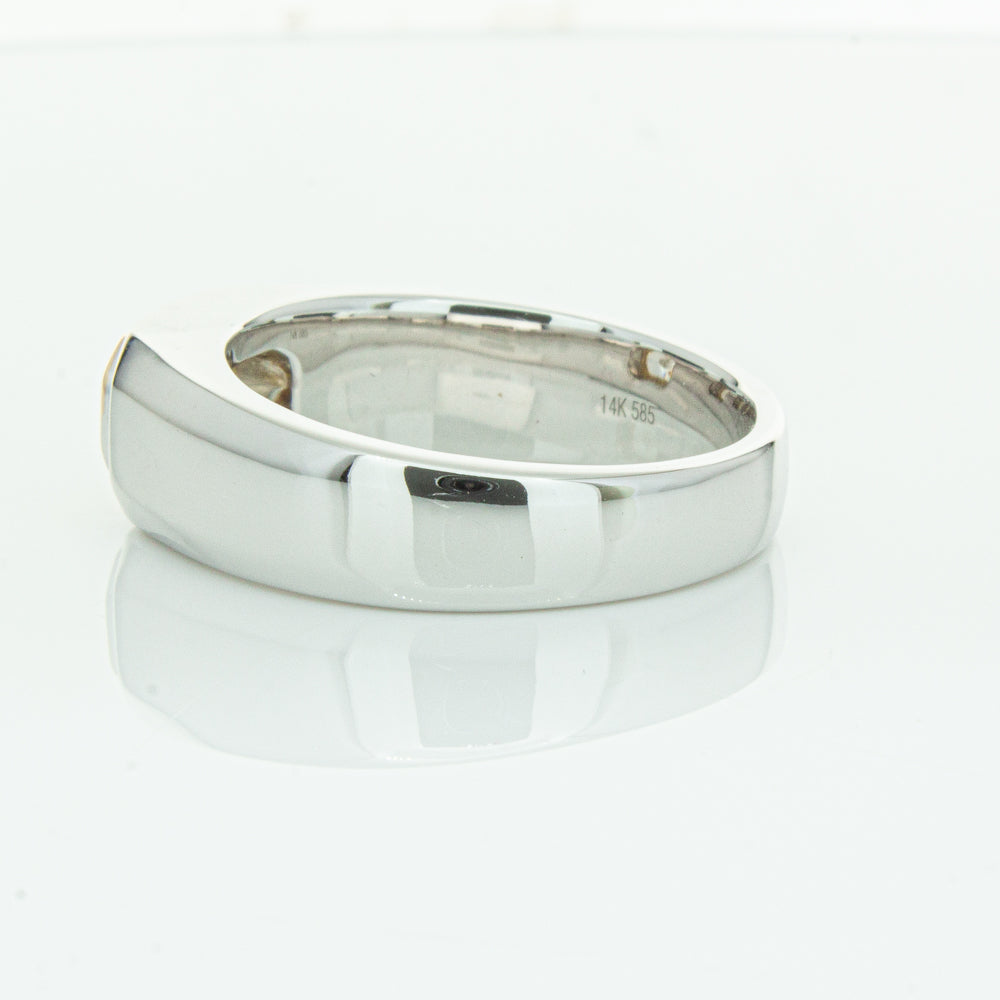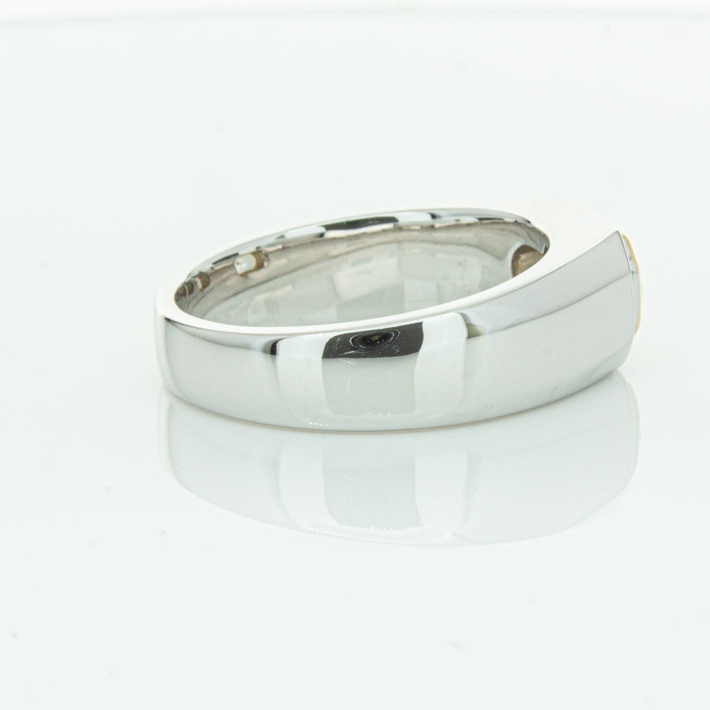 Carefully crafted in 14ct white gold this timeless ring features one radiant cut diamond. with a yellow gold rubover setting