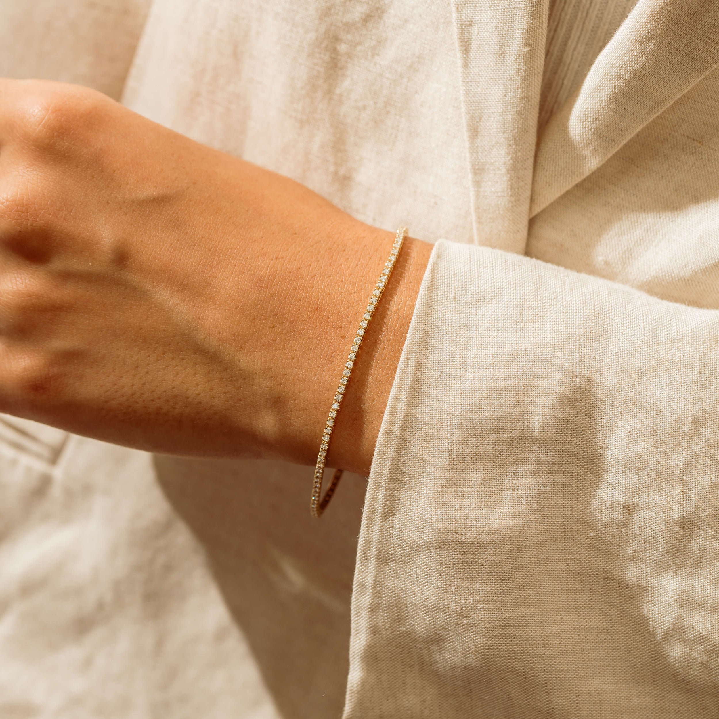 Effortlessly refined, this 14ct yellow gold tennis bracelet is set with 1.00ct of sparkling diamonds, creating a continuous line of light around the wrist. Each diamond is secured in a classic four‑claw setting, allowing maximum brilliance while giving the bracelet a timeless, finely detailed profile. The slim, articulated links move fluidly with the wearer, so the bracelet drapes beautifully whether worn alone or layered with other pieces.
