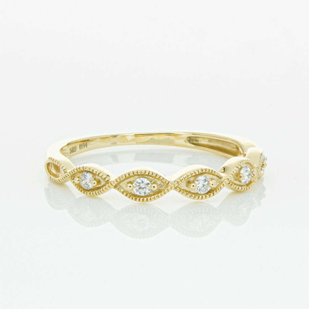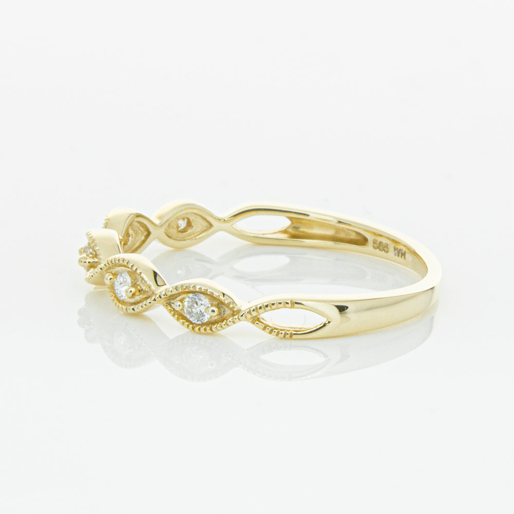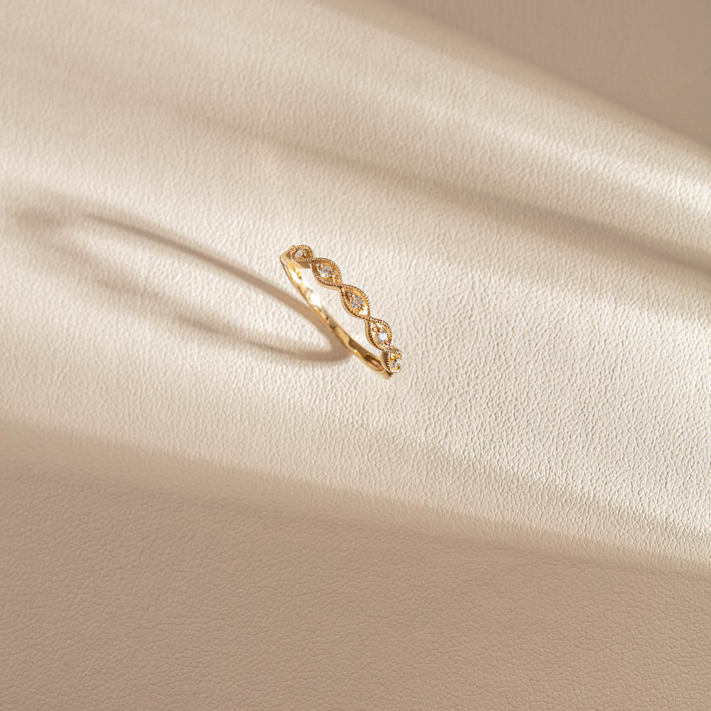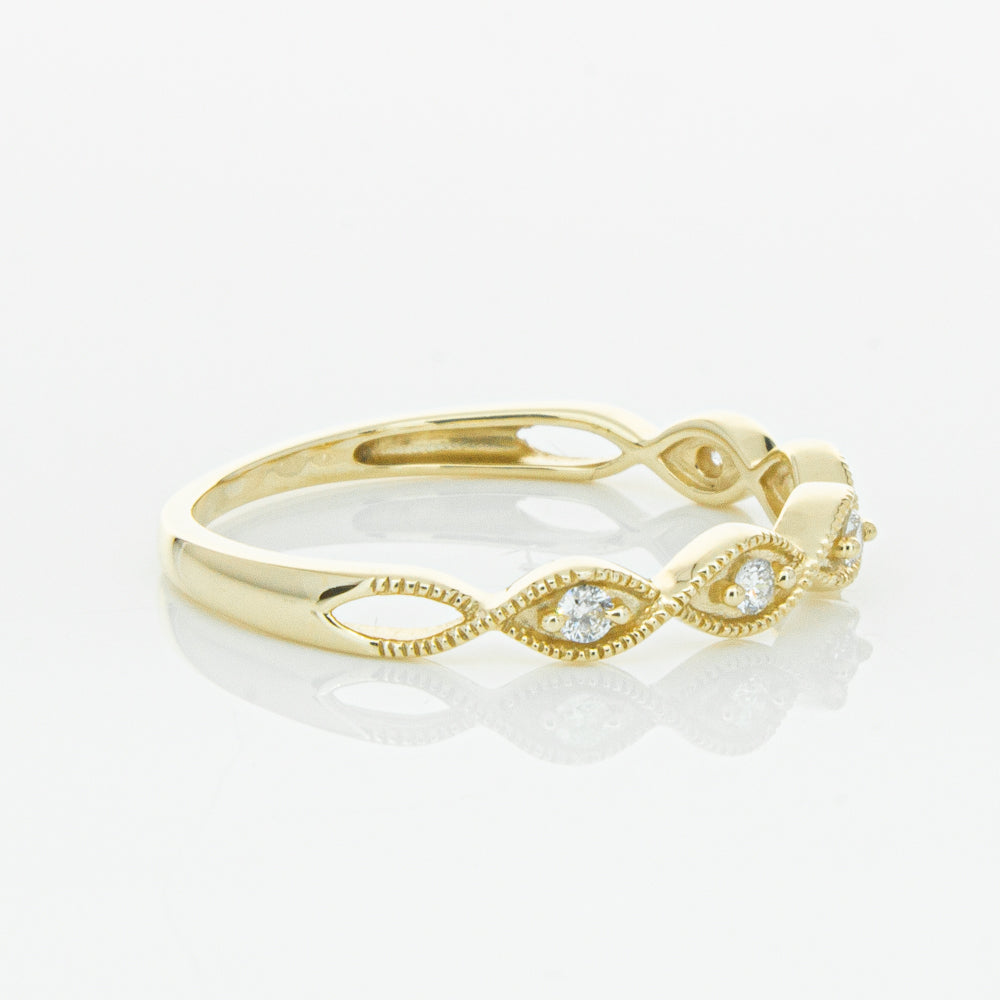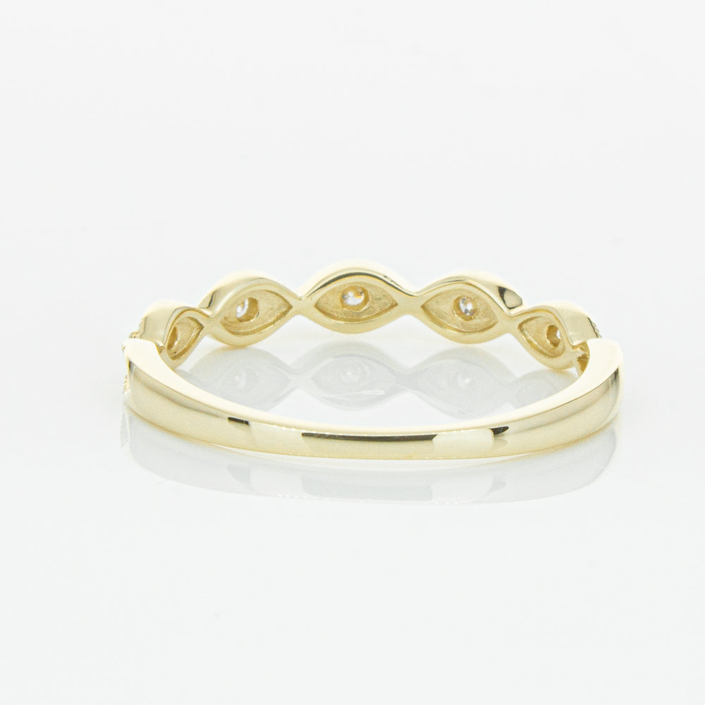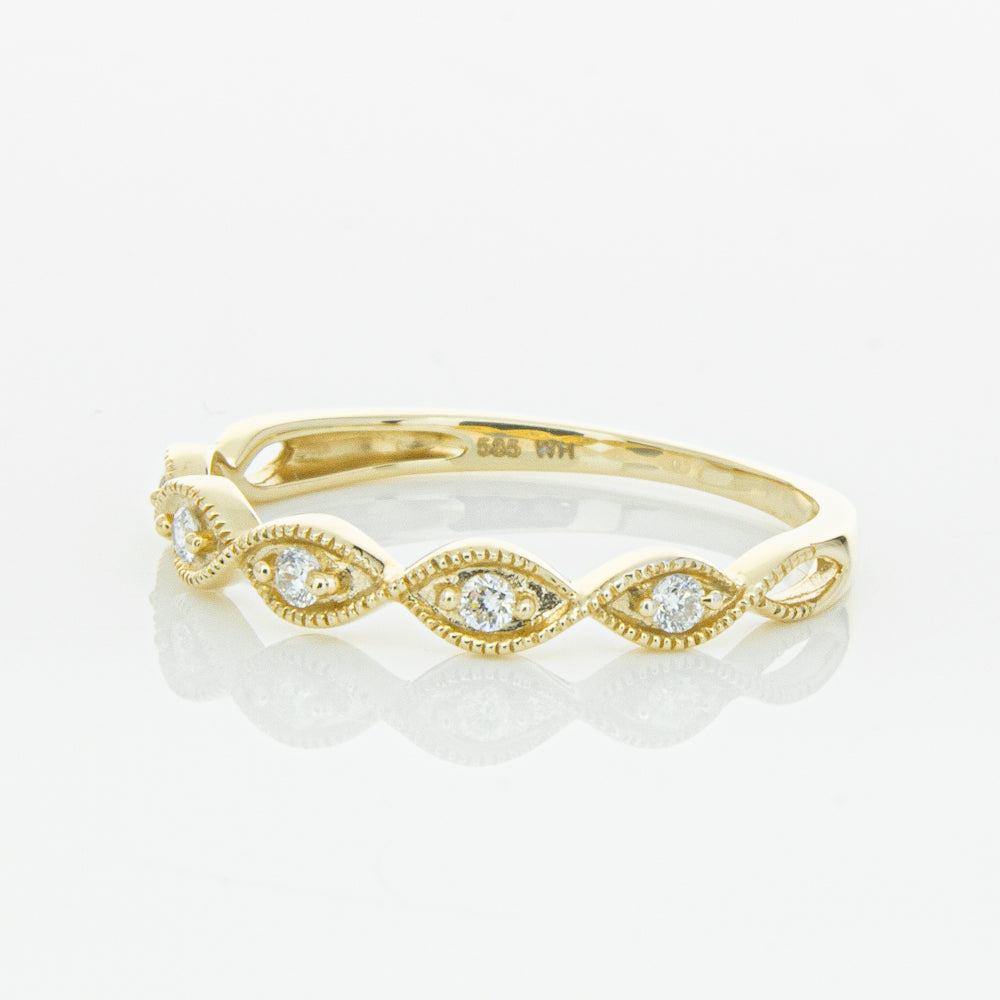 14ct yellow gold Rapunzel eternity band from our Stellar collection featuring marquise shaped motifs with five round brilliant cut diamonds delicately set in a millgrain setting.