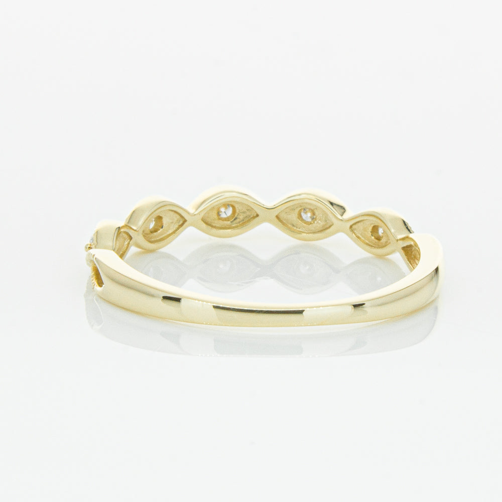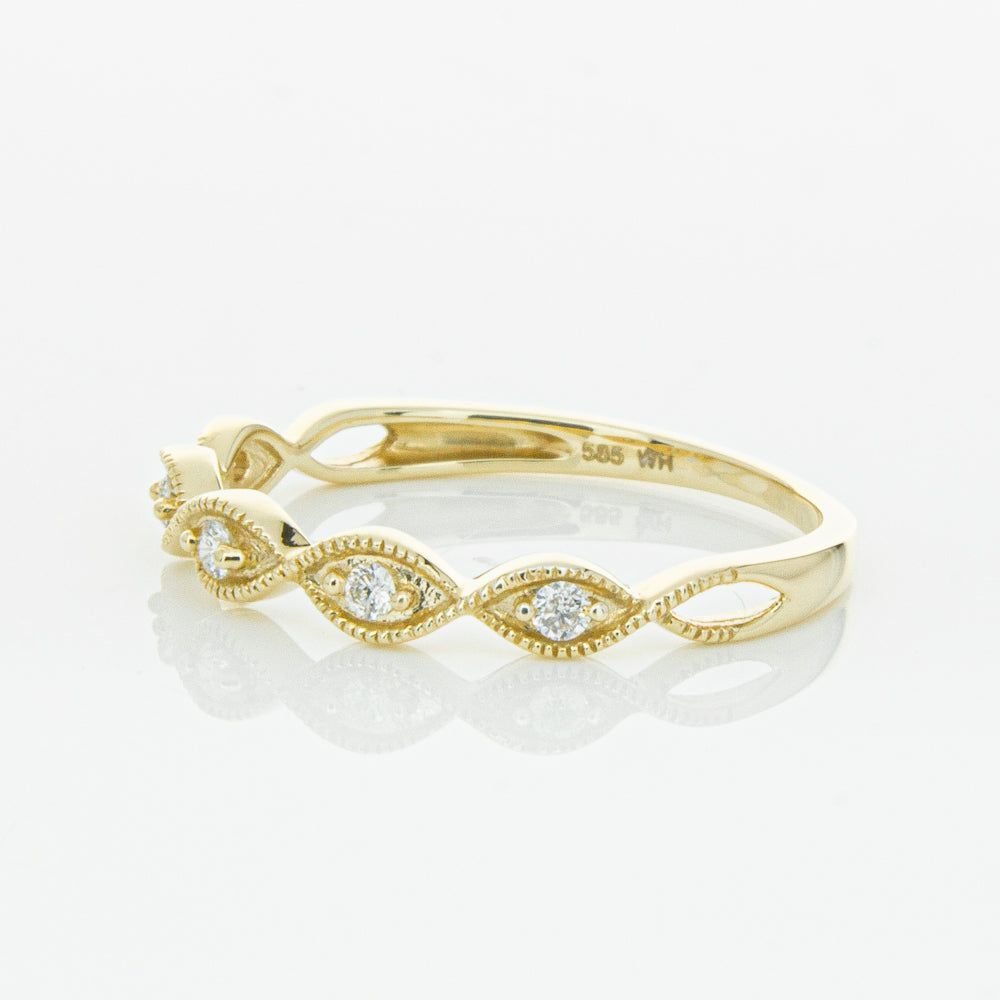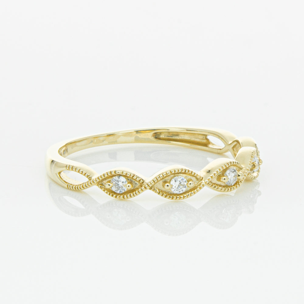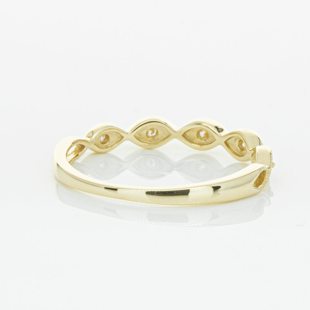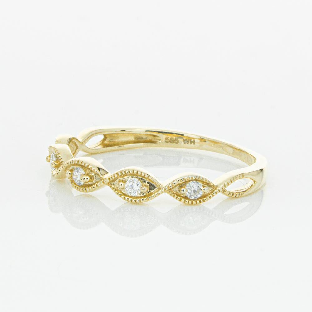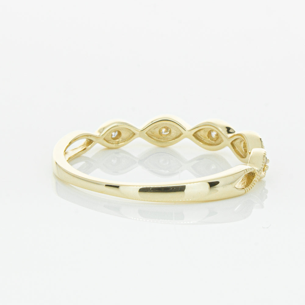 14ct yellow gold Rapunzel eternity band from our Stellar collection featuring marquise shaped motifs with five round brilliant cut diamonds delicately set in a millgrain setting.