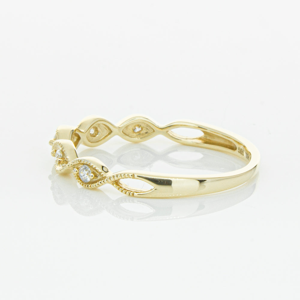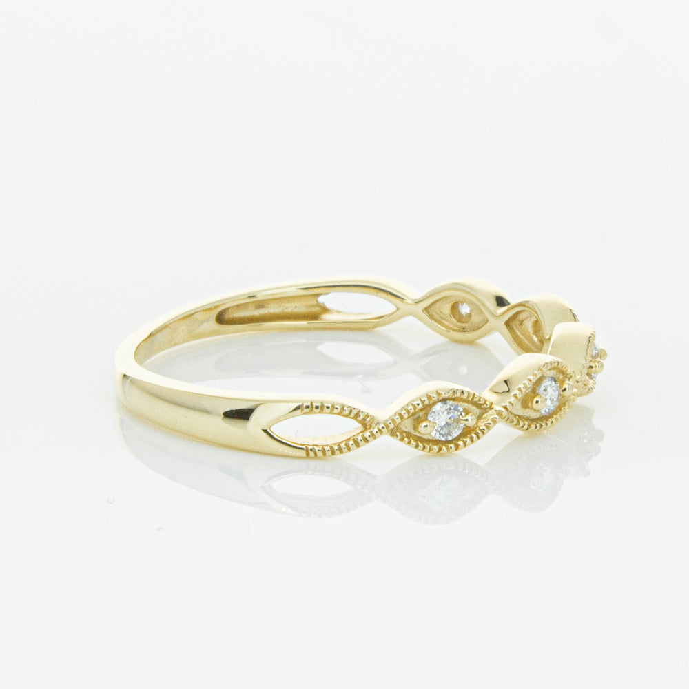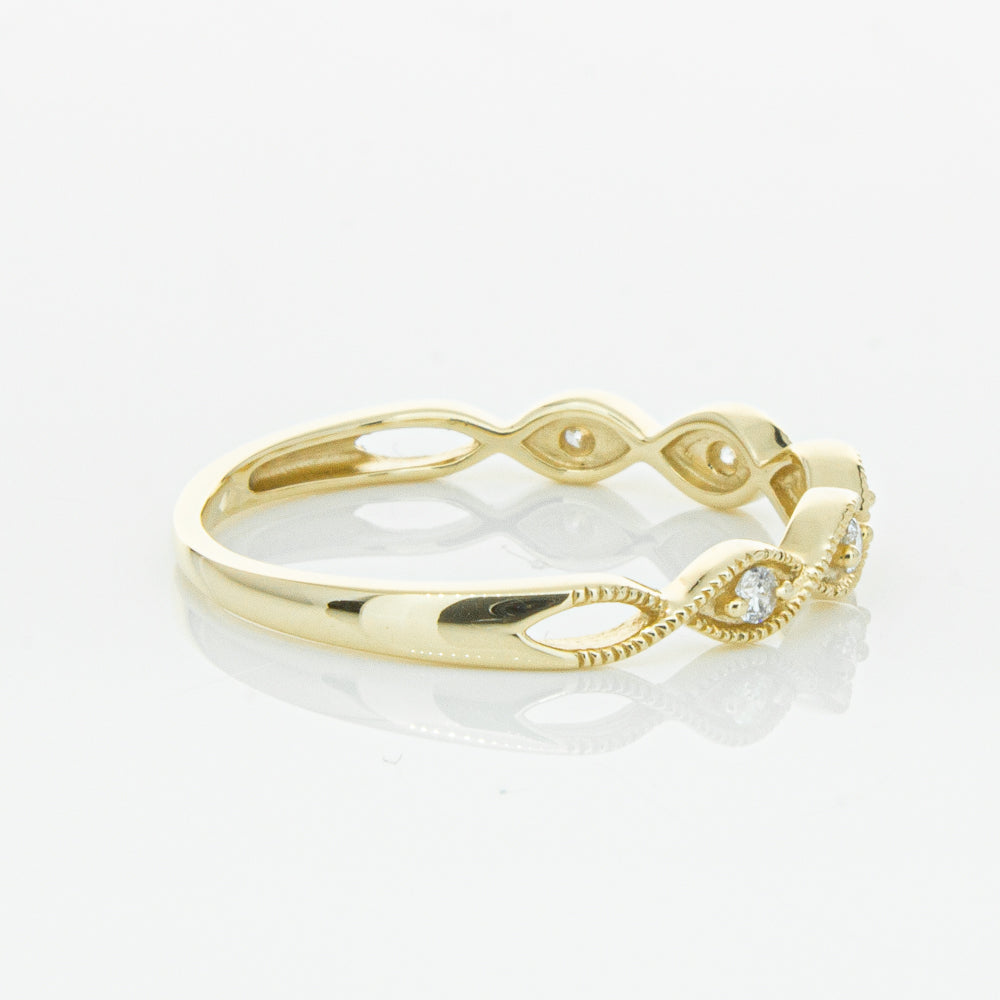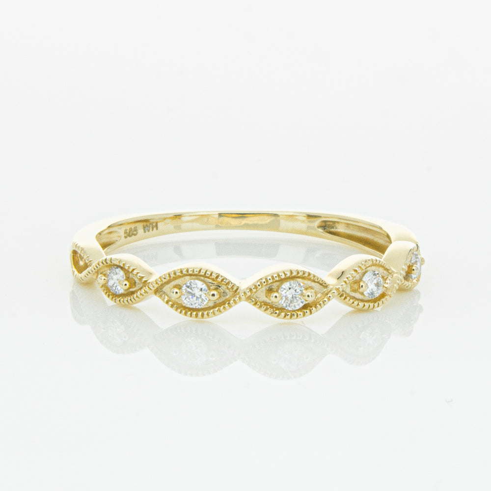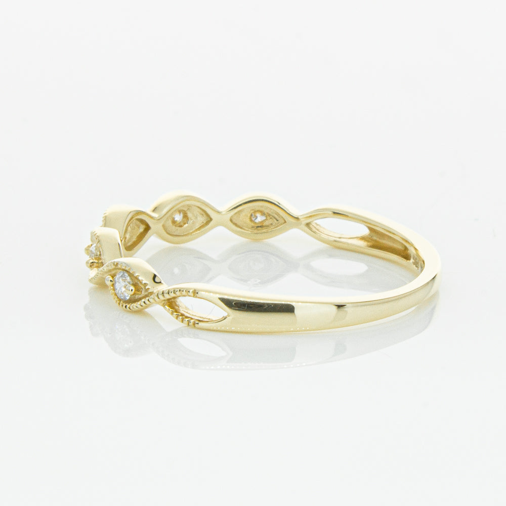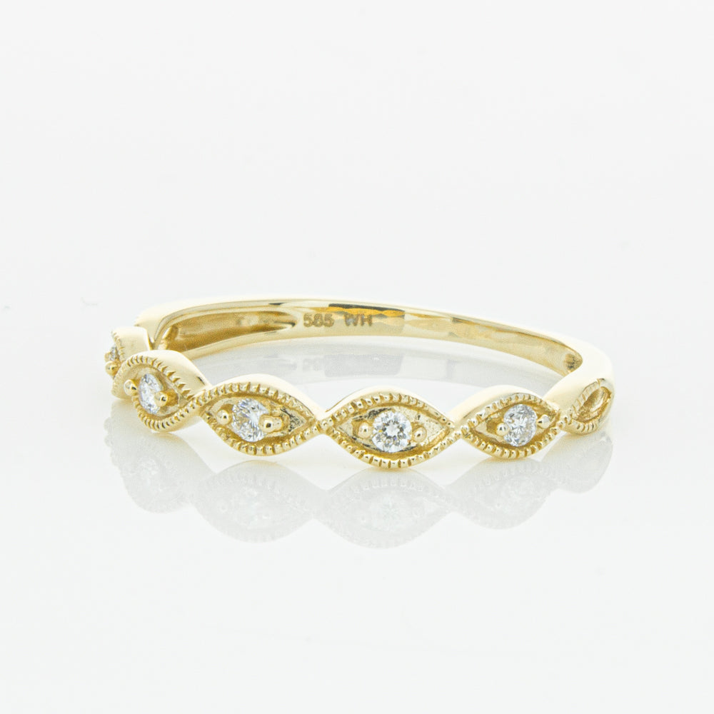 14ct yellow gold Rapunzel eternity band from our Stellar collection featuring marquise shaped motifs with five round brilliant cut diamonds delicately set in a millgrain setting.
