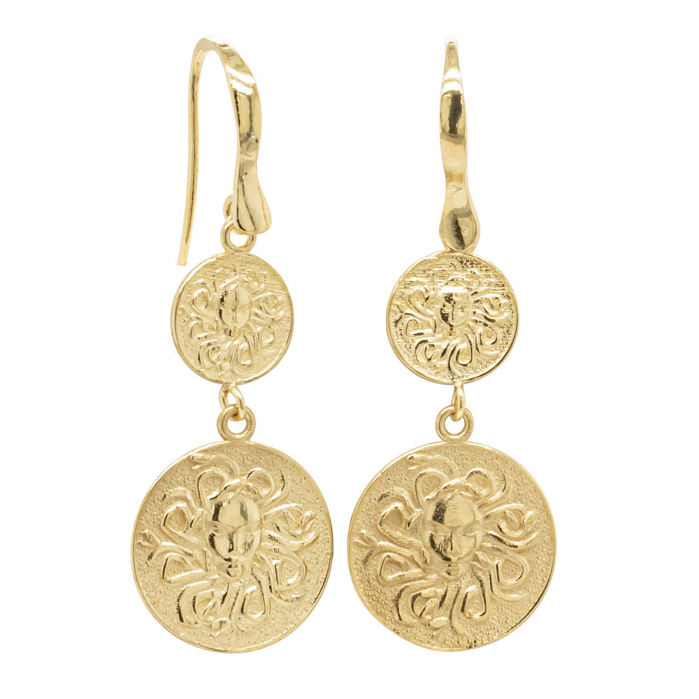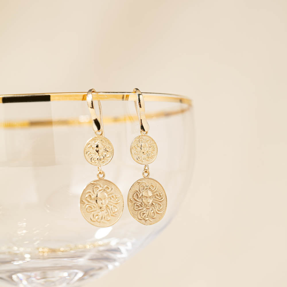 Crafted with precision, these dazzling 14ct yellow gold Medusa drop earrings will add a sophisticated touch to any outfit.