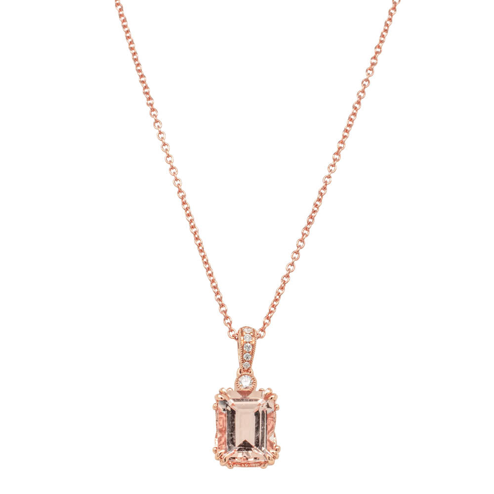 The lush peach-hued morganite in this Romanov pendant flaunts vintage inspired details with an innate artistic flair, glowing in 18ct rose gold from our signature 1899 collection. A diamond set bail provides a luminous finish.
