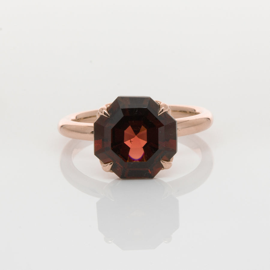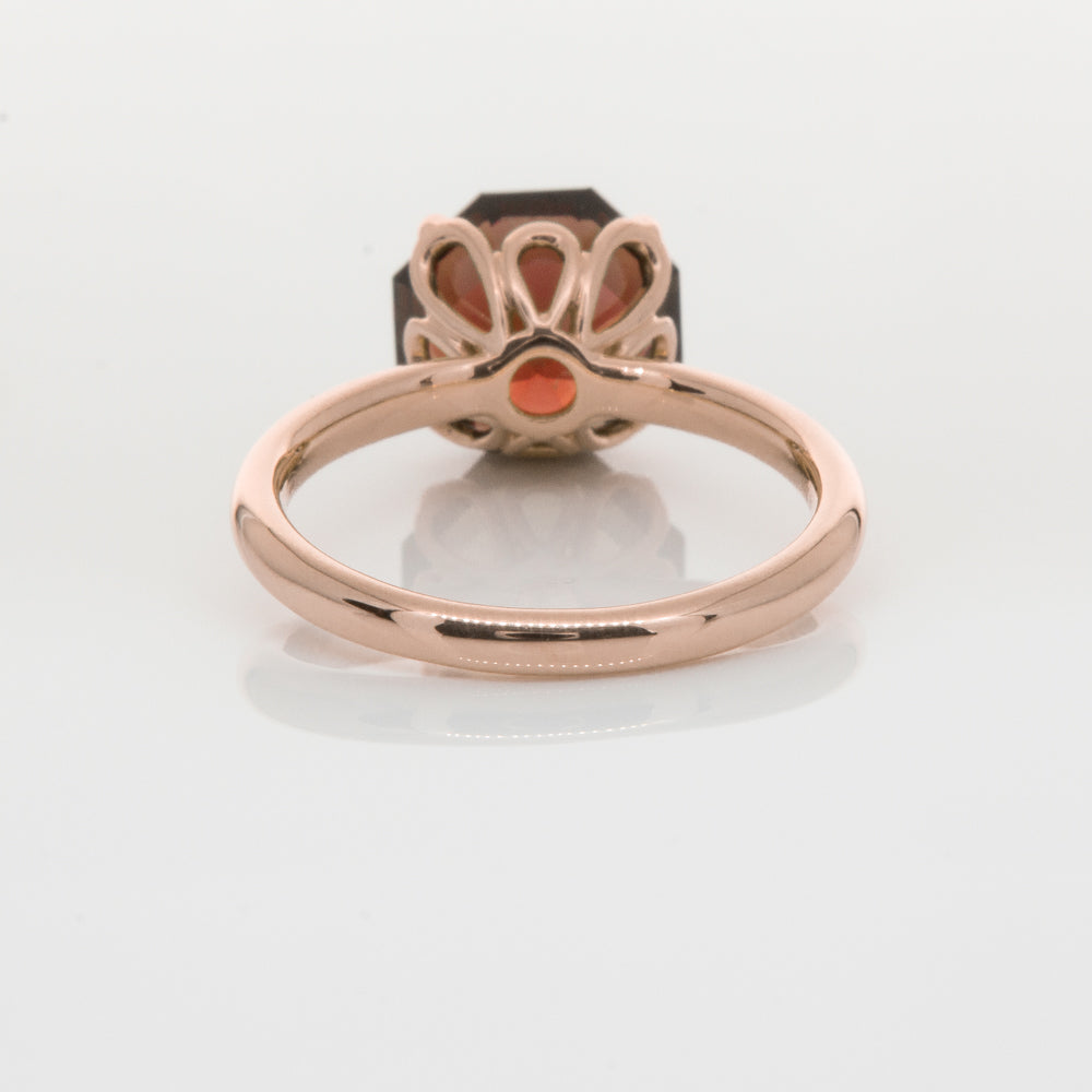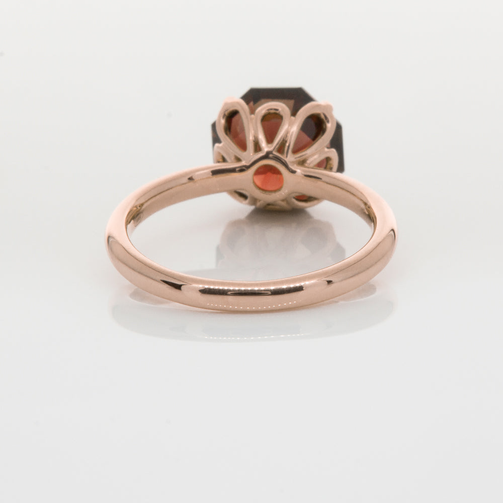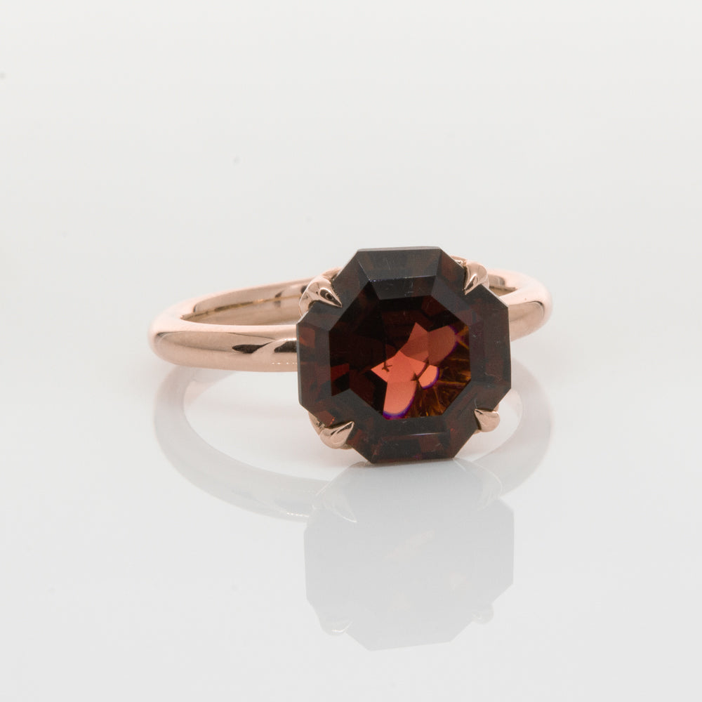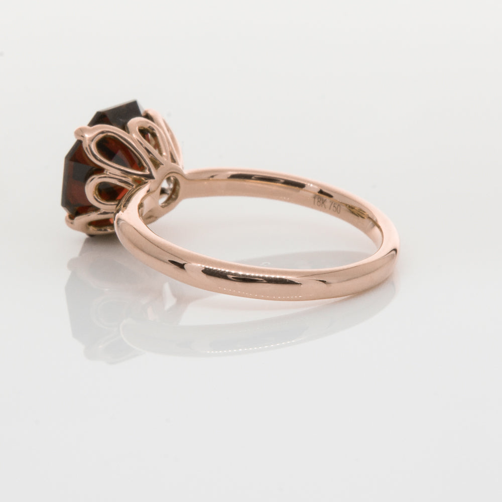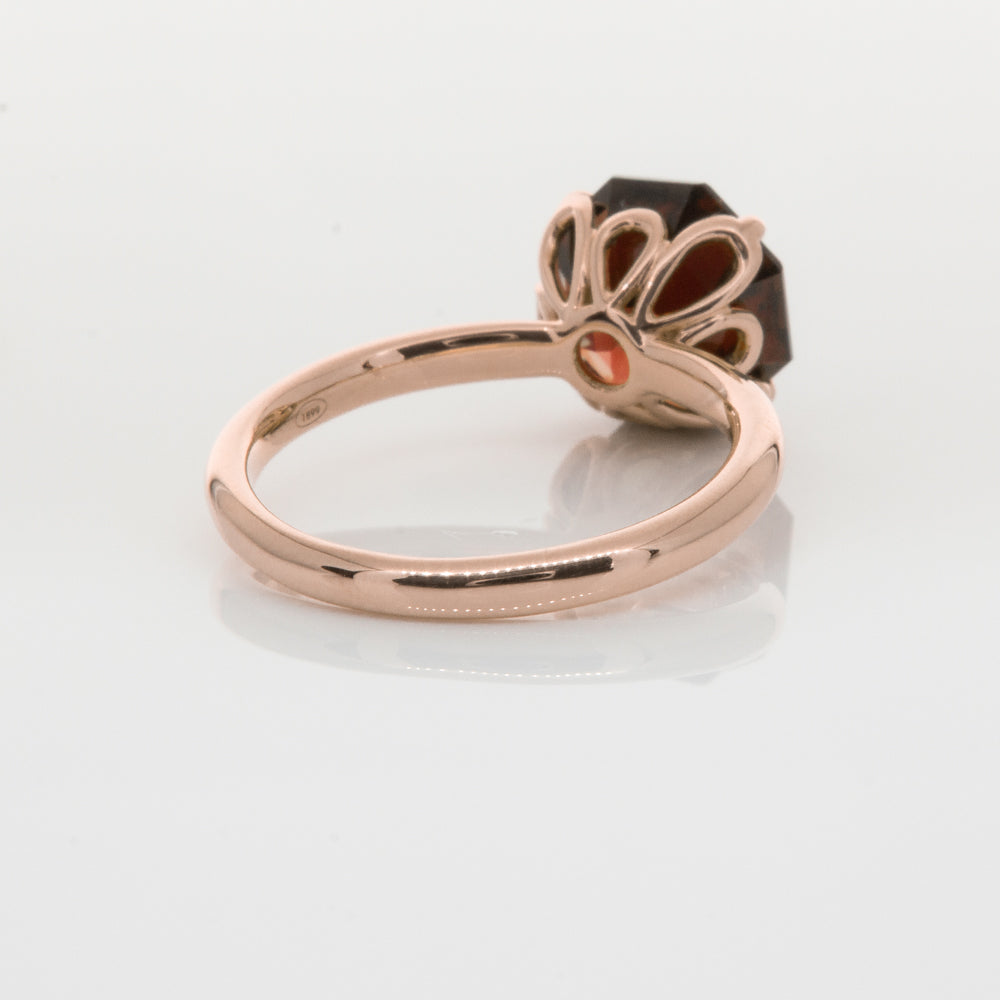 Carefully crafted in 18ct rose gold from our signature 1899 collection, this stunning Octavia ring boasts a custom cut eight-sided garnet resting in eight elegant petals. Simply stunning!