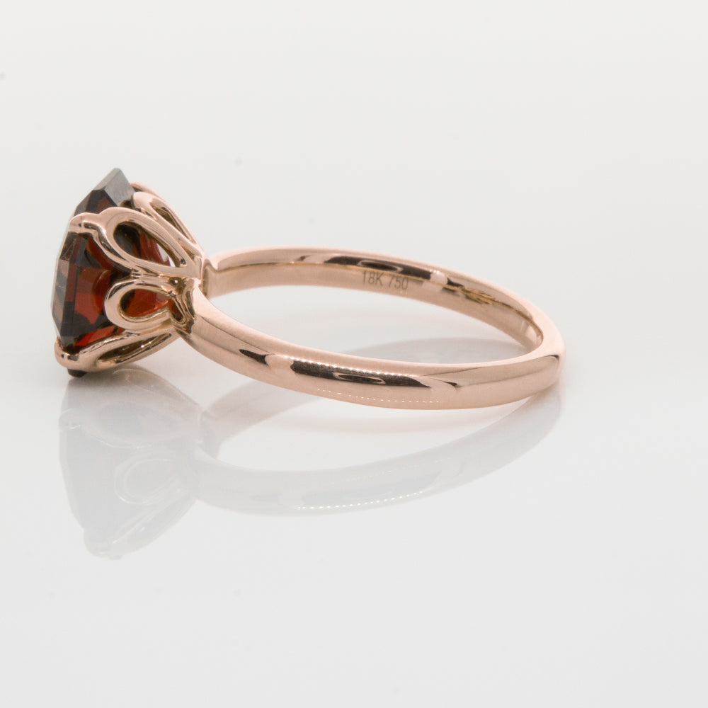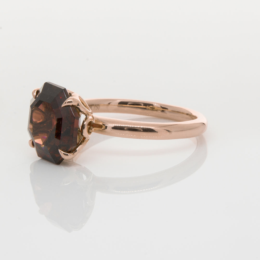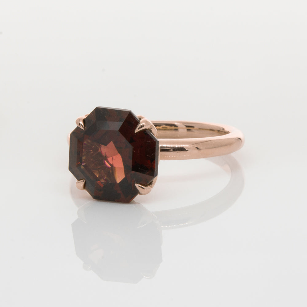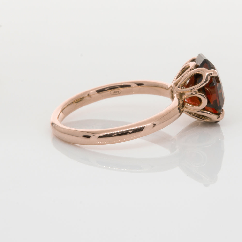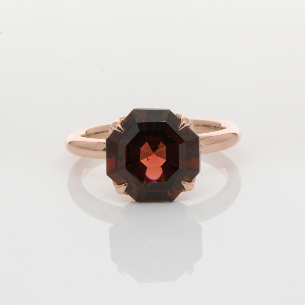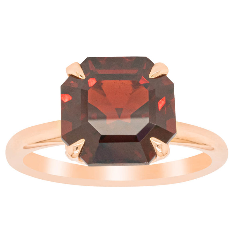 Carefully crafted in 18ct rose gold from our signature 1899 collection, this stunning Octavia ring boasts a custom cut eight-sided garnet resting in eight elegant petals. Simply stunning!