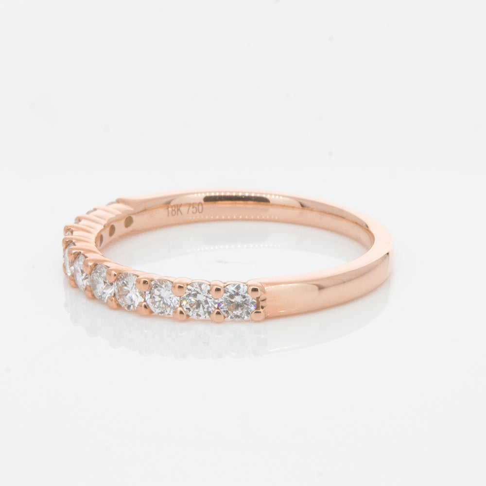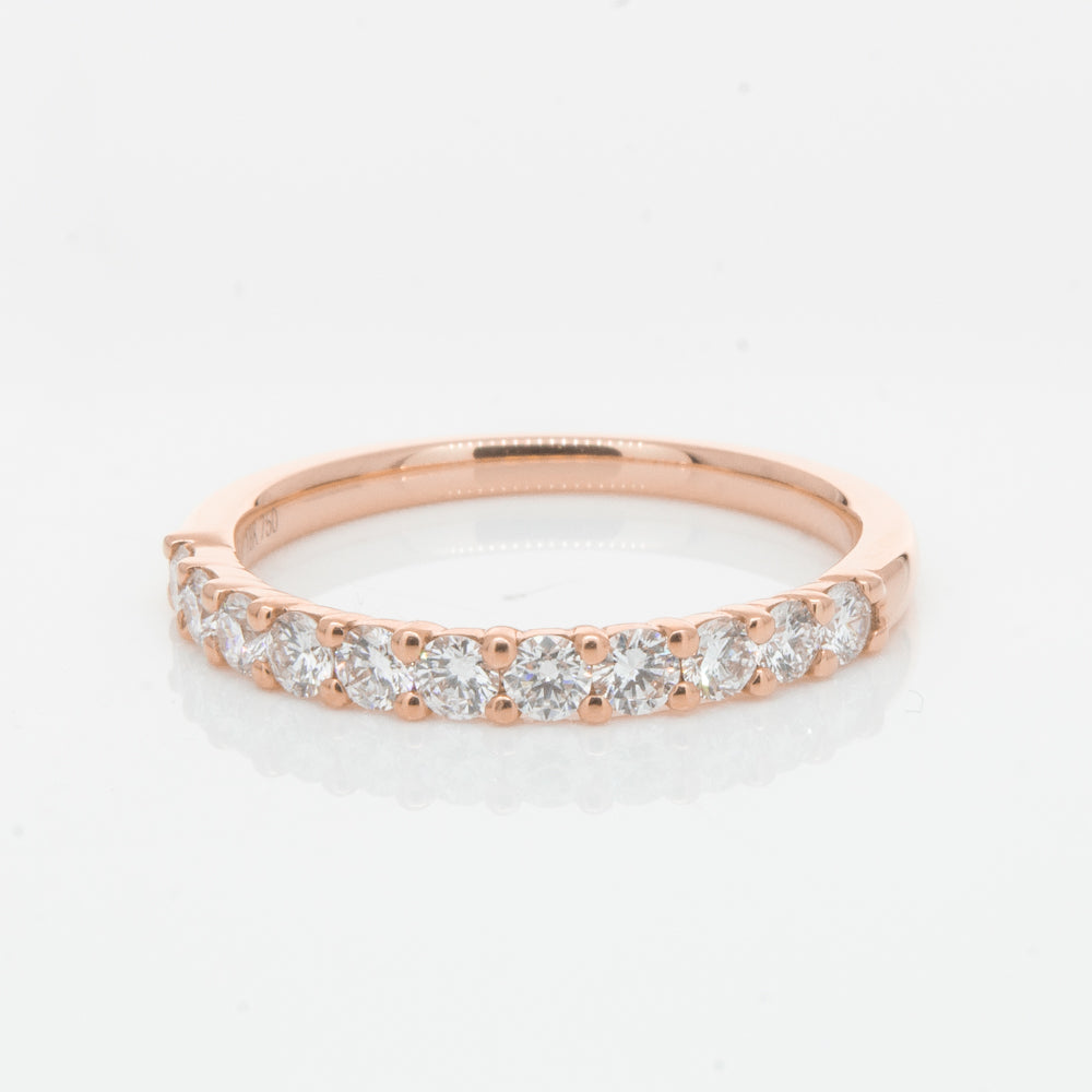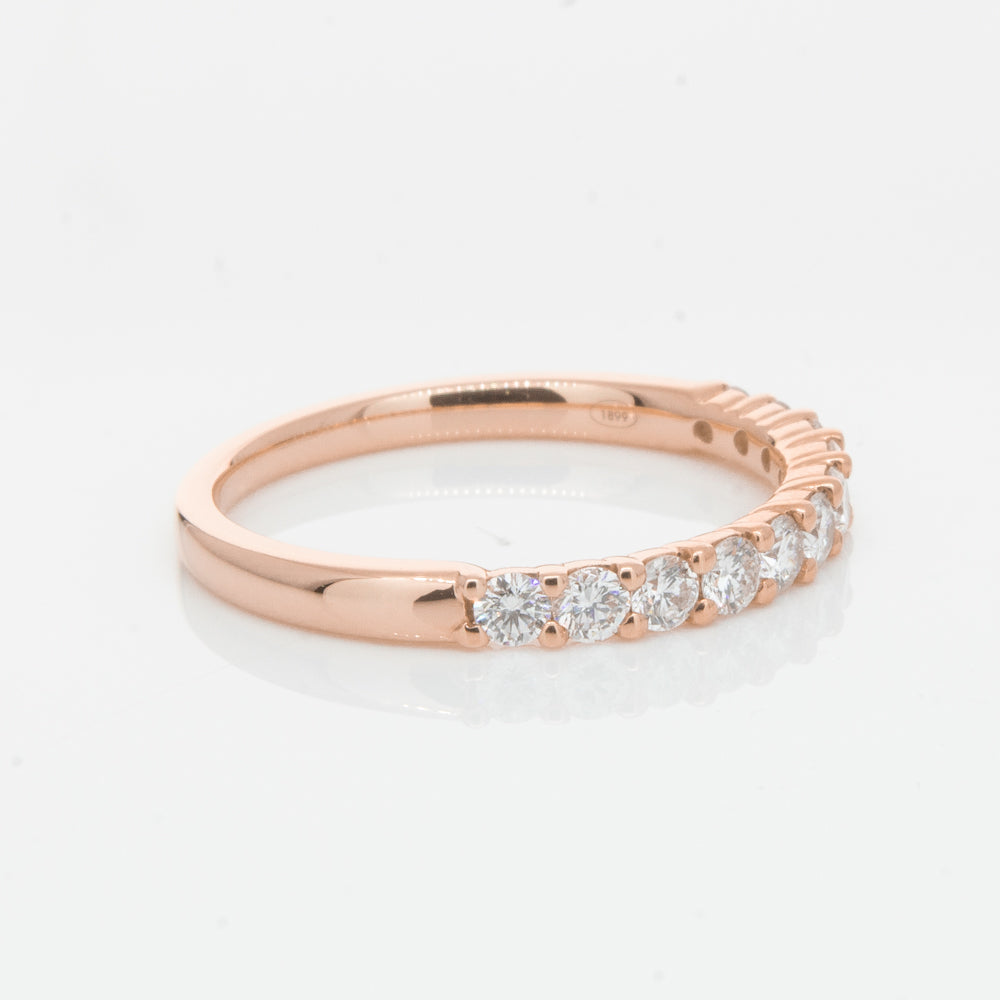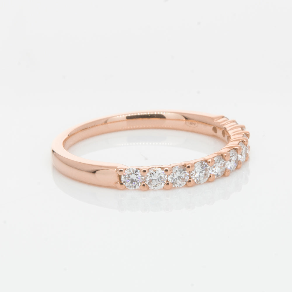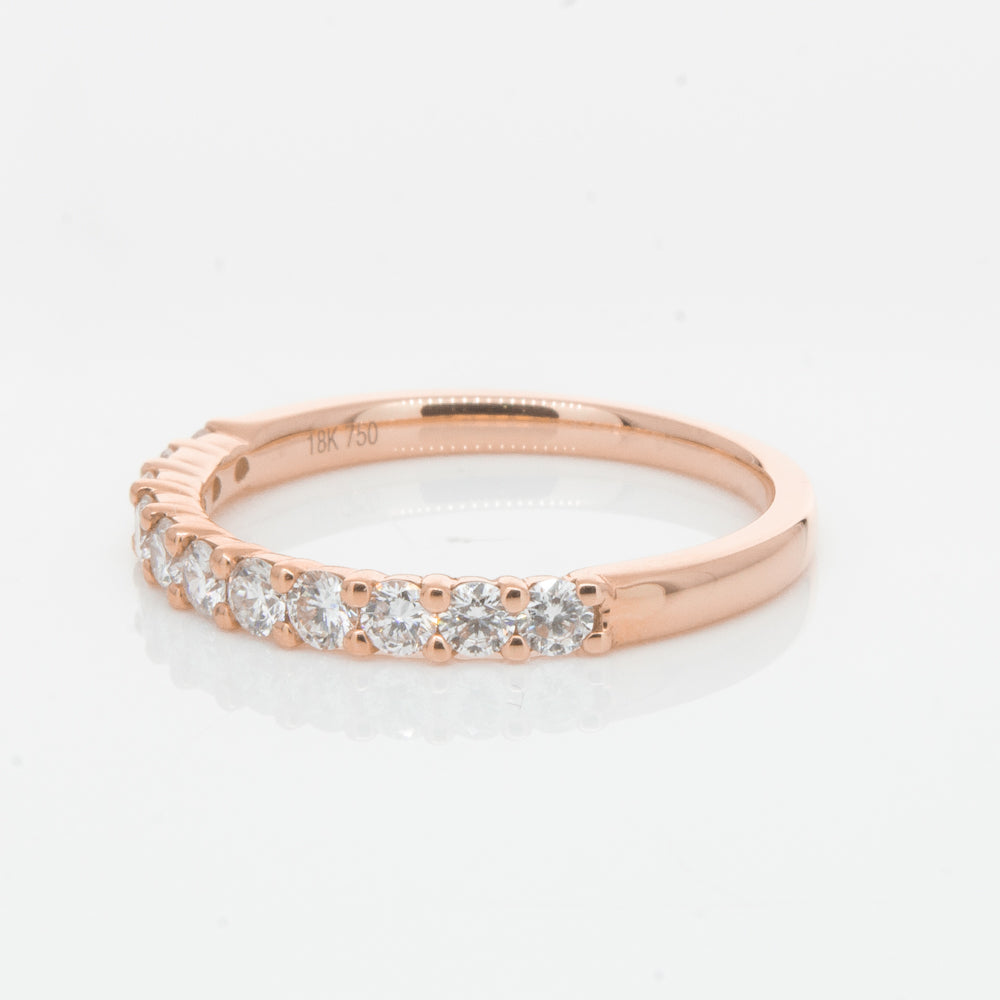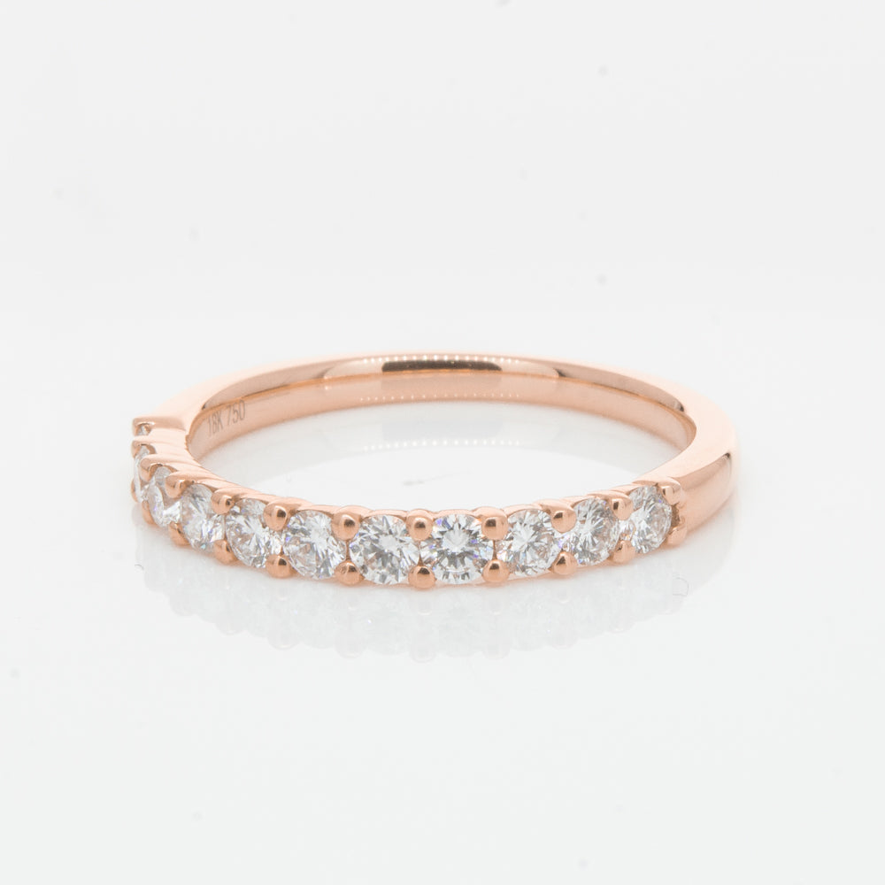 This luxurious 18ct rose gold band boasts 11 shimmering round brilliant cut diamonds resting in elegant claw settings.