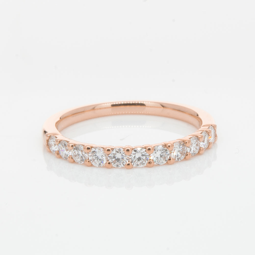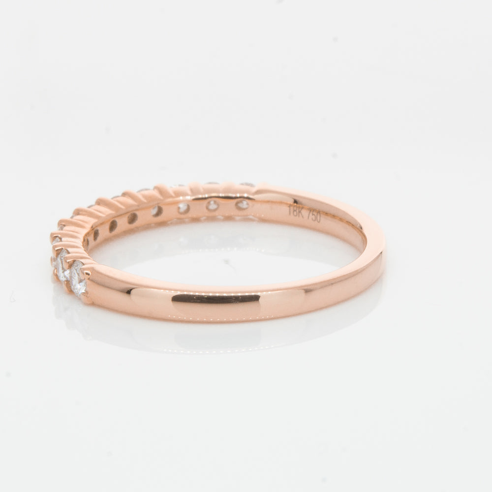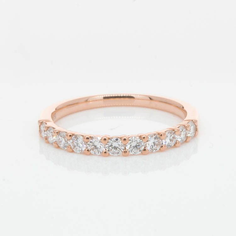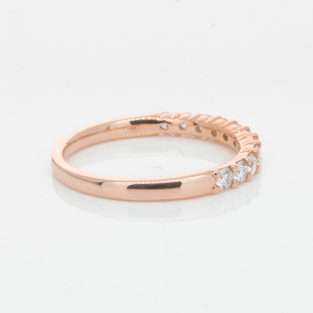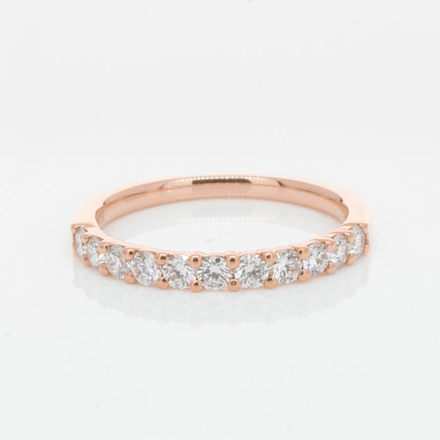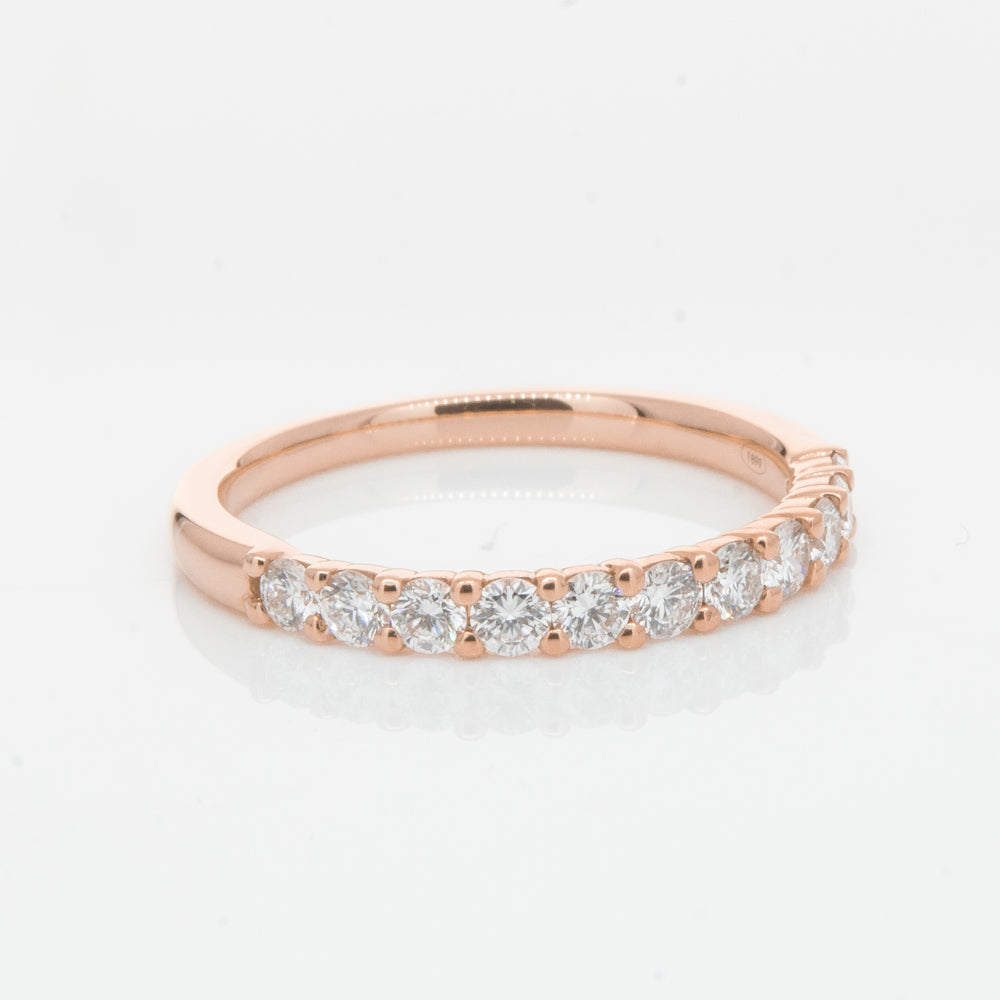 This luxurious 18ct rose gold band boasts 11 shimmering round brilliant cut diamonds resting in elegant claw settings.