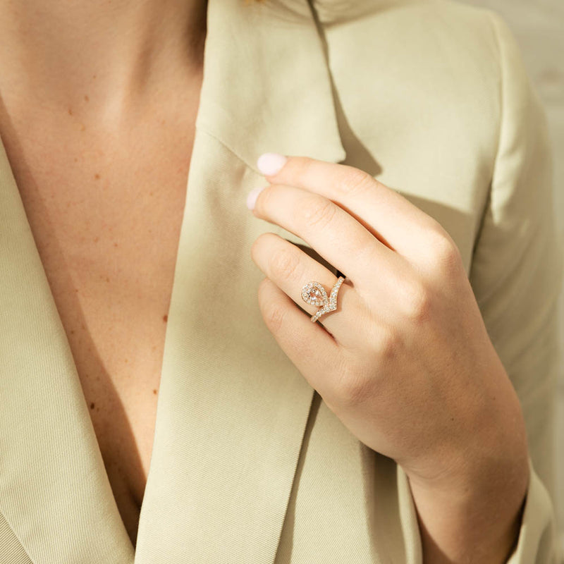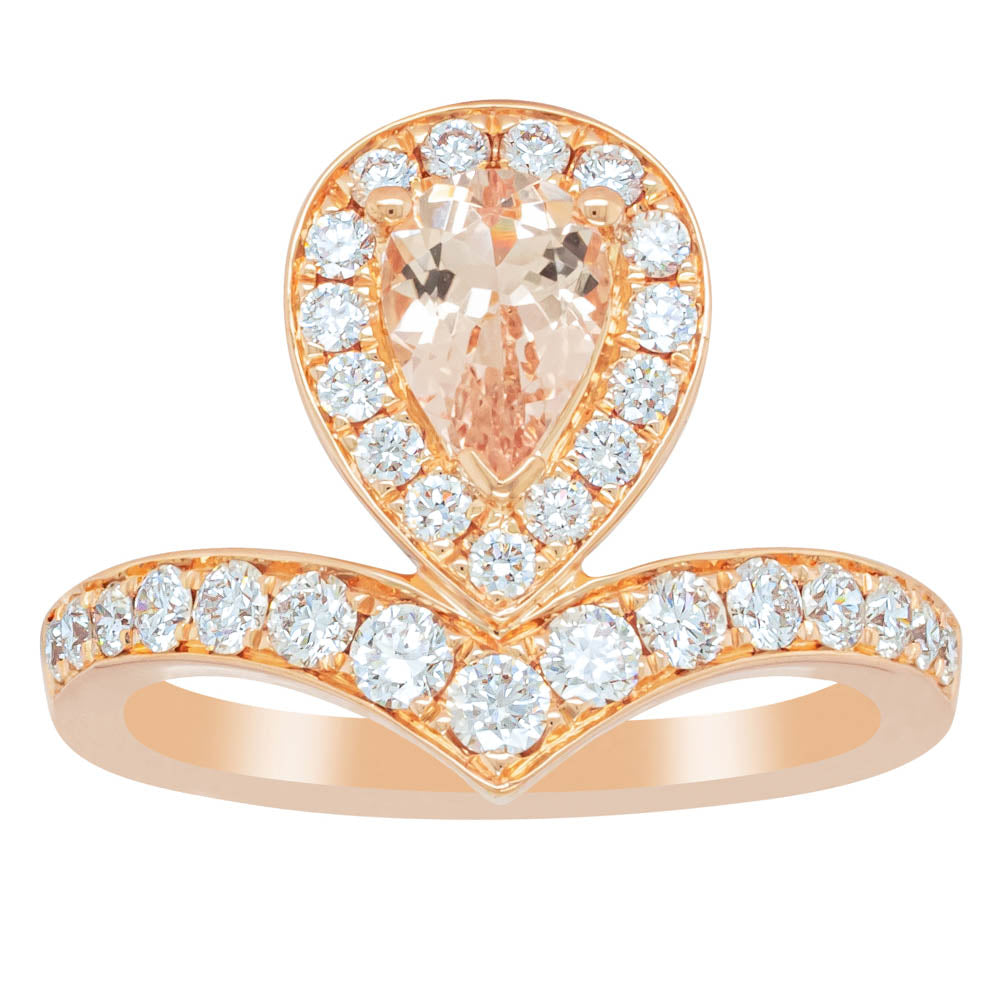 Beautifully crafted in 18ct rose gold, this stunning Tiara ring features one pear cut .56ct morganite framed by a stunning halo of white diamonds with diamond set shoulders with a total diamond weight of .66cts.