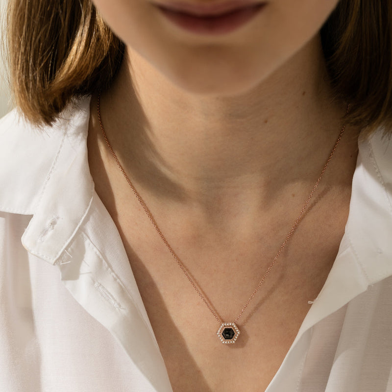 Exceptionally set in beautiful 18ct rose gold, this stunning pendant features one rose cut black diamond framed by a delicate white diamond halo.