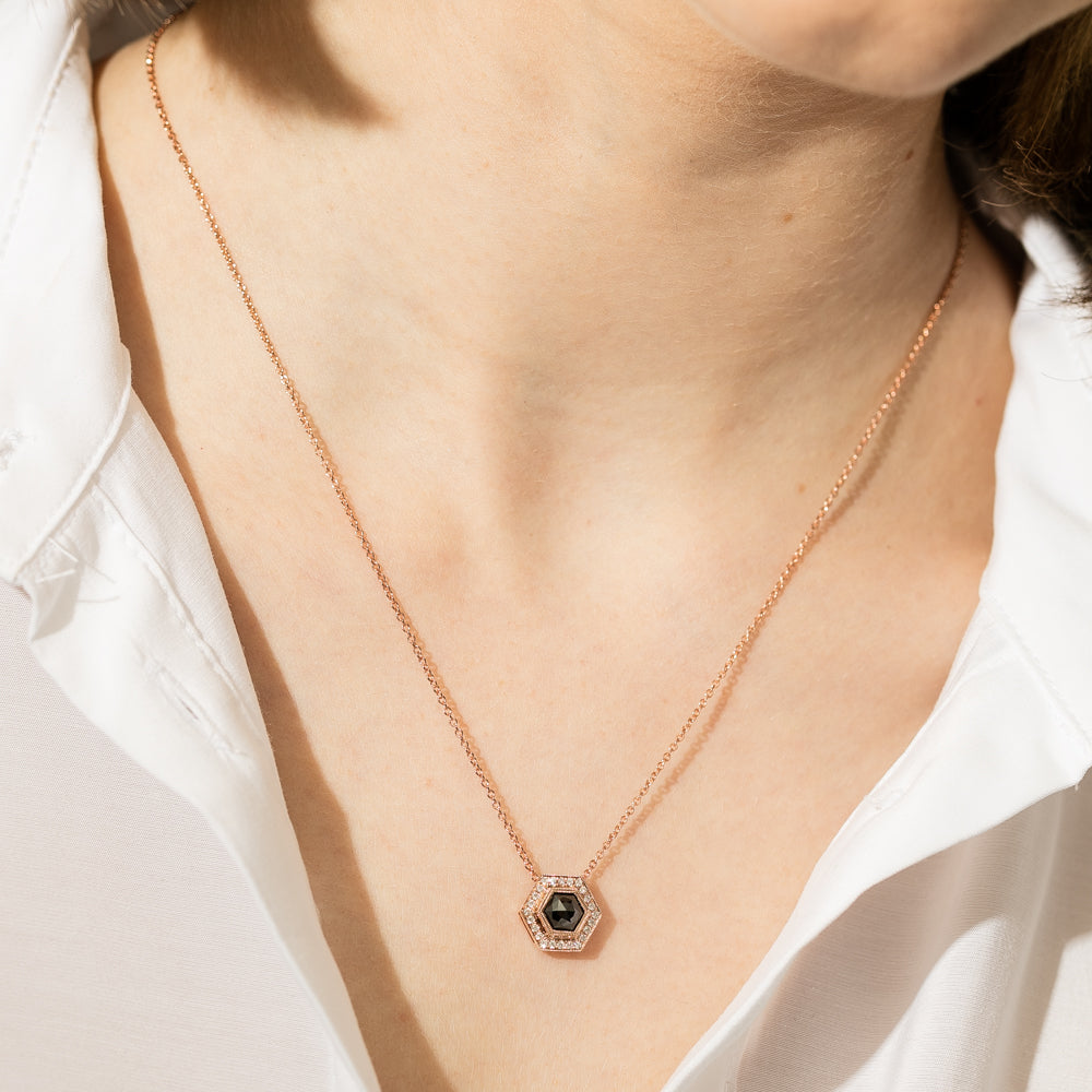 Exceptionally set in beautiful 18ct rose gold, this stunning pendant features one rose cut black diamond framed by a delicate white diamond halo.