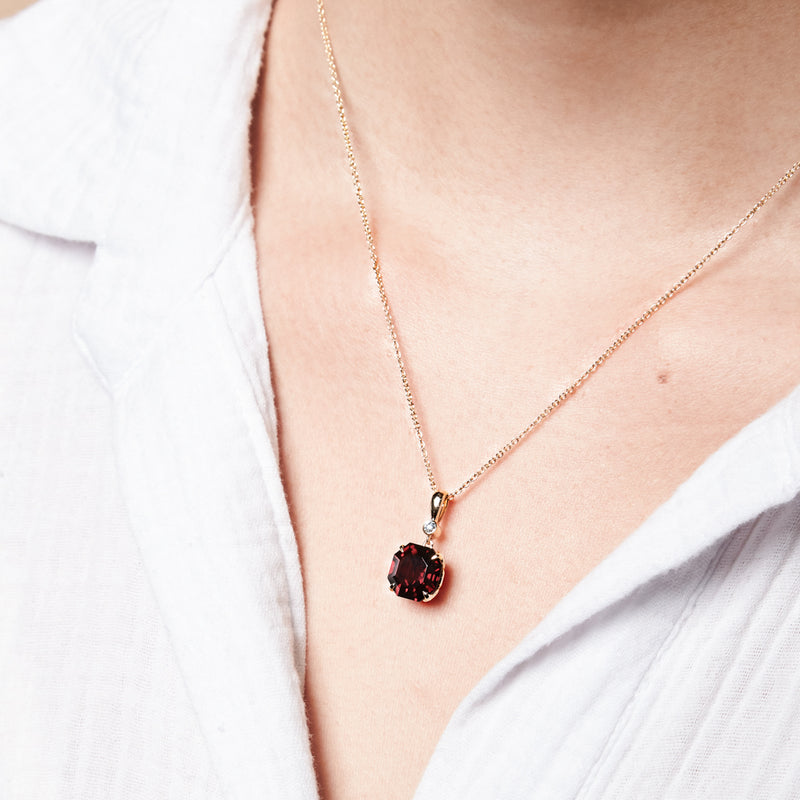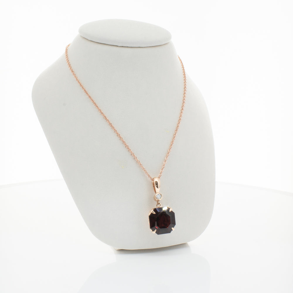 Carefully crafted in 18ct rose gold from our signature 1899 collection, this stunning Octavia pendant boasts a custom cut eight-sided garnet with one round brilliant cut diamond.