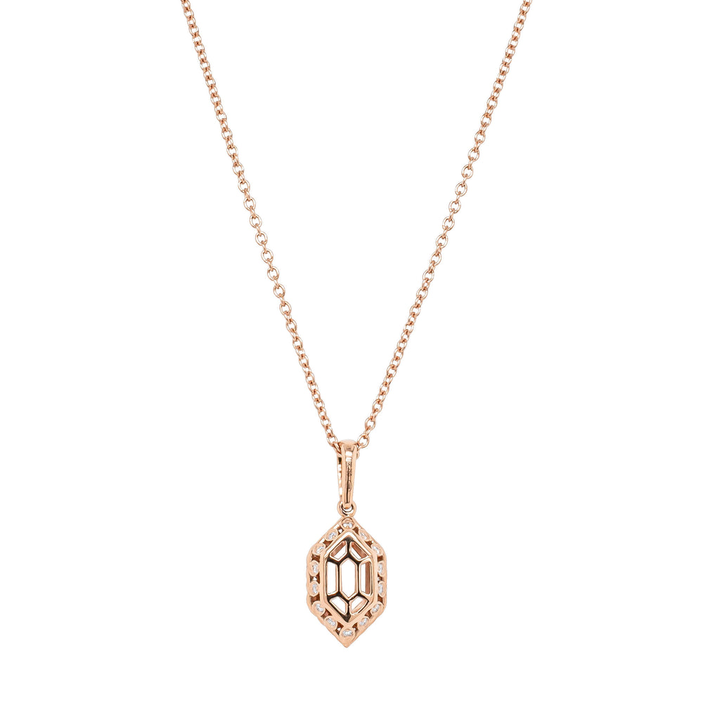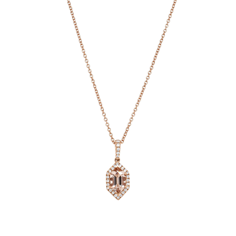 View BagSoft peach hued hexagonal cut morganite combines with exceptional sparkle to make a luminous statement in this gorgeous mini Sierra pendant crafted in 18ct rose gold from our signature 1899 collection.
