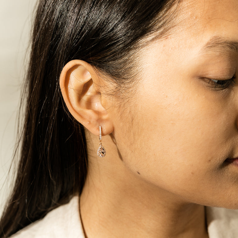 Light up the room with these sophisticated morganite and diamond earrings. Hand crafted in 18ct rose gold, these beautiful earrings boast two pear faceted morganites. Each morganite is framed by a halo of diamonds.