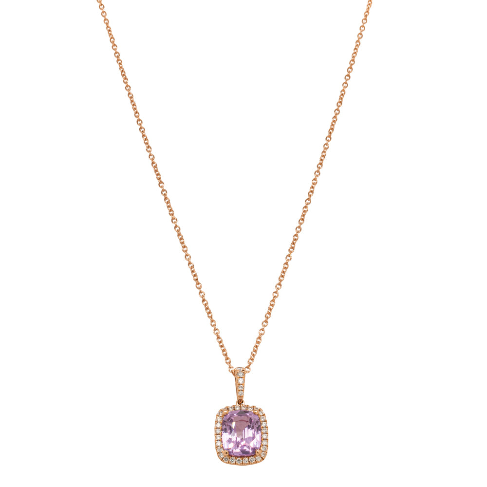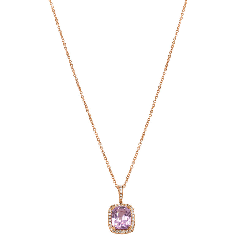 View BagLively in colour, this 3.02ct cushion faceted purple sapphire from Sri Lanka combines with exceptional sparkle to make a luminous statement in this gorgeous Sierra pendant. Crafted in beautiful 18ct rose gold from our signature 1899 collection. The sapphire has a light strong purple colour and is accompanied by 47 round brilliant cut diamonds.