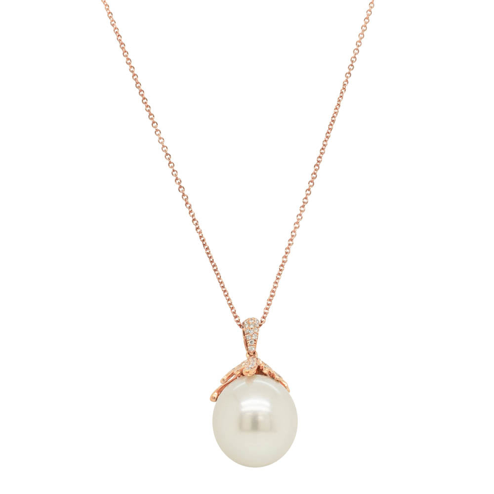 18ct Rose gold pendant features a South Sea Pearl in a diamond set claw style mount.