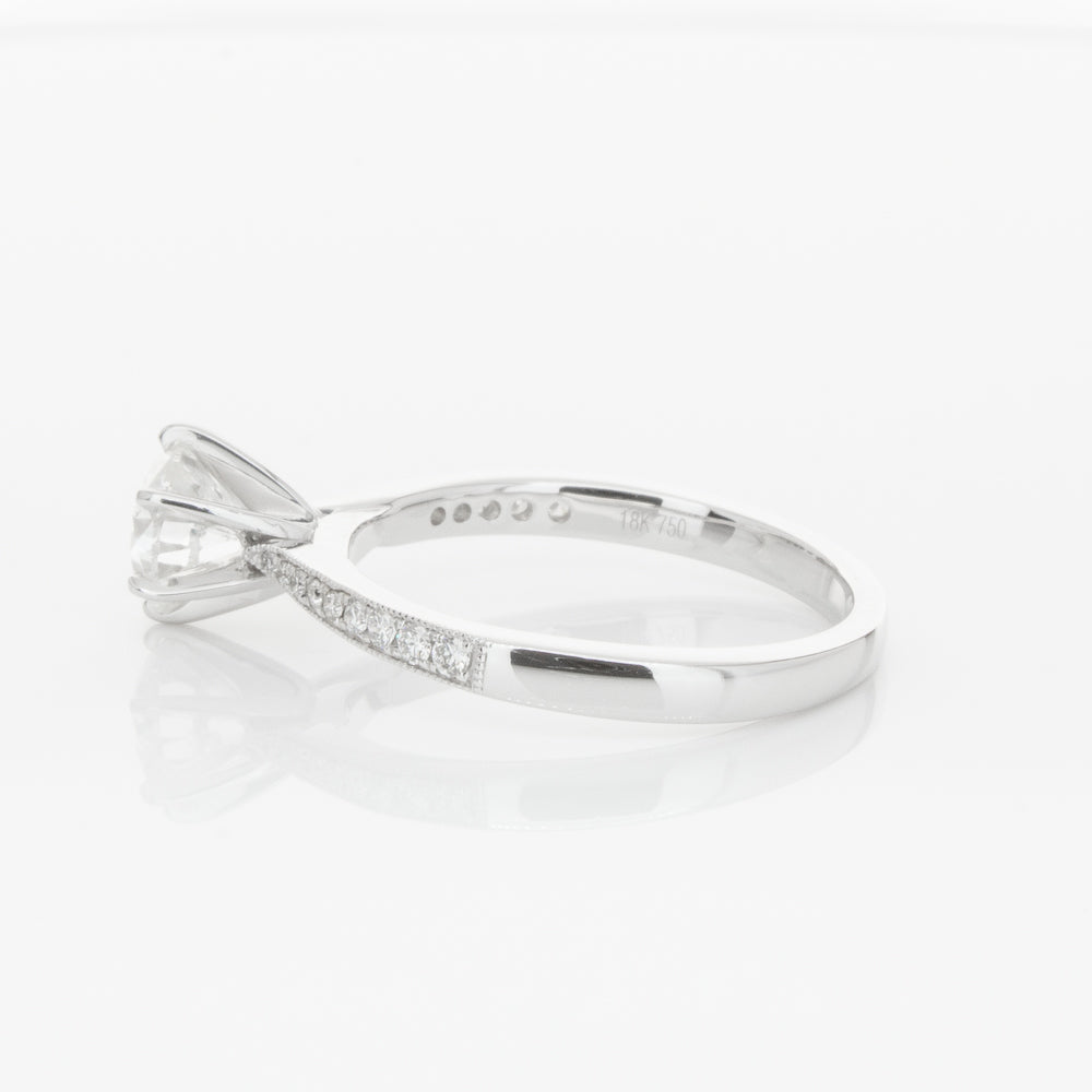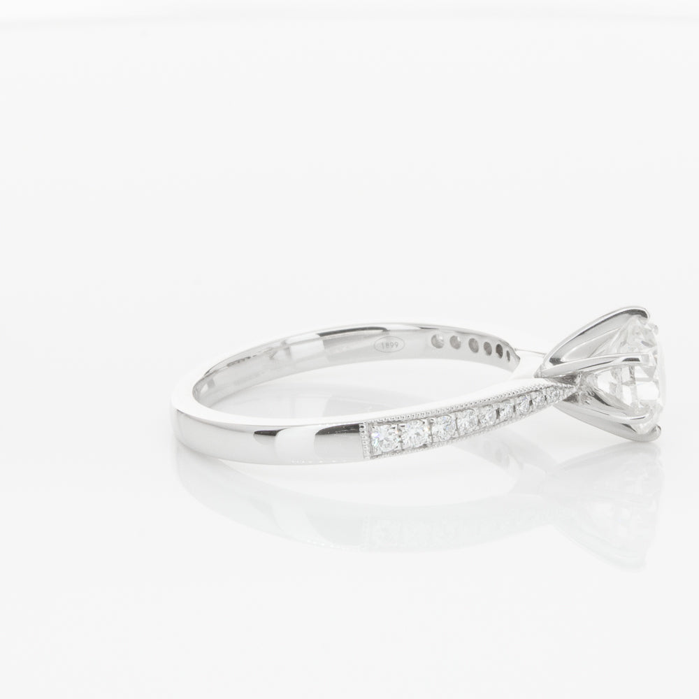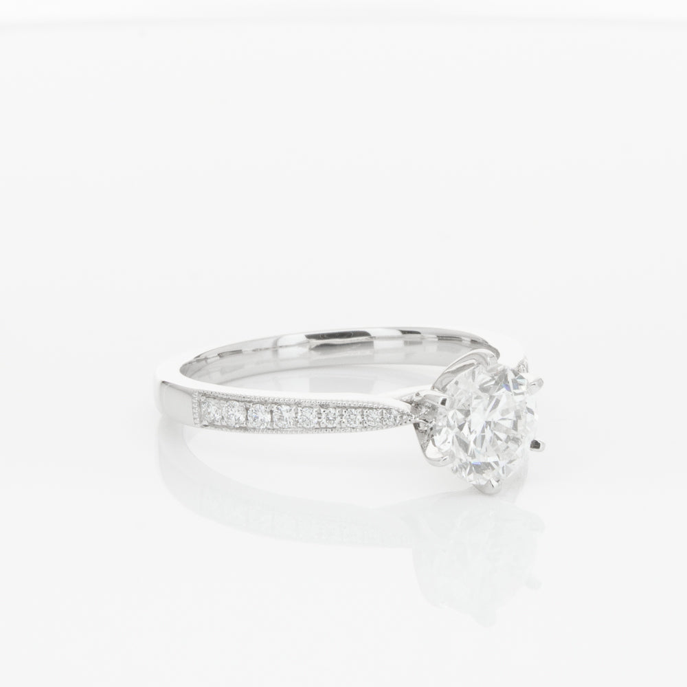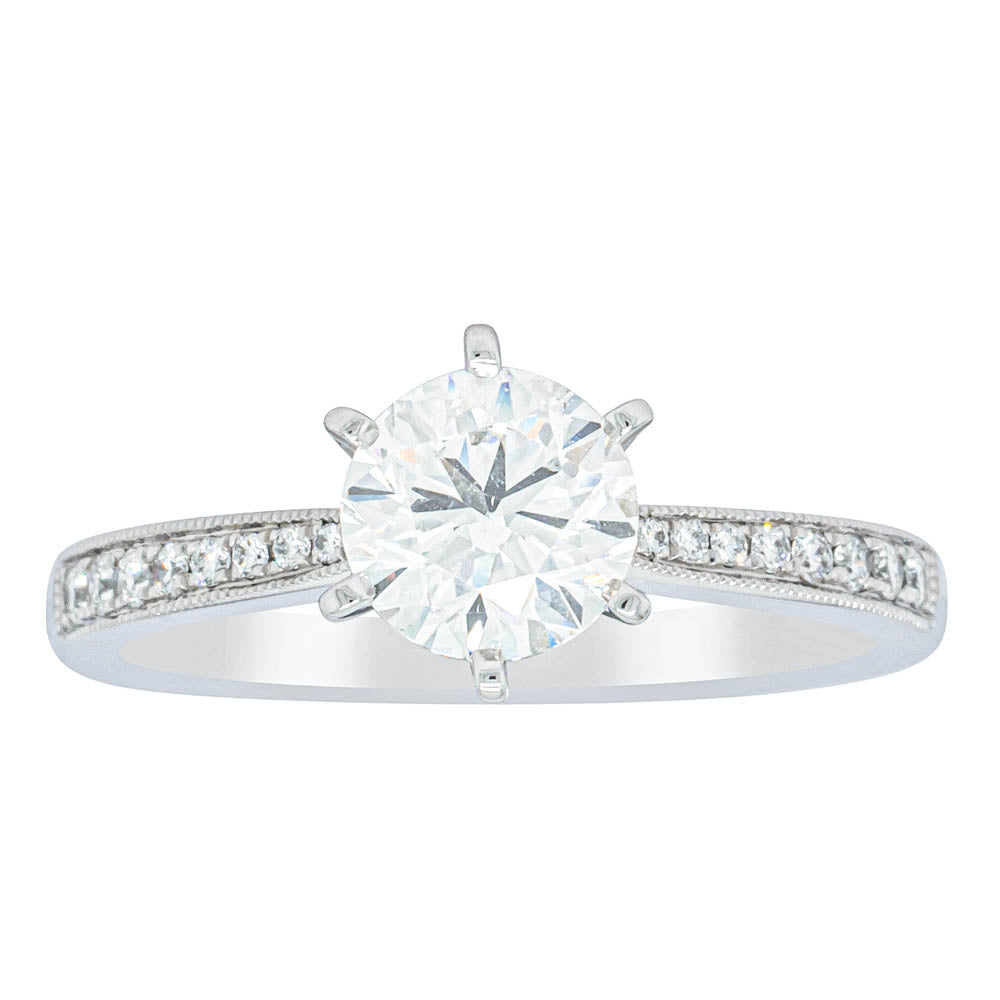 A delicate diamond set band with milgrain detailing, tapers towards the zenith to showcase a sparkling diamond.