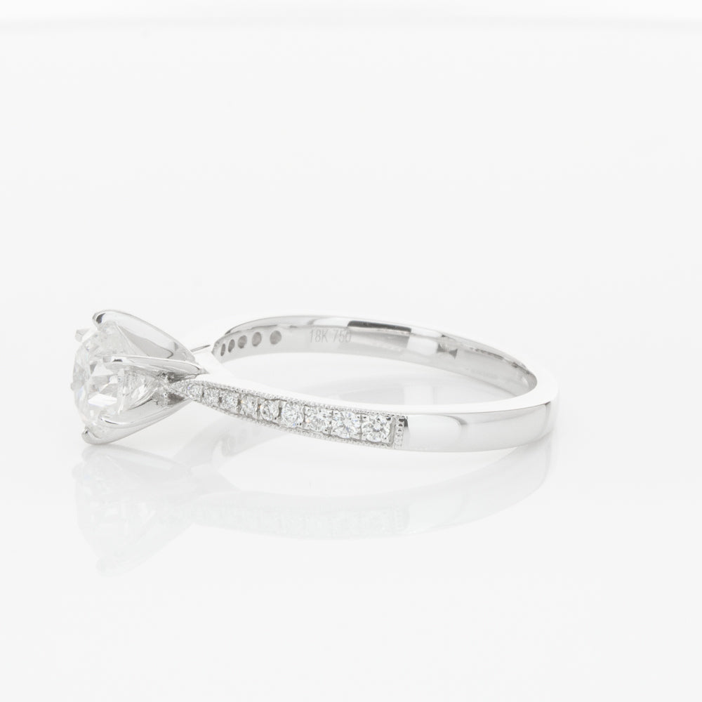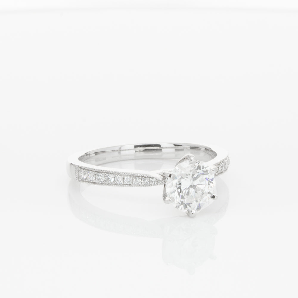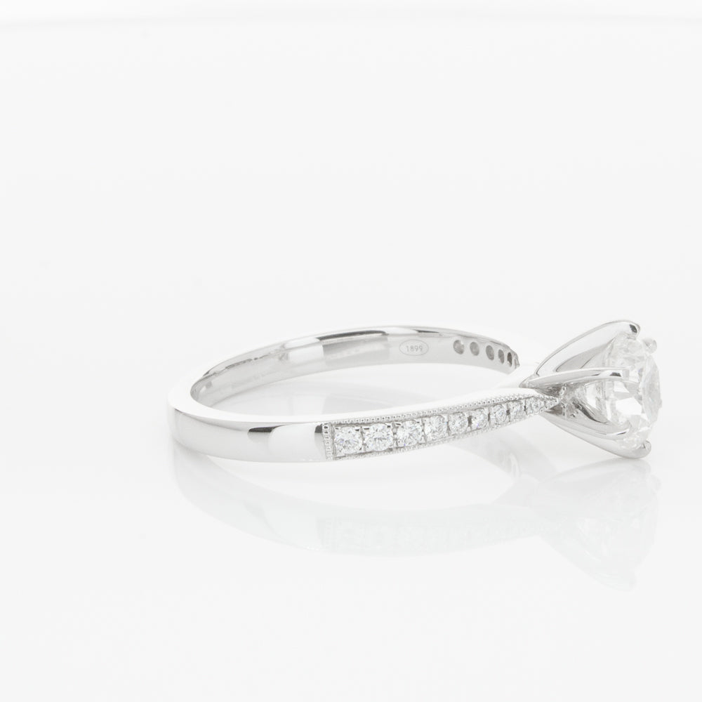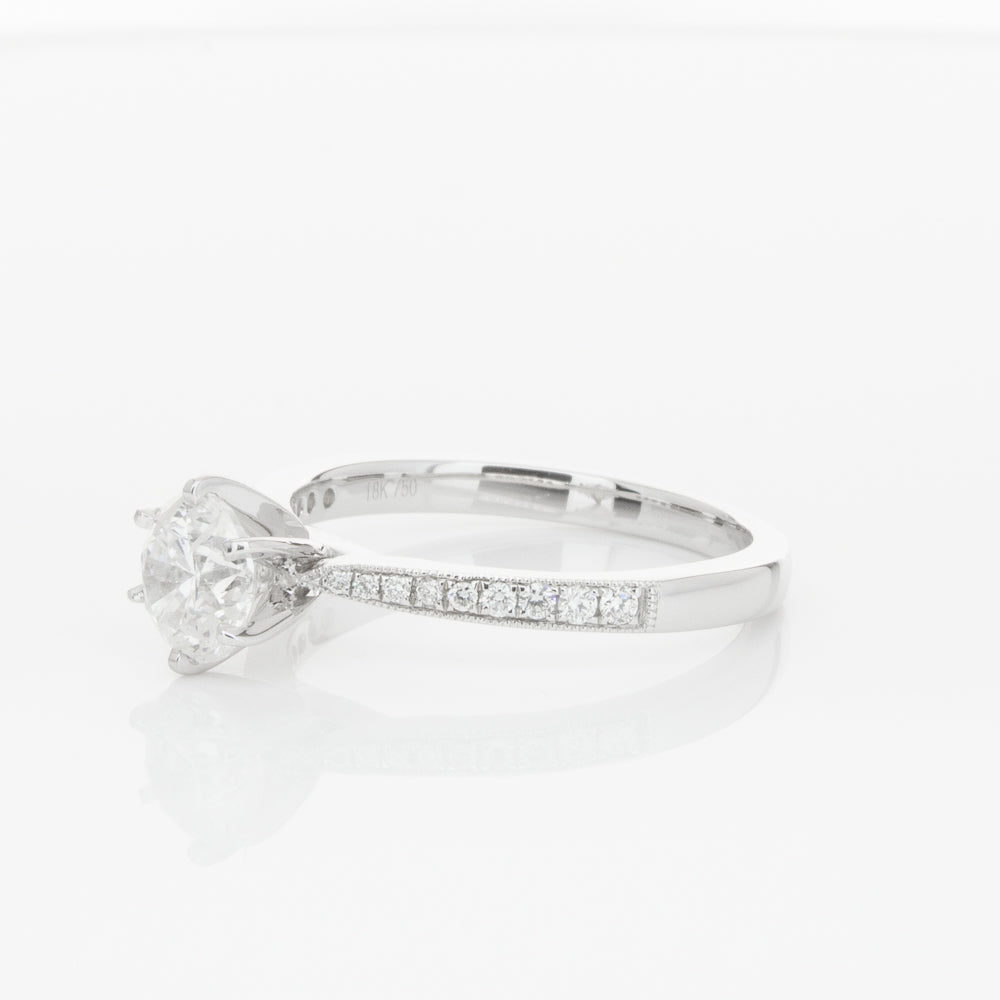 A delicate diamond set band with milgrain detailing, tapers towards the zenith to showcase a sparkling diamond.