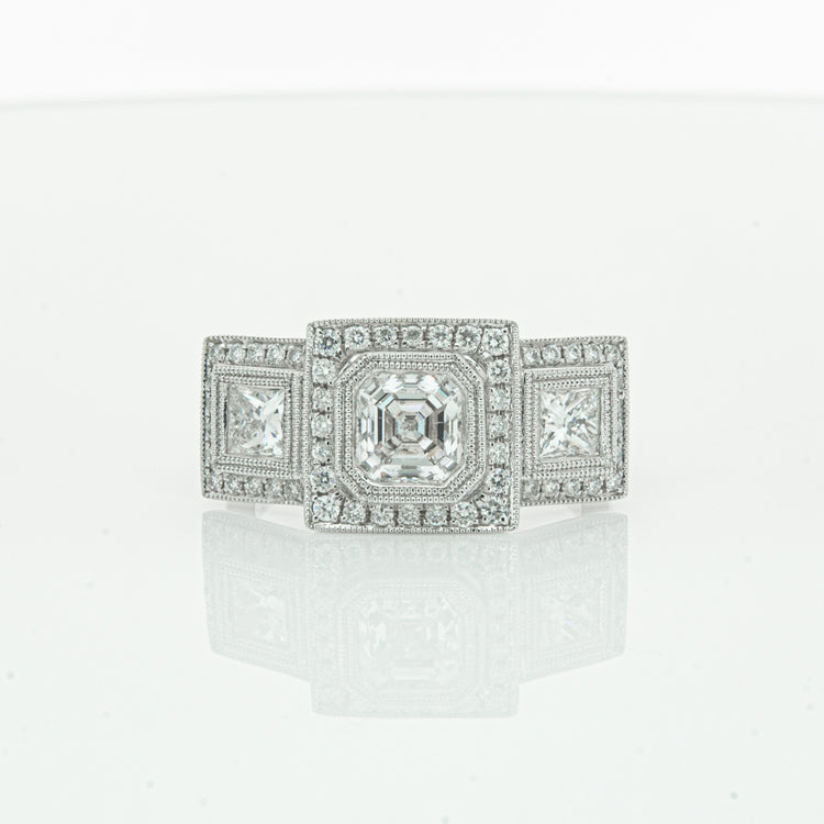Triple the sparkle! This glittering diamond ring features an exceptional square emerald cut centre diamond resting in a raised millgrain setting. Twinkling princess cut diamonds frame this spectacular diamond on either side, surrounded by shimmering round brilliant cut square clusters!