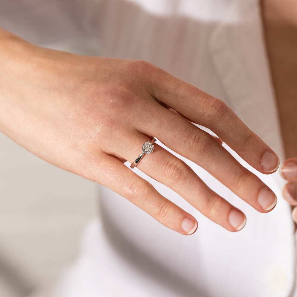 Our brightest star. Nova represents our vision of the quintessential engagement ring. It simply asks, “will you marry me?” Perfected through decades of refinement, the gently rounded shoulders softly taper leading to a finely balanced six claw rex setting securing your YES.