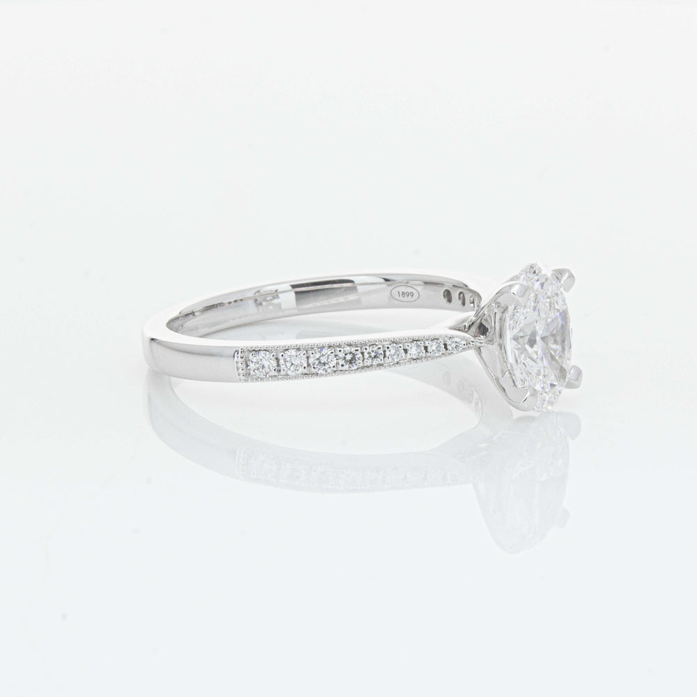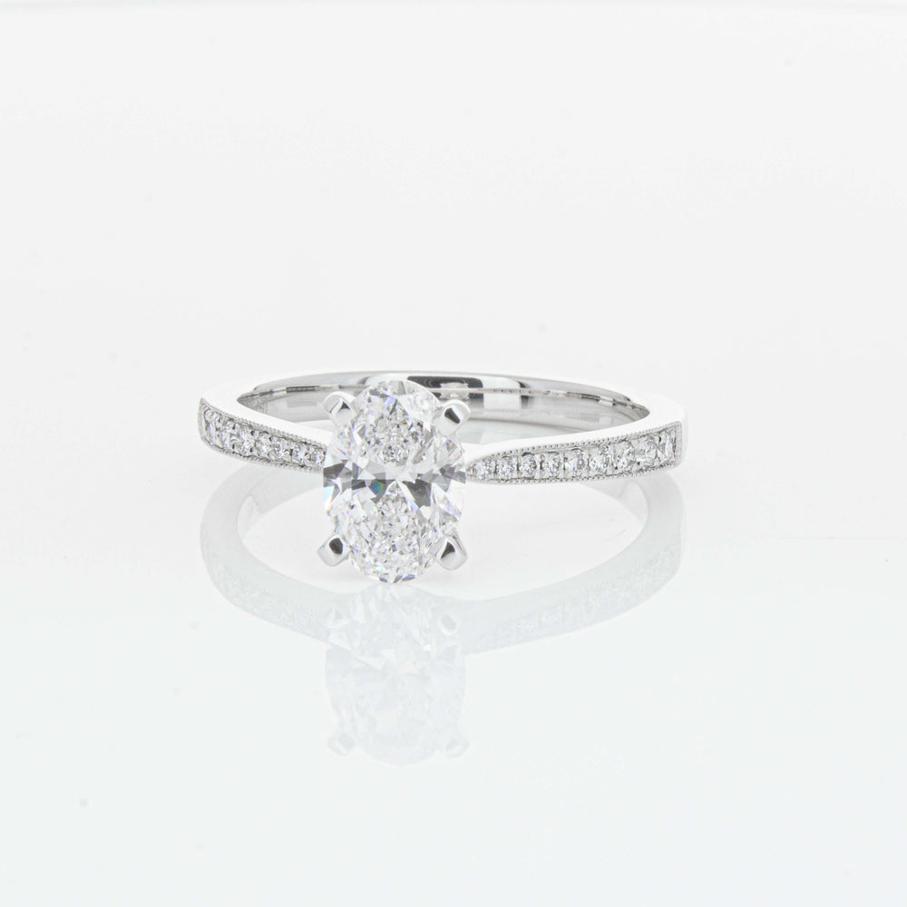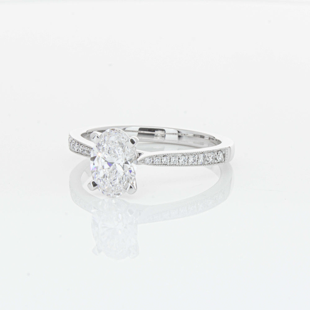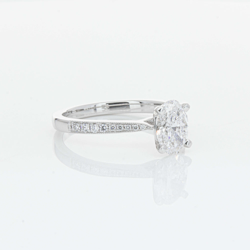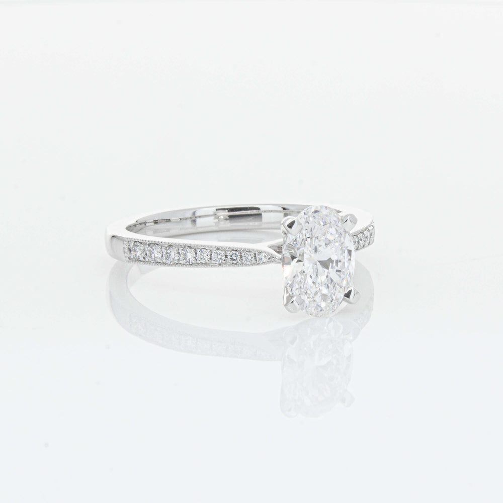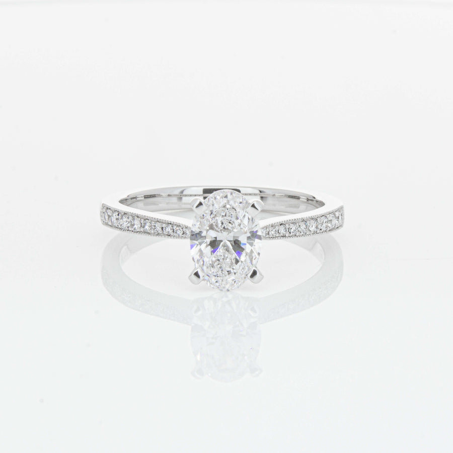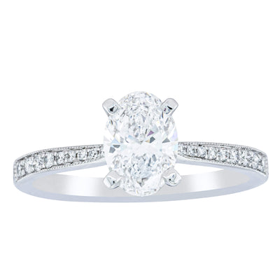 A delicate diamond set band with milgrain detailing, tapers towards the zenith to showcase a sparkling diamond.