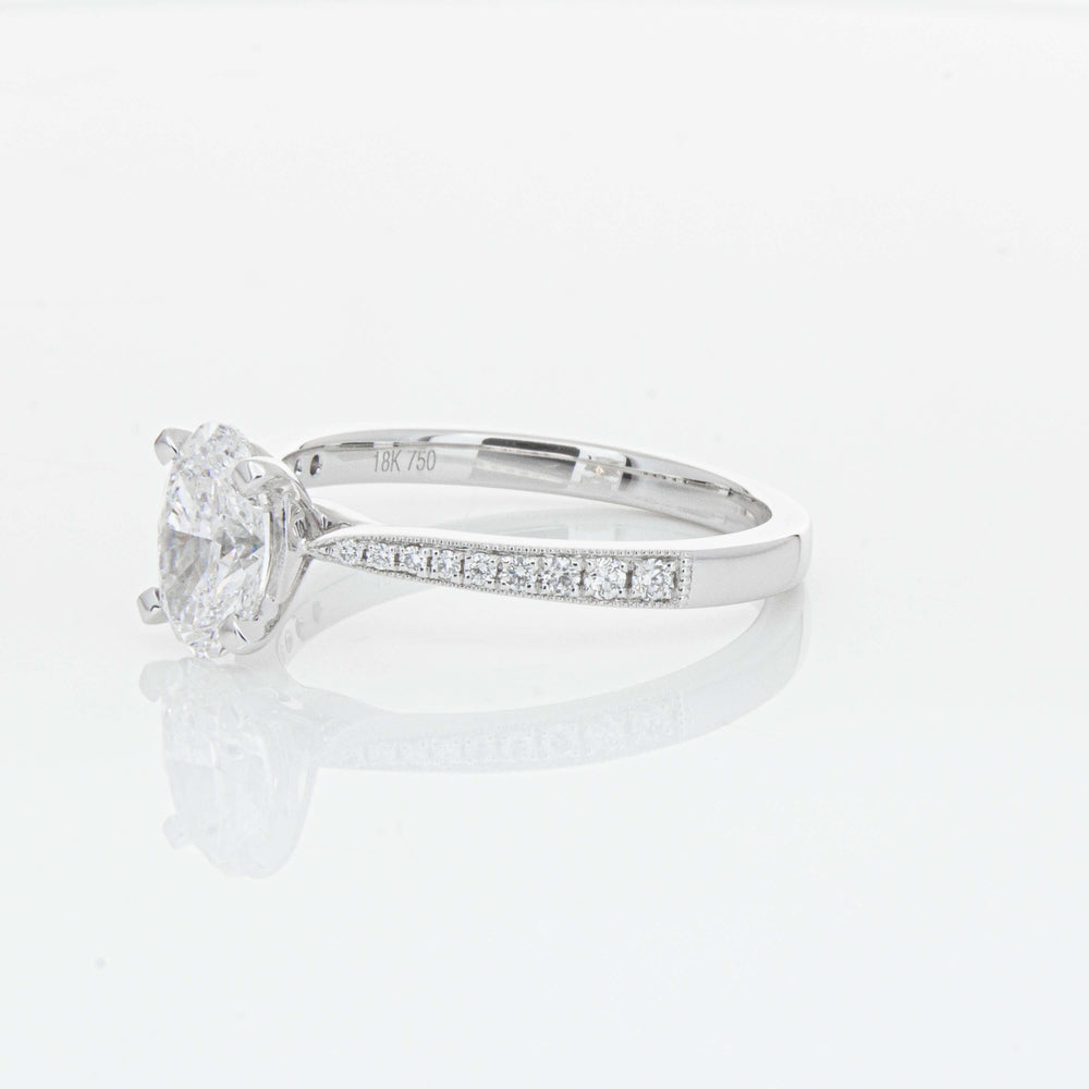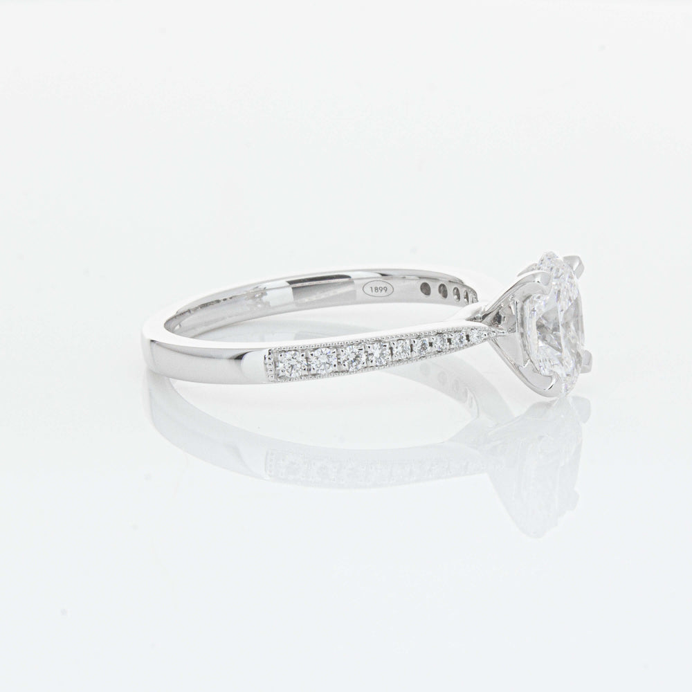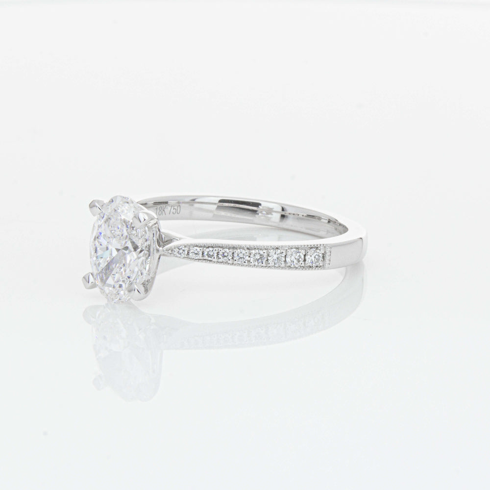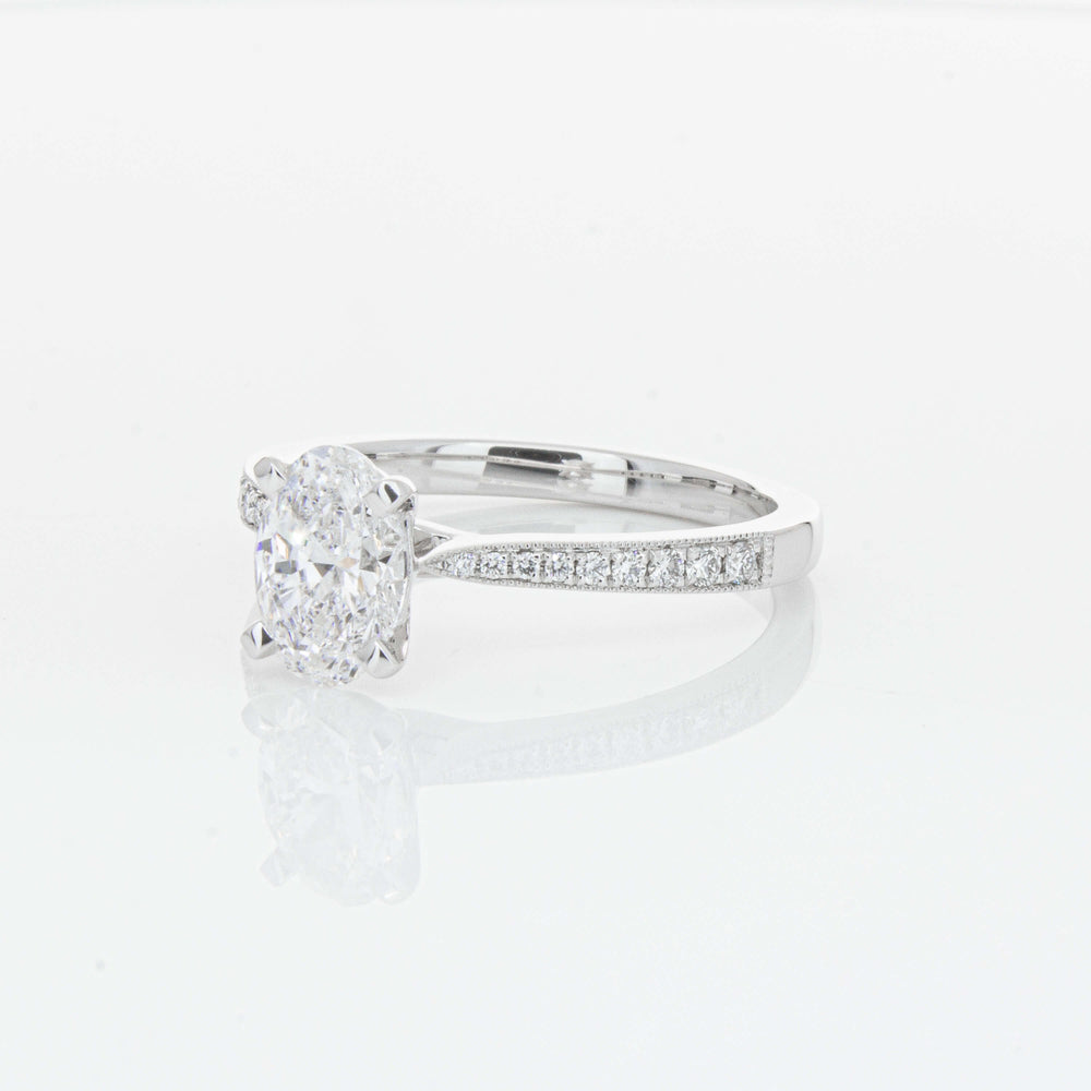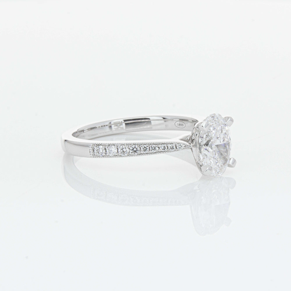 A delicate diamond set band with milgrain detailing, tapers towards the zenith to showcase a sparkling diamond.