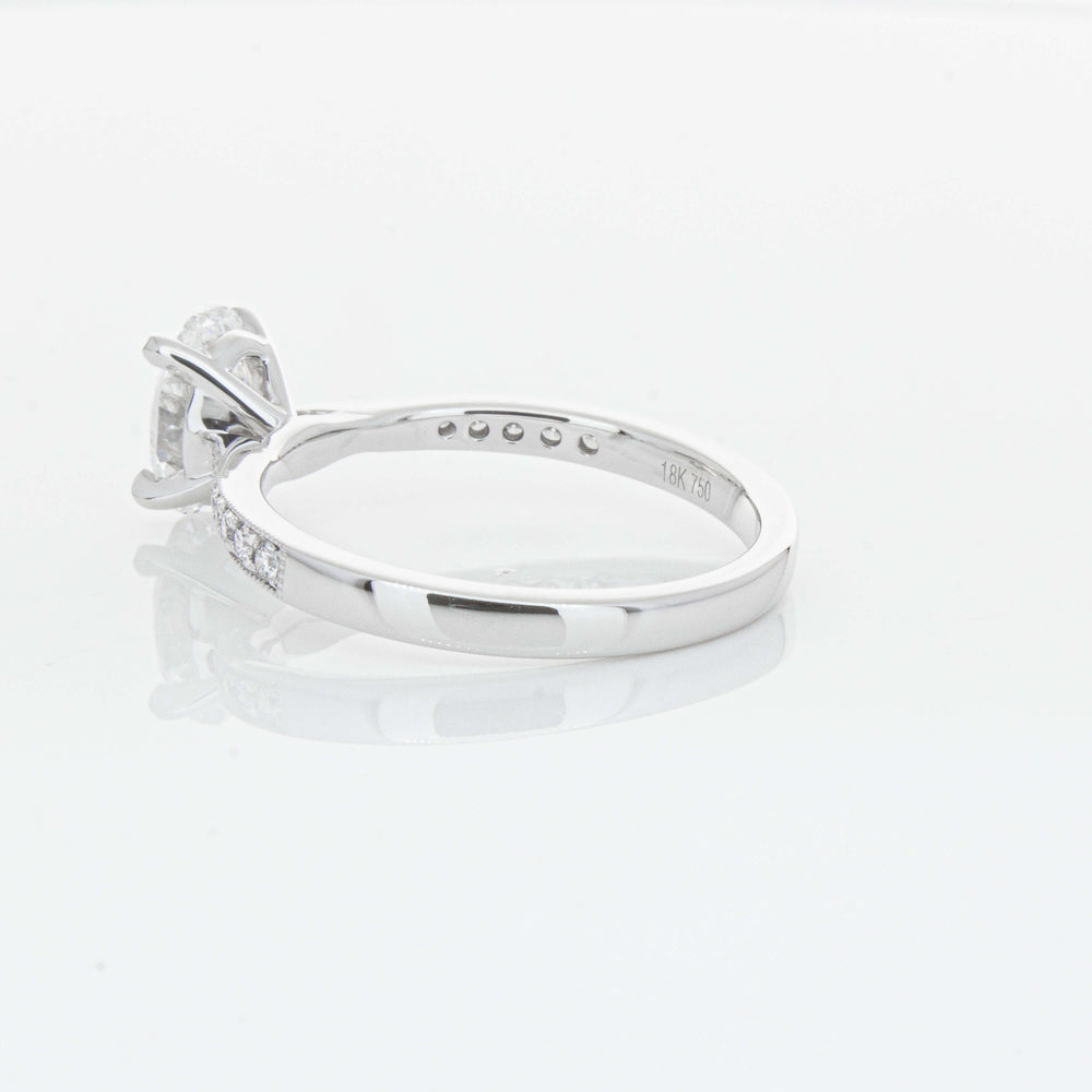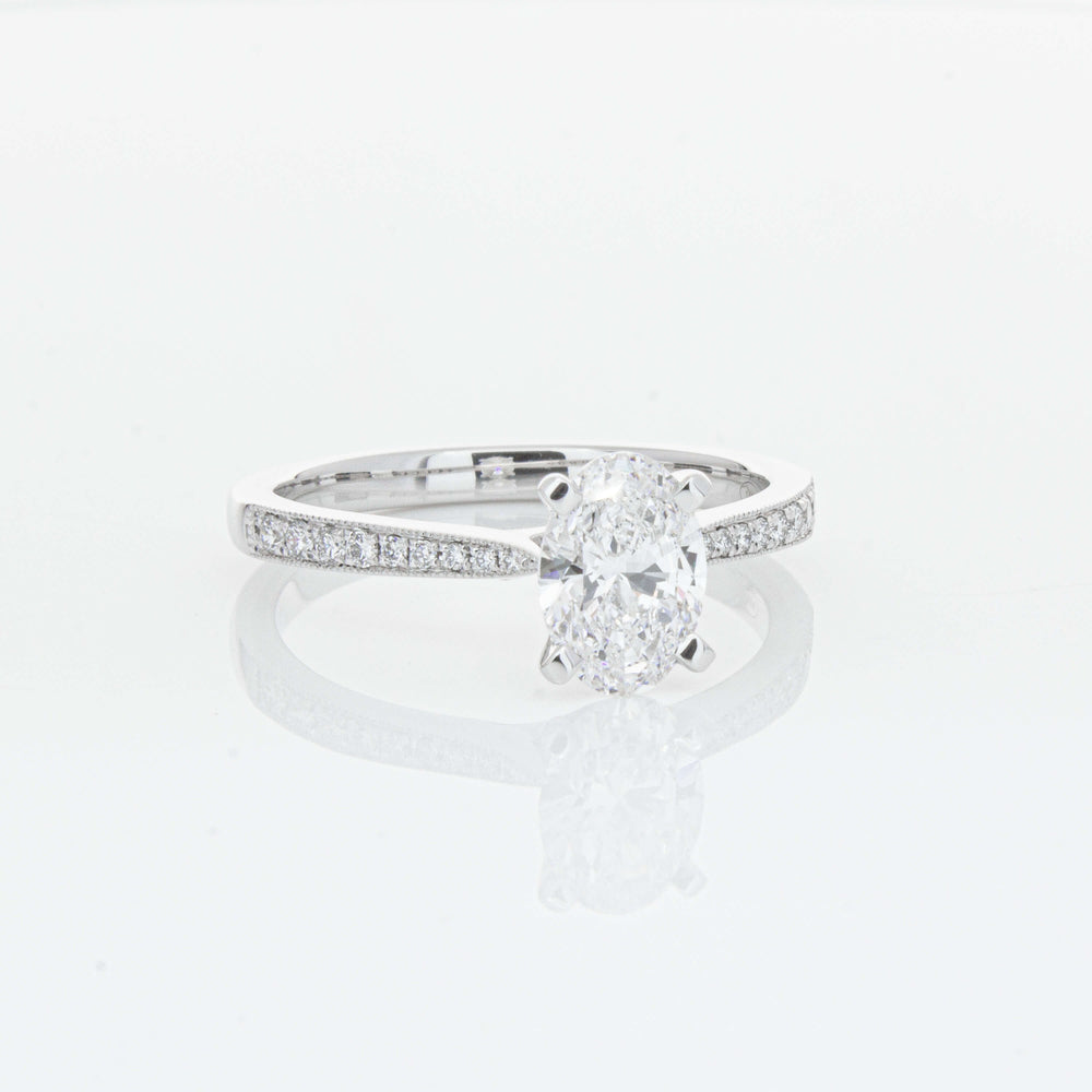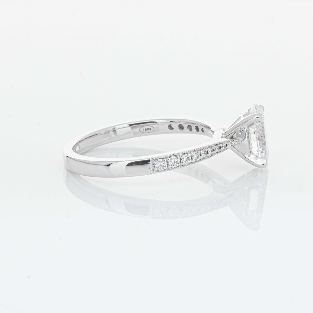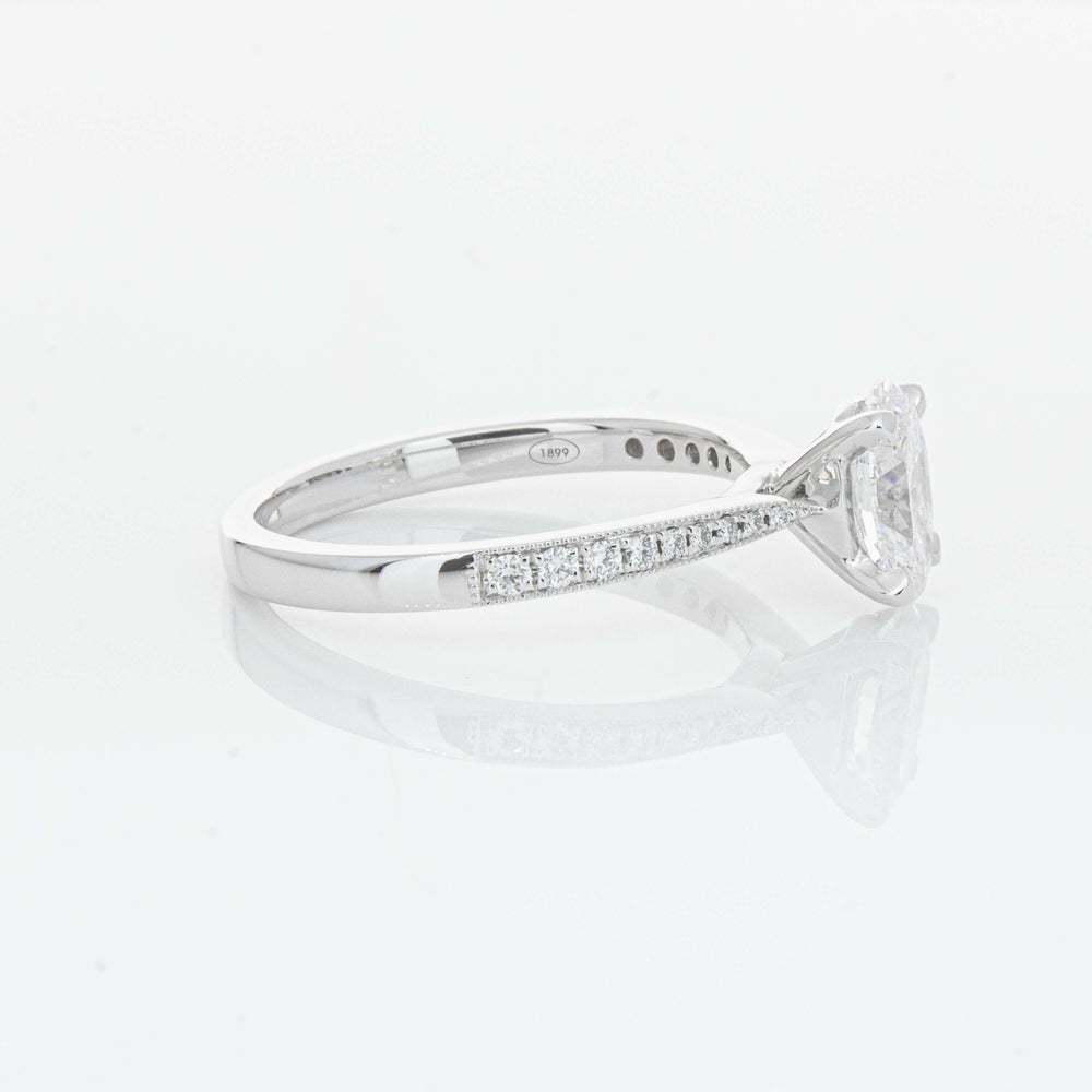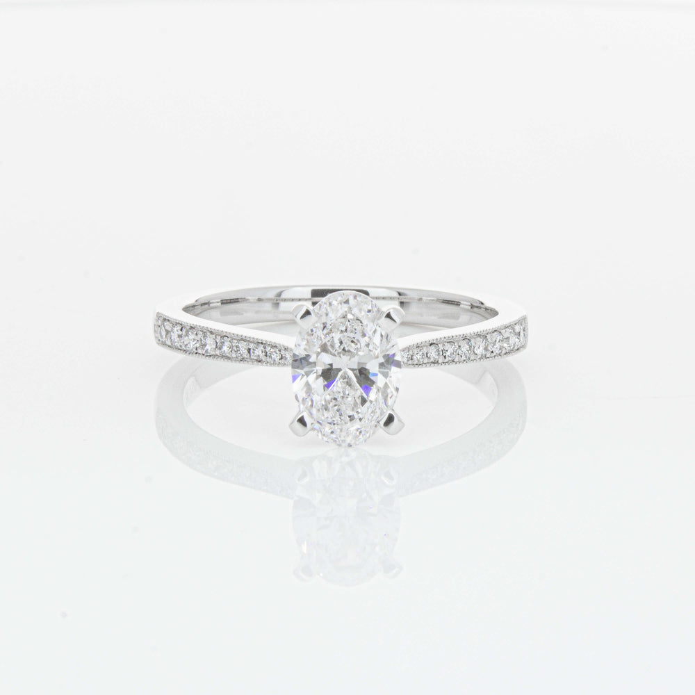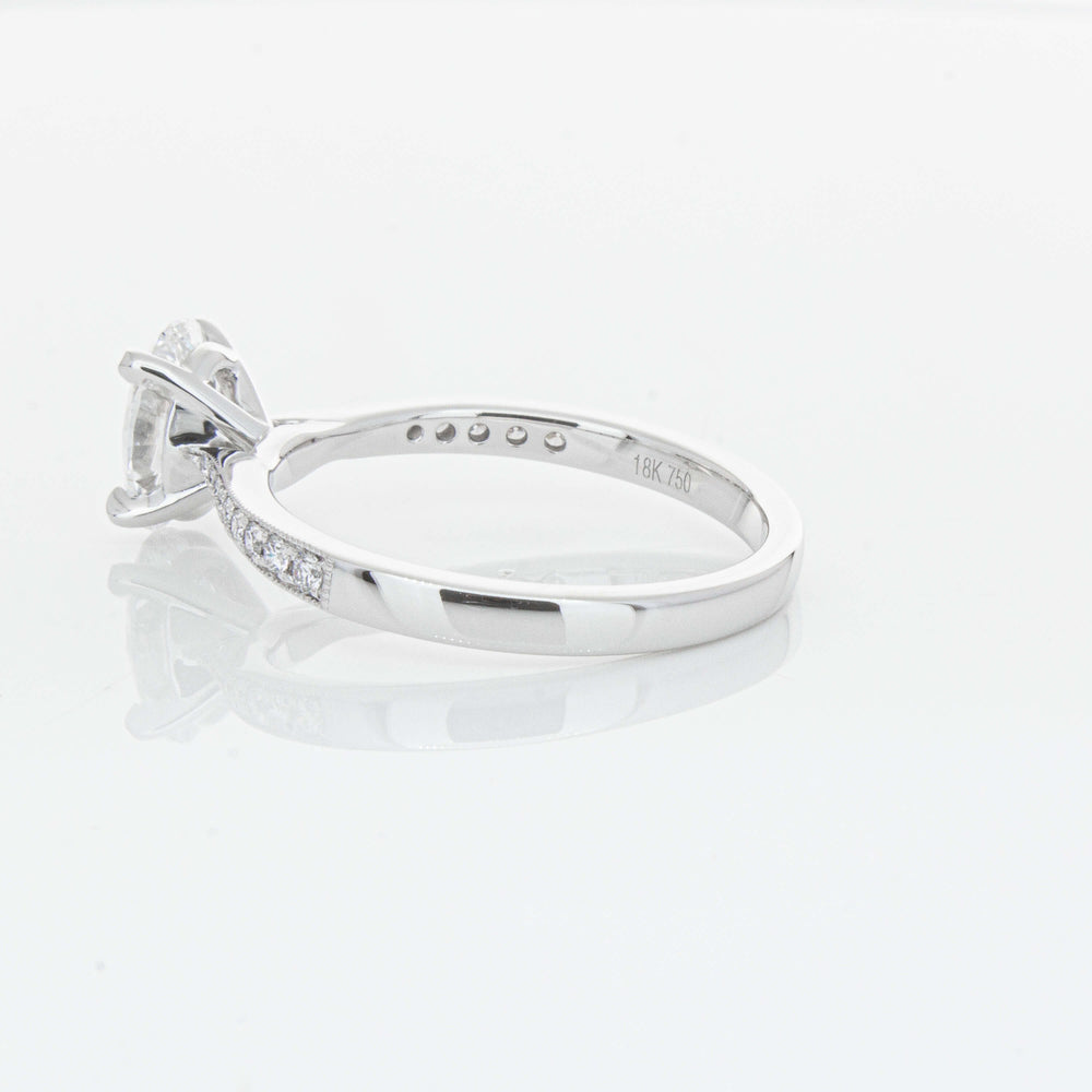 A delicate diamond set band with milgrain detailing, tapers towards the zenith to showcase a sparkling diamond.