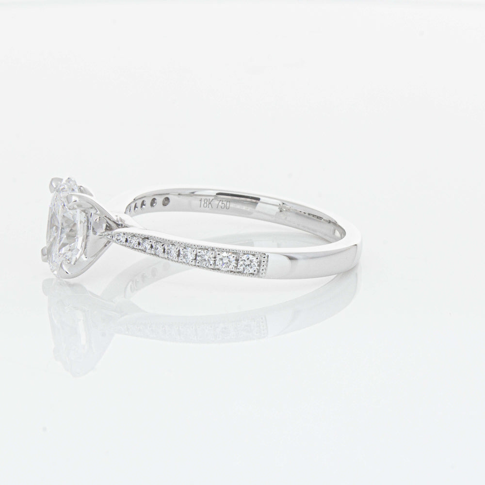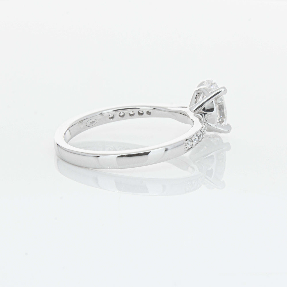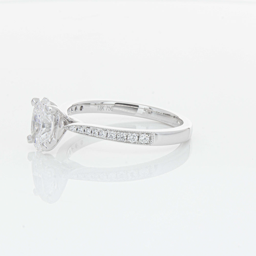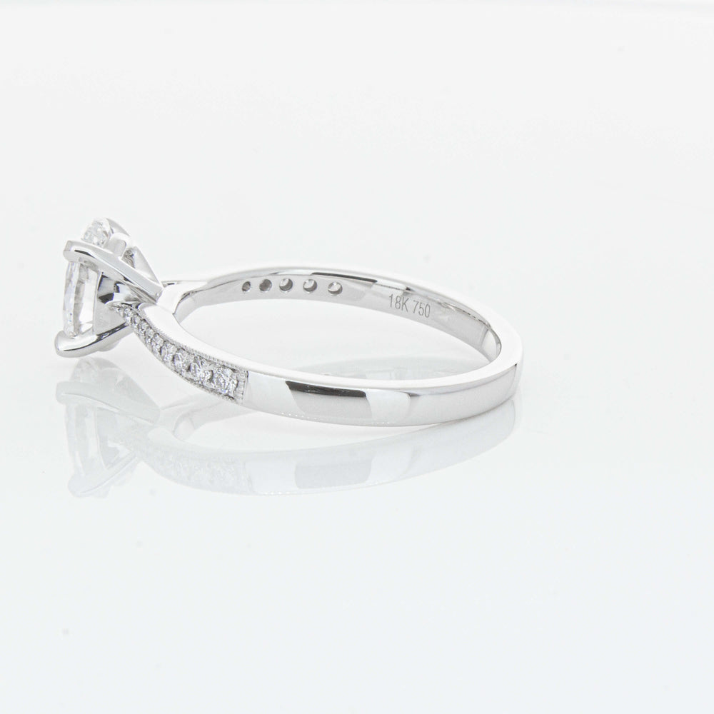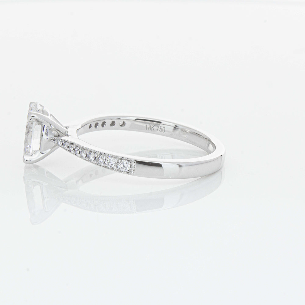 A delicate diamond set band with milgrain detailing, tapers towards the zenith to showcase a sparkling diamond.