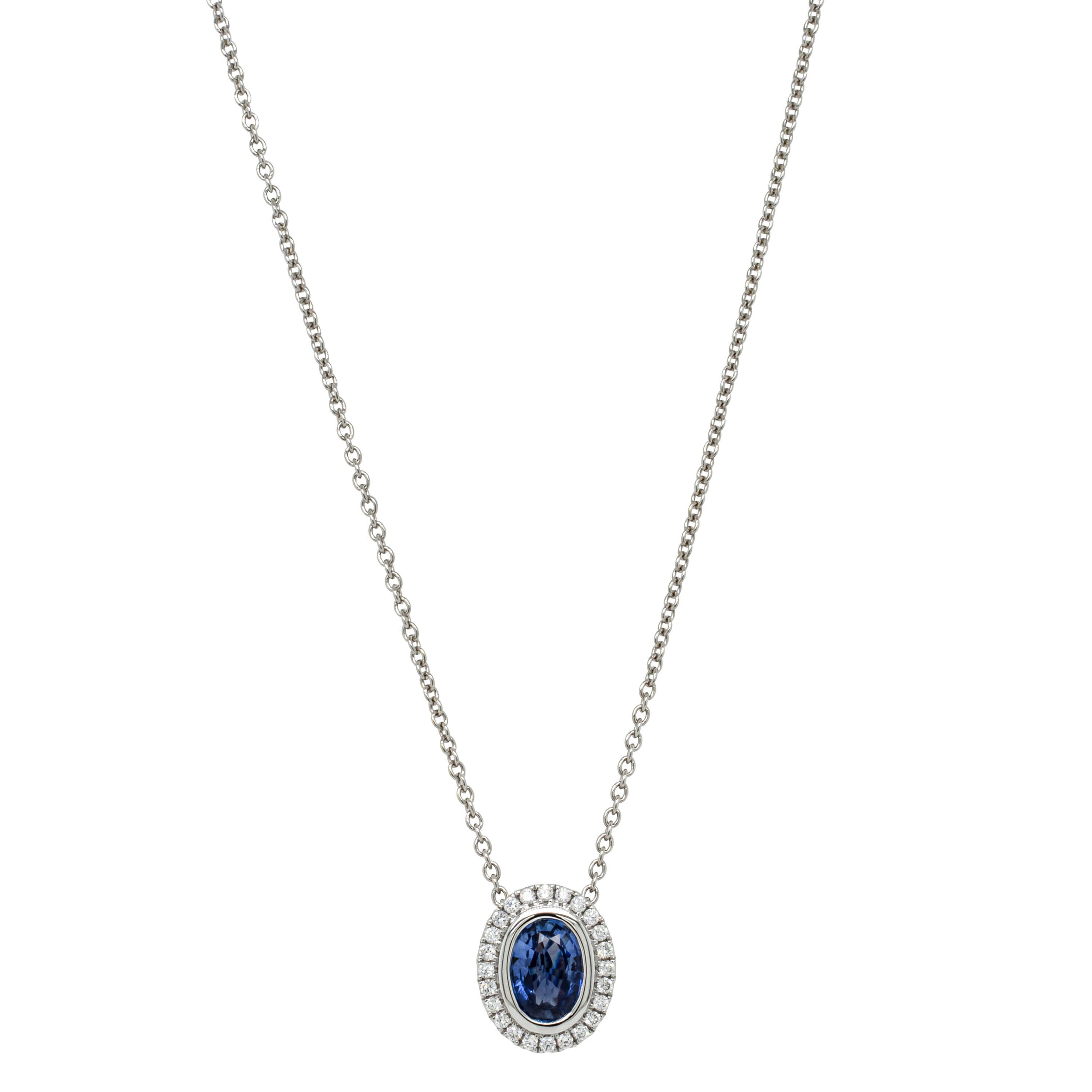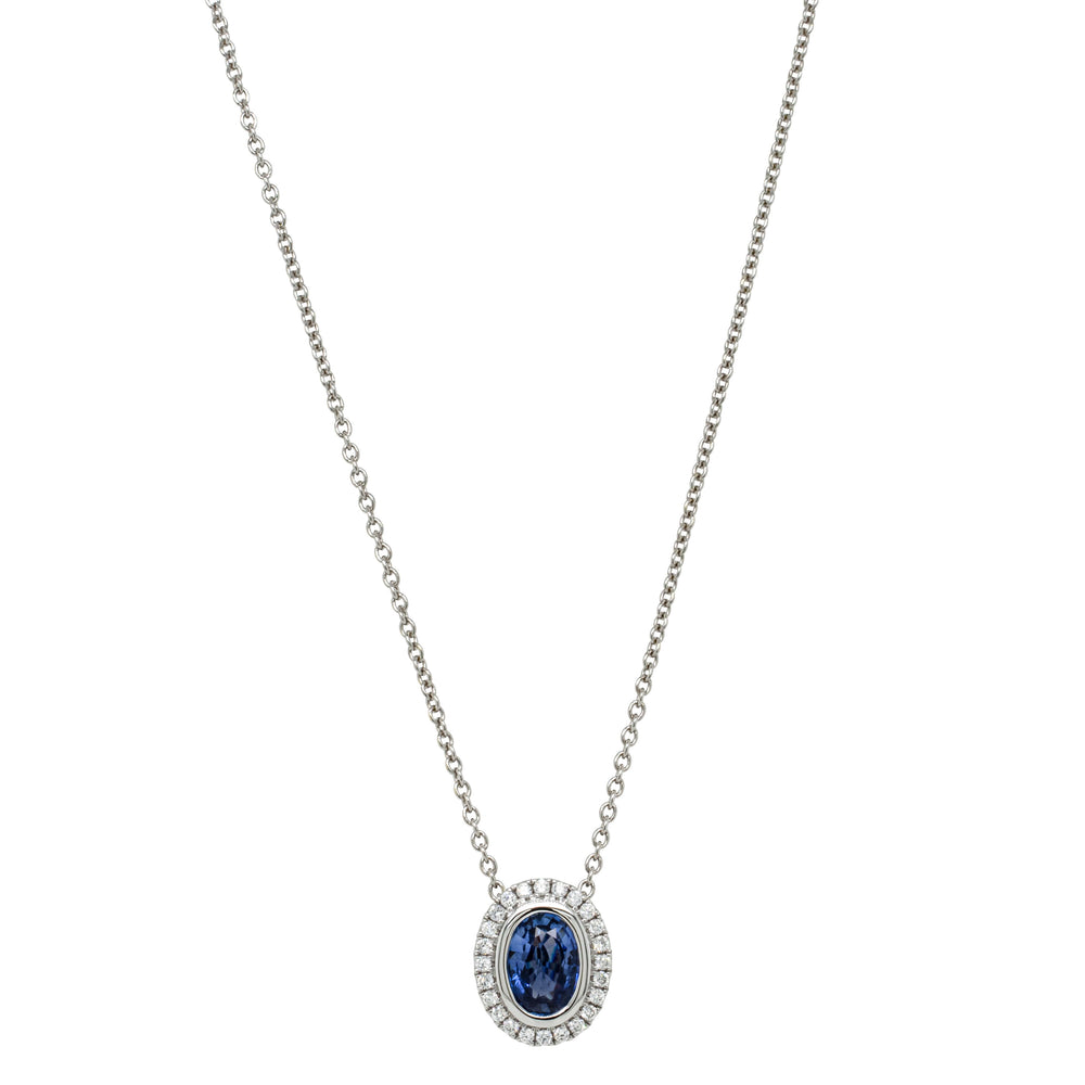 Isla - a beautiful addition to our signature 1899 collection. Elegant in every way, this sapphire and diamond pendant features a single oval faceted sapphire framed by 24 bead set round brilliant cut diamonds in our 18ct white gold.