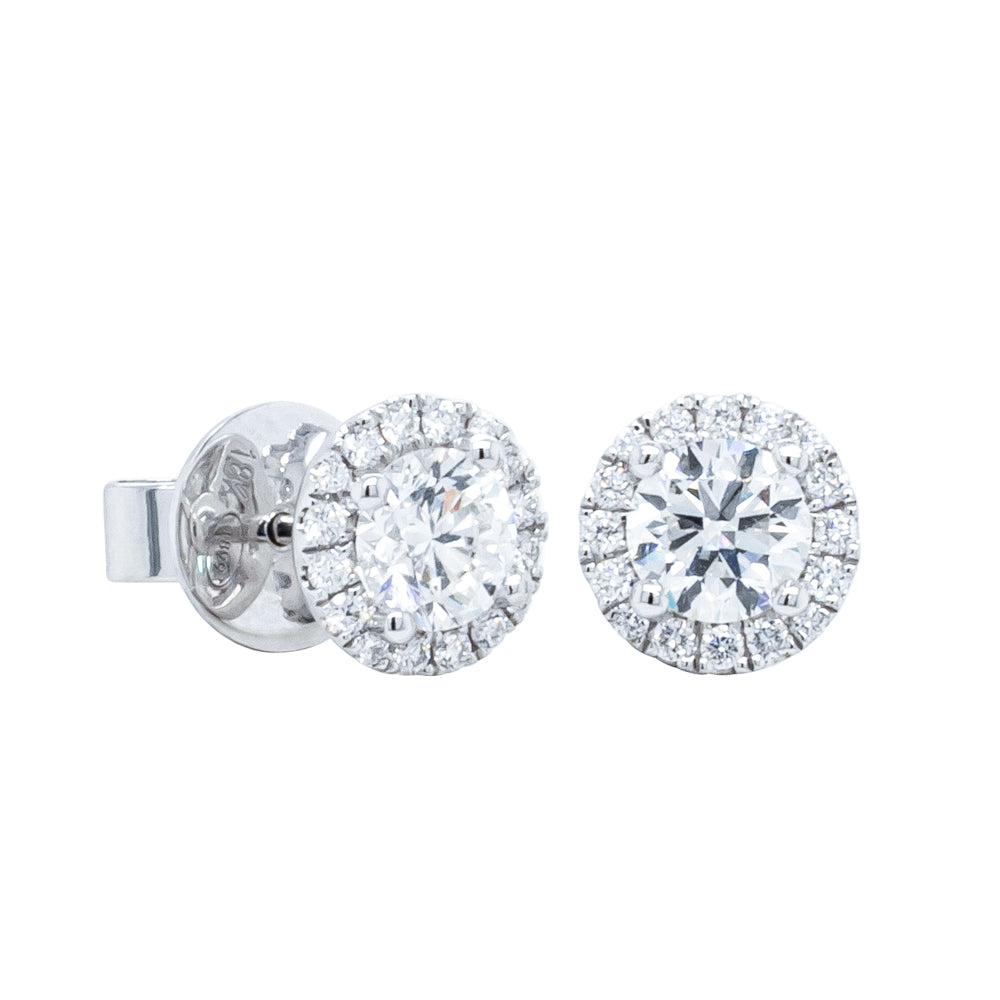 These stunning diamond halo earrings are crafted in 18ct white gold from our signature 1899 collection. They boast two centre diamonds framed by a delicate halo of sparkling round brilliant cut diamonds.  Secured with our specialty 1899 post and butterfly fittings.