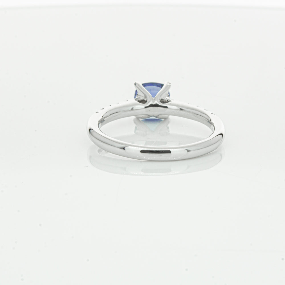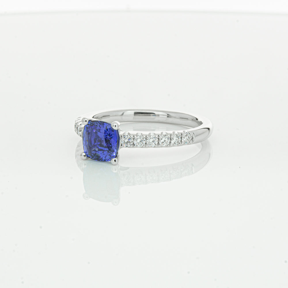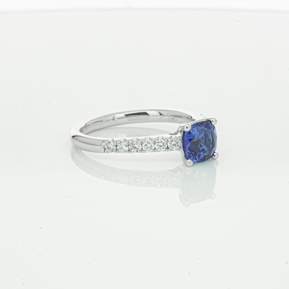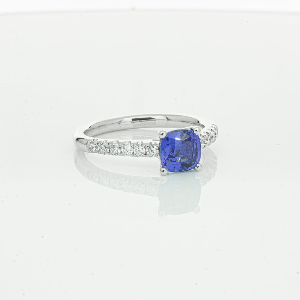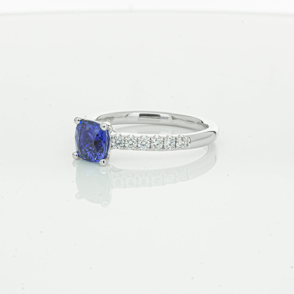 18ct white gold Meridien ring, featuring a 1.21ct cushion cut sapphire from Sri Lanka with diamond set shoulders.