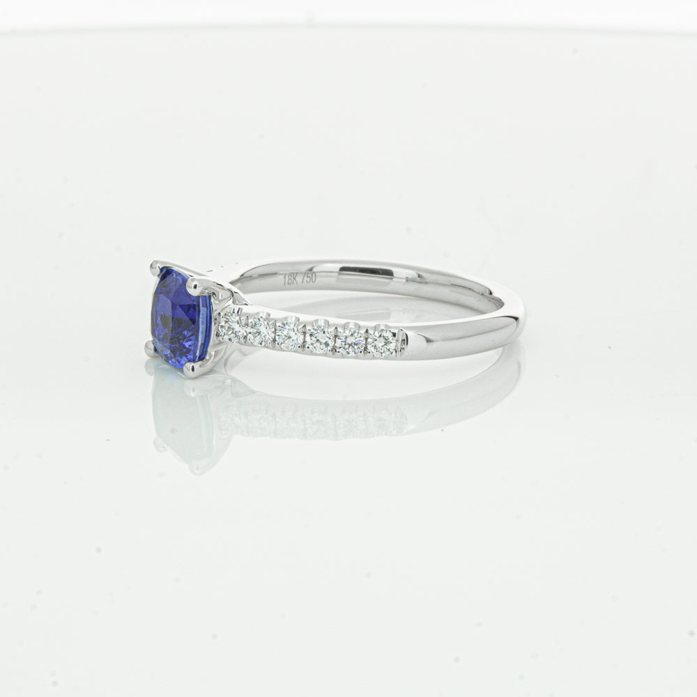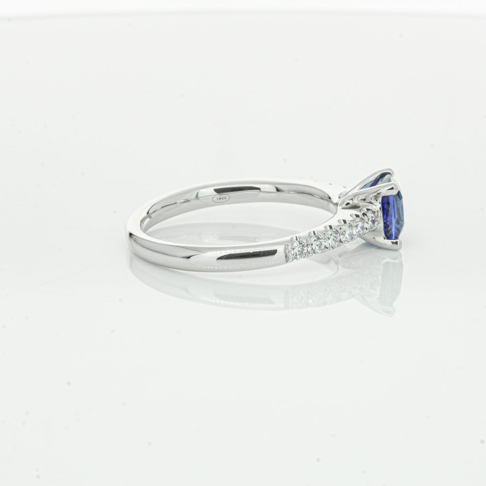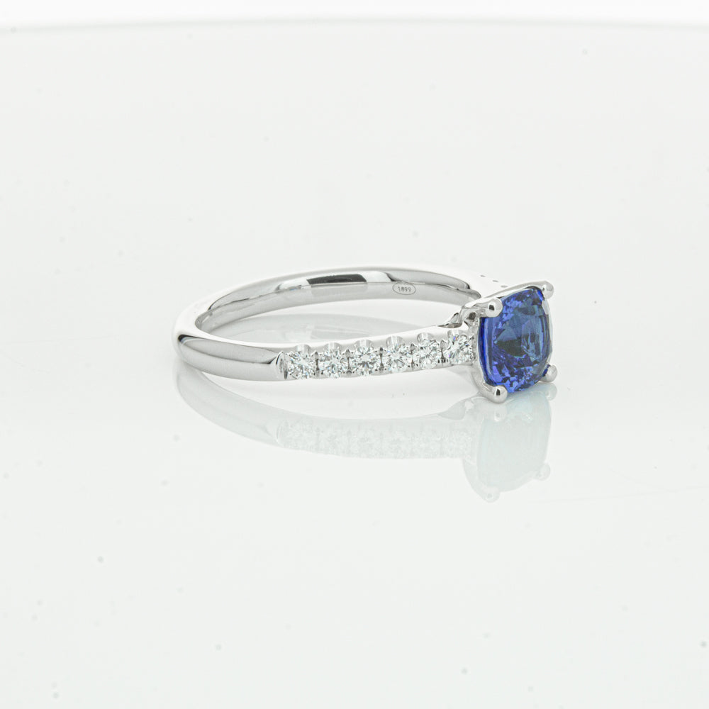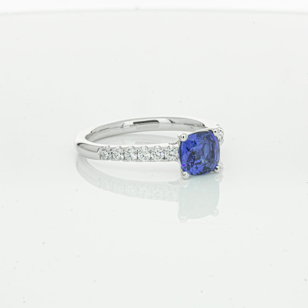 18ct white gold Meridien ring, featuring a 1.21ct cushion cut sapphire from Sri Lanka with diamond set shoulders.
