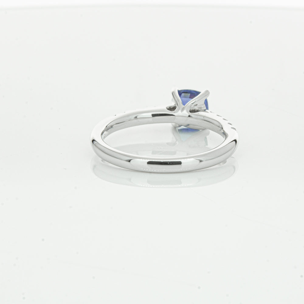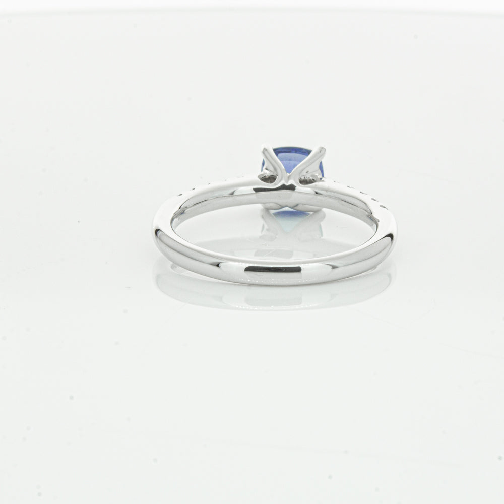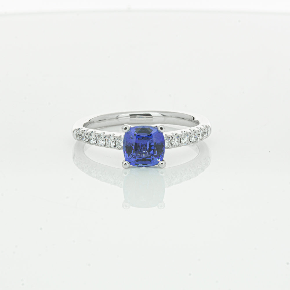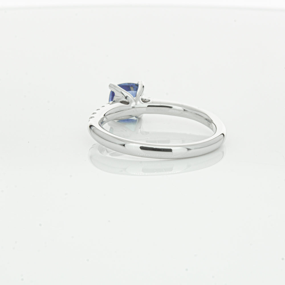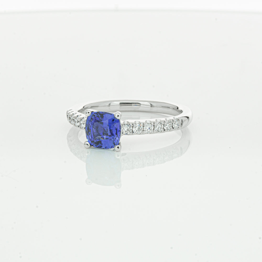 18ct white gold Meridien ring, featuring a 1.21ct cushion cut sapphire from Sri Lanka with diamond set shoulders.